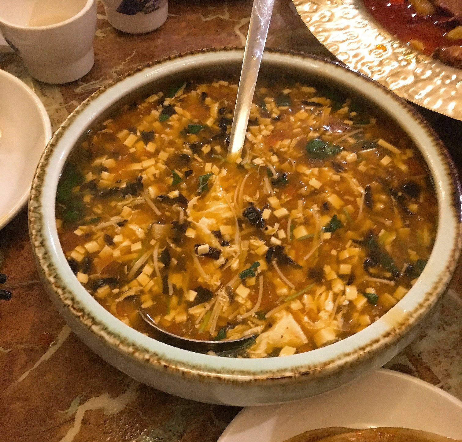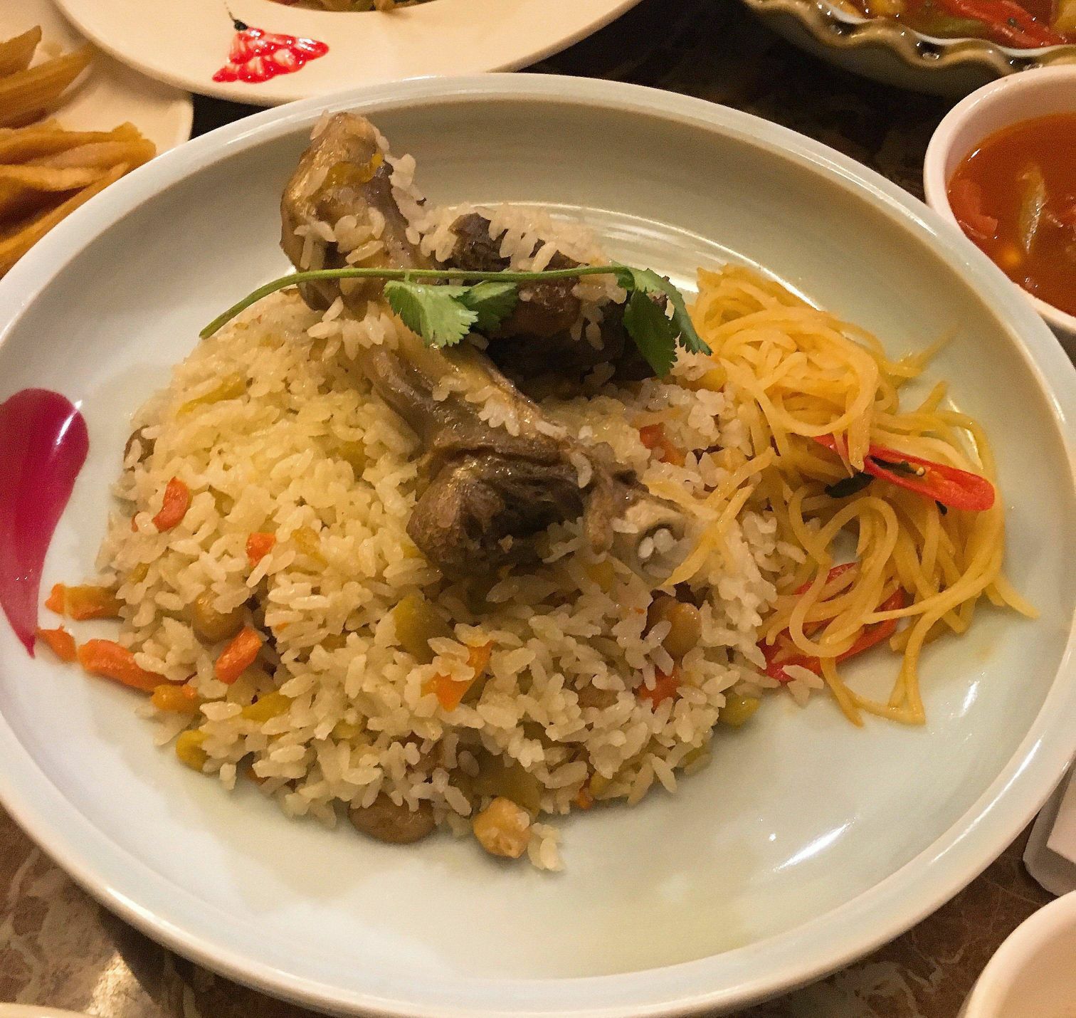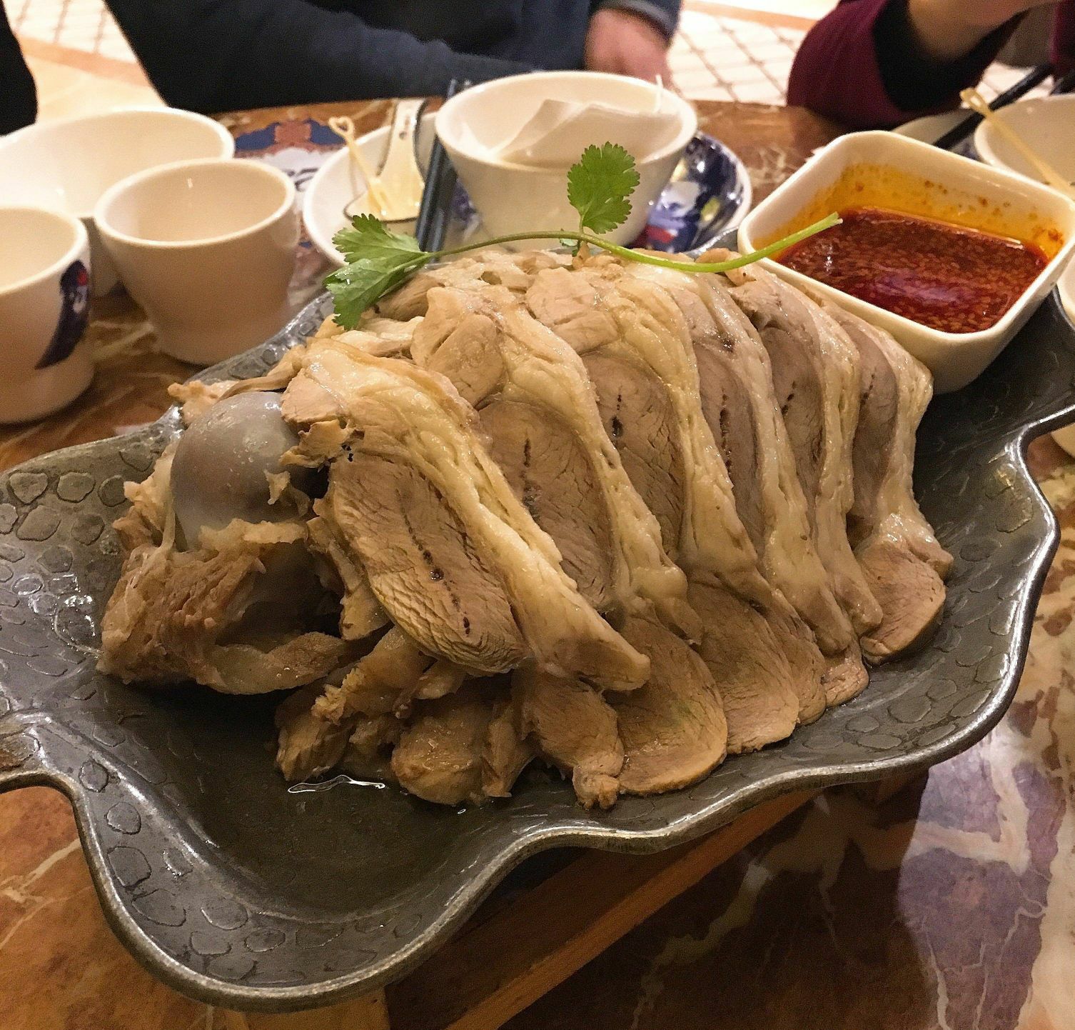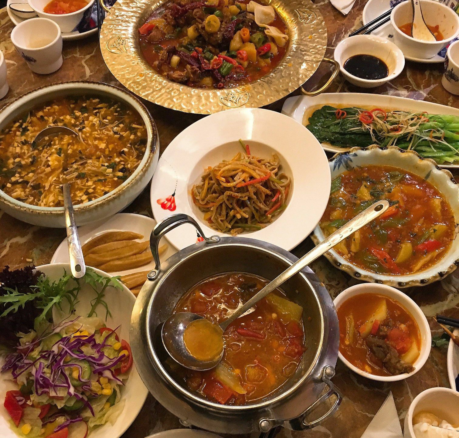 北疆饭店(天一广场店) 天一广场碶闸街98-2号 「北疆特色羊肉串」羊肉串选了微辣的还是有点辣,不过羊肉很香,好吃! 「新疆大盘鸡」真的很大一盘呀,里面是鸡肉块和土豆块,都比较大块,还有几片面片儿,蘸着汤汁还挺好吃的,量比较足。 「酸奶哈密瓜」用哈密瓜的壳装着,里面是挖成小球的哈密瓜果肉,上面淋了酸奶,撒了葡萄干,酸酸甜甜很好吃,爽口。 「新疆大拌菜」就类似于蔬菜沙拉吧,里面有黄瓜玉米紫甘蓝包菜等等,比较清爽。 「手抓羊肉」很爱吃的一道菜啦,羊肉肥瘦适中,膻味不重,蘸着酱料吃好吃。 「番茄牛腩」本场最佳!酸酸甜甜的番茄汤汁,牛腩也不会咬不动,总的来说很好吃。 「新疆奶茶」咸的甜的都喝了,第一次和咸奶茶,奶味比甜的重一点,挺好喝的。