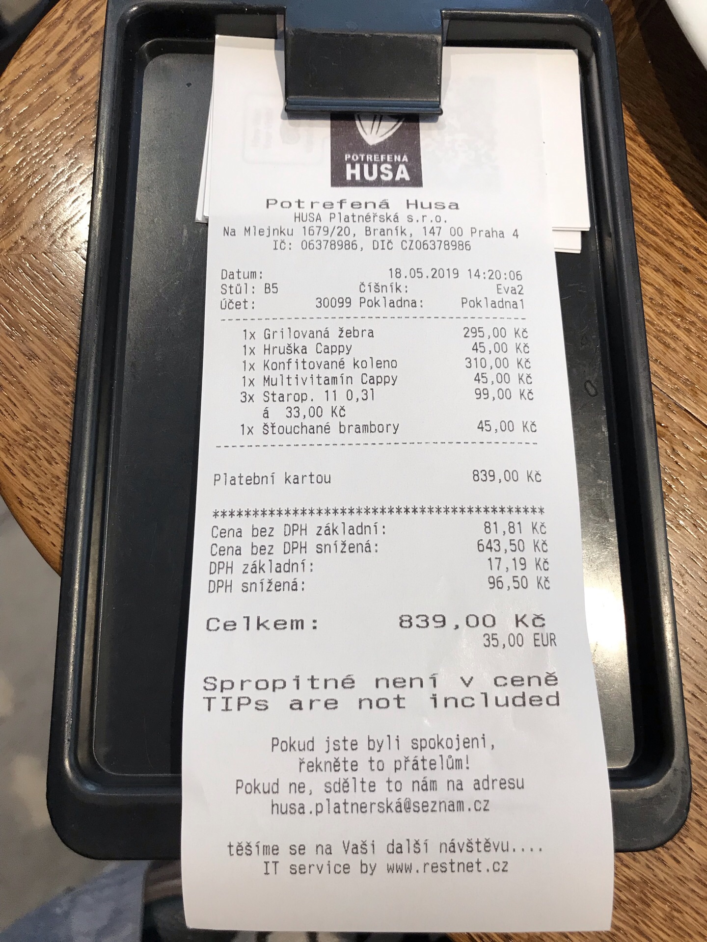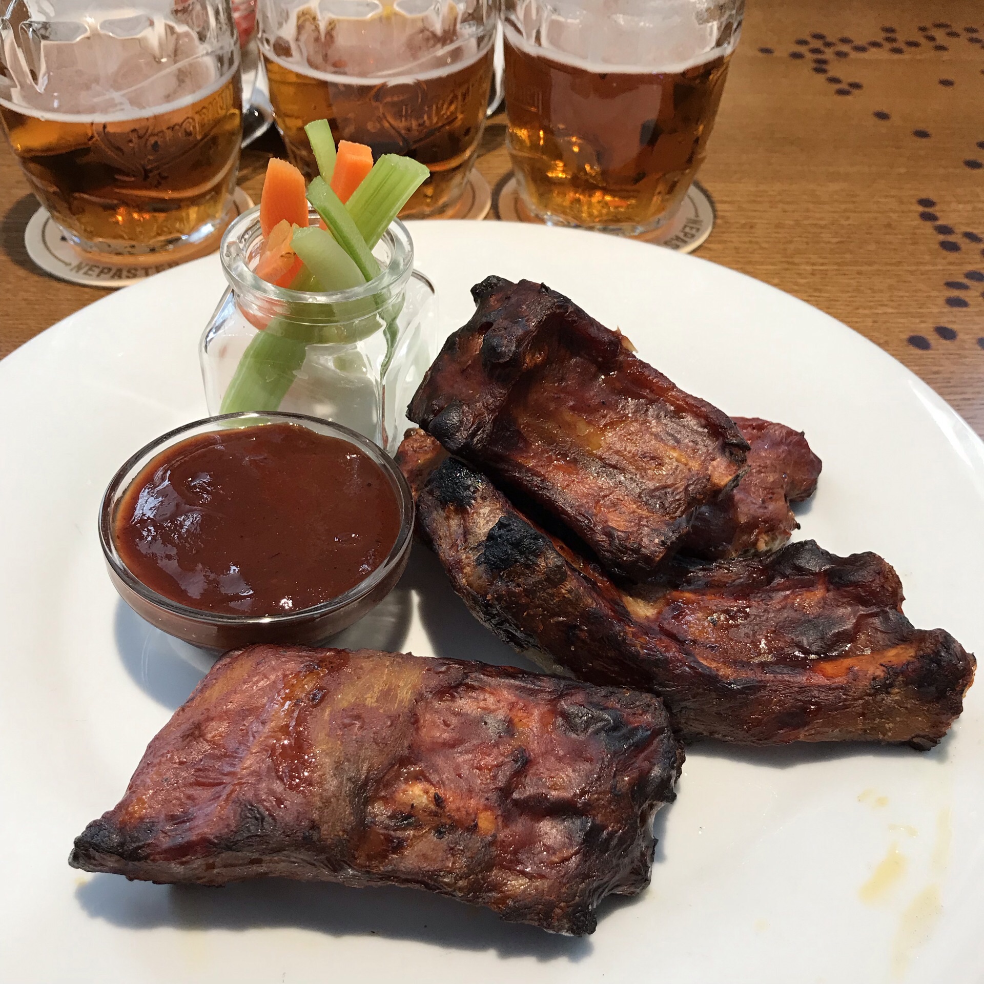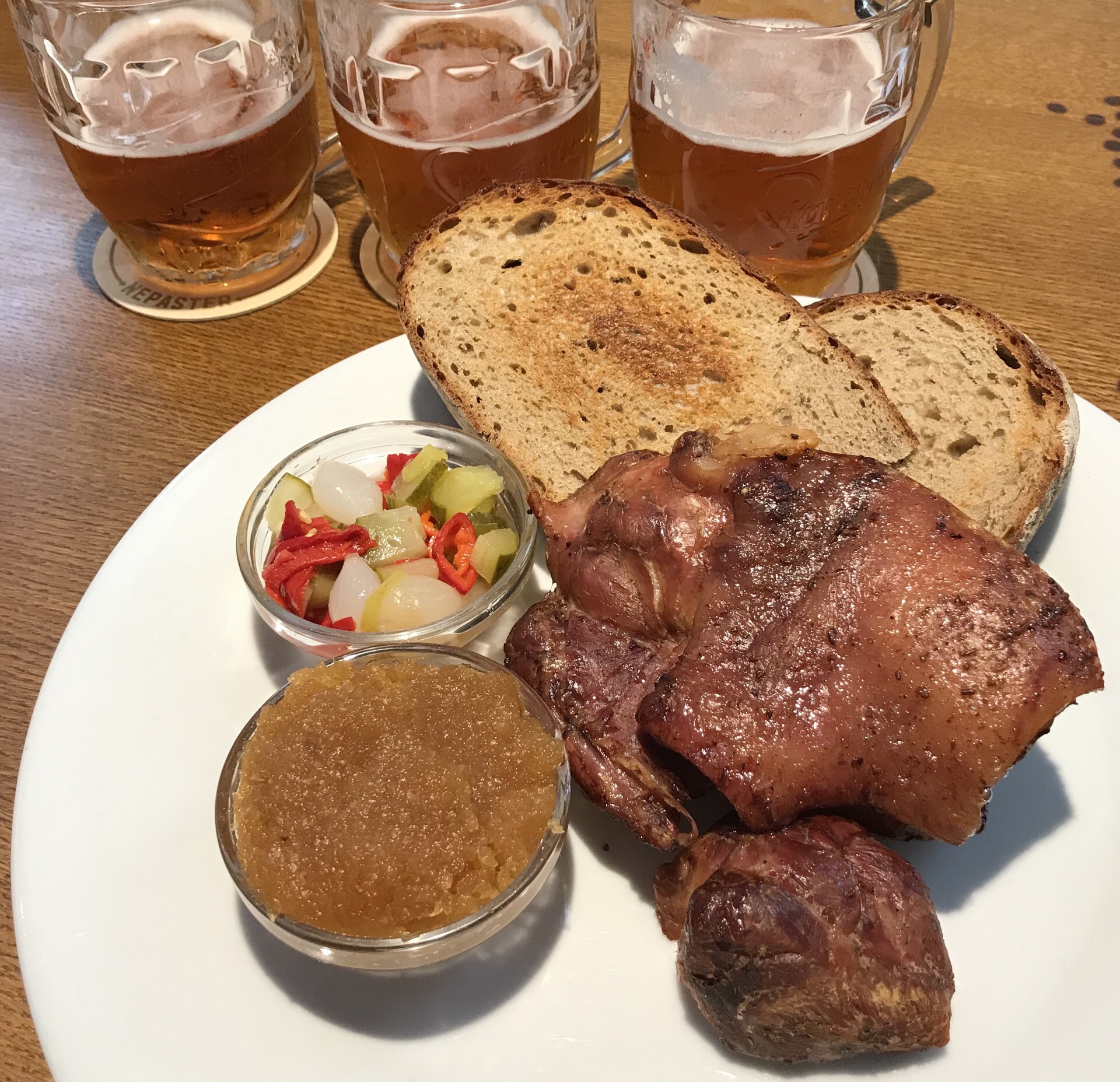 布拉格民宿老板推荐的一家当地人都去的本土菜餐厅,不是跳舞房子这家,是离市图书馆很近的那家。 烤肘子,310克朗,约一斤的纯肘子肉,配两种调味料,橙味蒜泥和各种腌料碎,肘子皮不腻,瘦肉很多也不老,肘子本身有微微的咸味,沾调料另有一番滋味,尤其橙味泥,味甜,可以试试。另外配两大片全麦面包。 烤猪肋排,295克朗,4块,甜口的,入味儿,肉比烤肘子的香,而且很容易脱骨,不沾任何料就很好吃,推荐!推荐!推荐! 土豆泥,45克朗,土豆、葱末、黄油调味,当主食很不错。 生啤,33克朗/小扎,微苦,没有比利时的好喝。 混合果汁和梨汁,45克朗一瓶,混合果汁比梨味的好喝。
