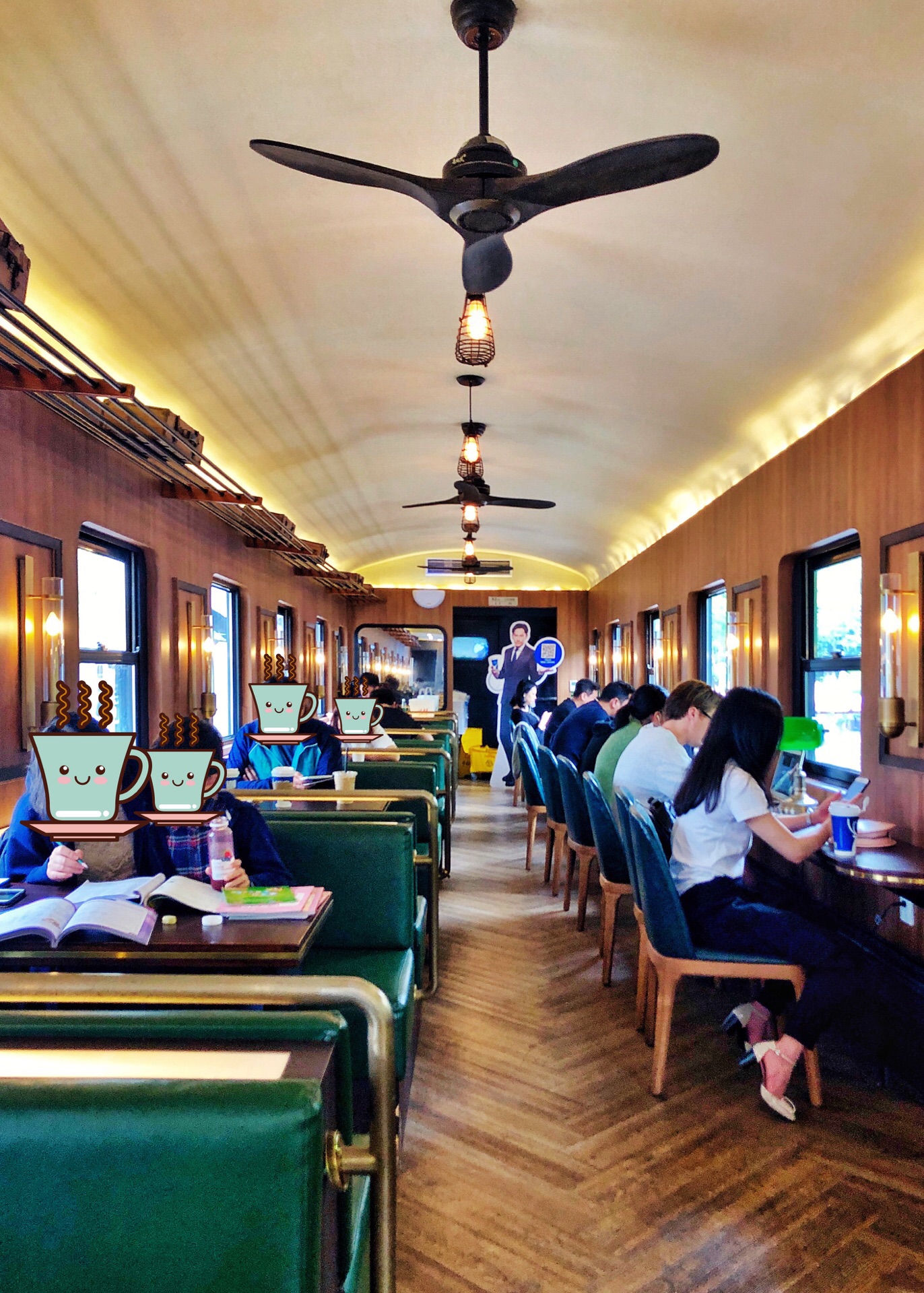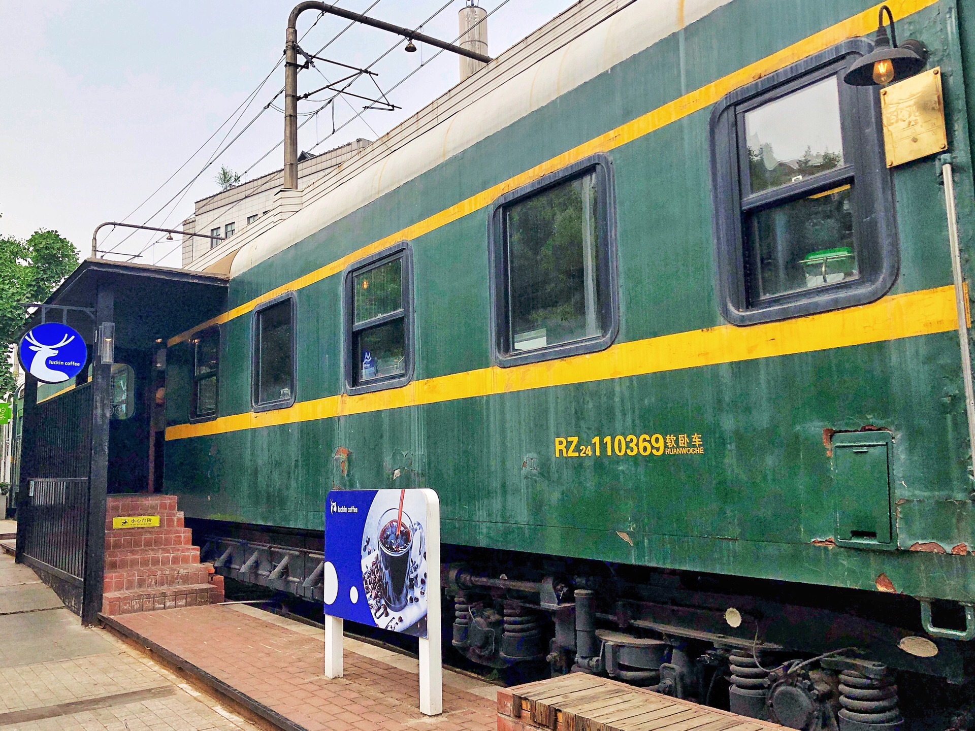大概真的是全上海颜值最高的瑞幸咖啡门店了,也不枉费我专门坐车去打卡。 咖啡品质不多作评价,真的差不多,但火车车厢的造型真是复古美貌,满分。 不过周末过去,里面基本客满,再加上朋友带着狗子,只能坐室外座位。 如果没什么人,倒是可以换上合适的衣服,来拍一组穿越时代的大片(想太多)。