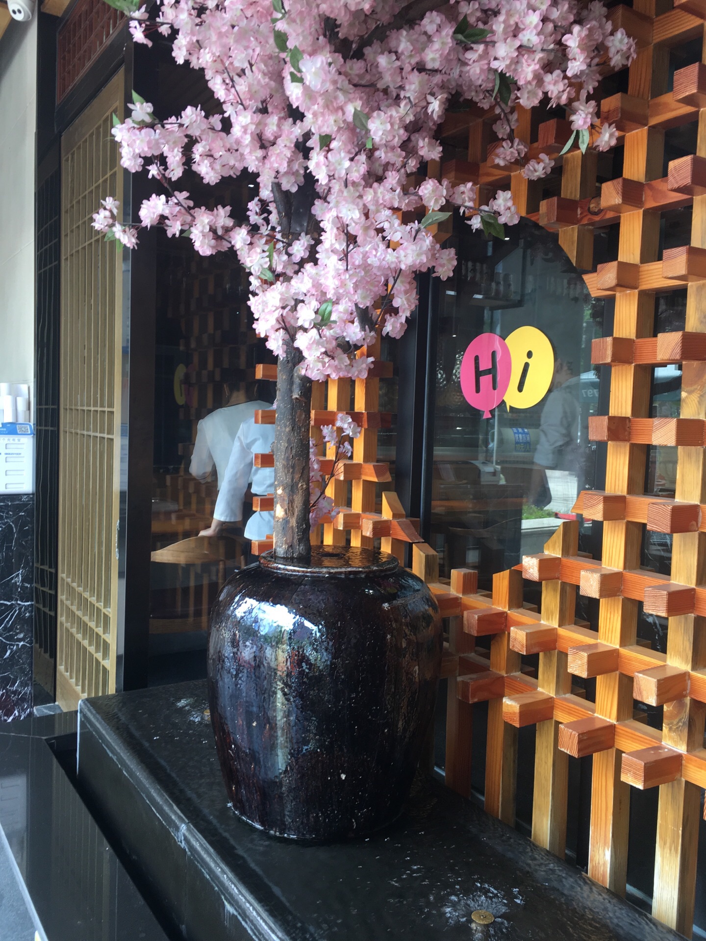 生意非常好,基本都坐满了。餐厅环境挺不错的,有很多漂亮的鲜花点缀。 大厅是铁板烧形式,有师傅现场制作