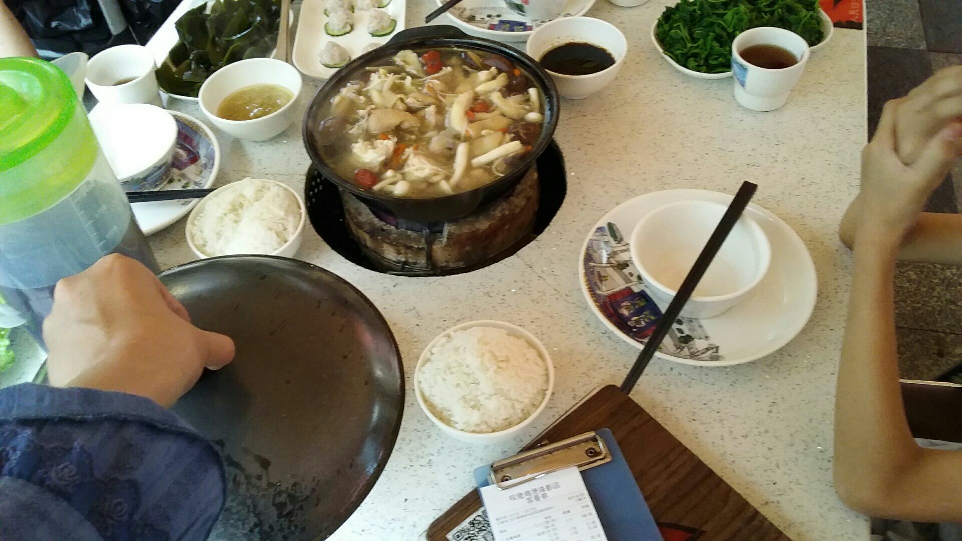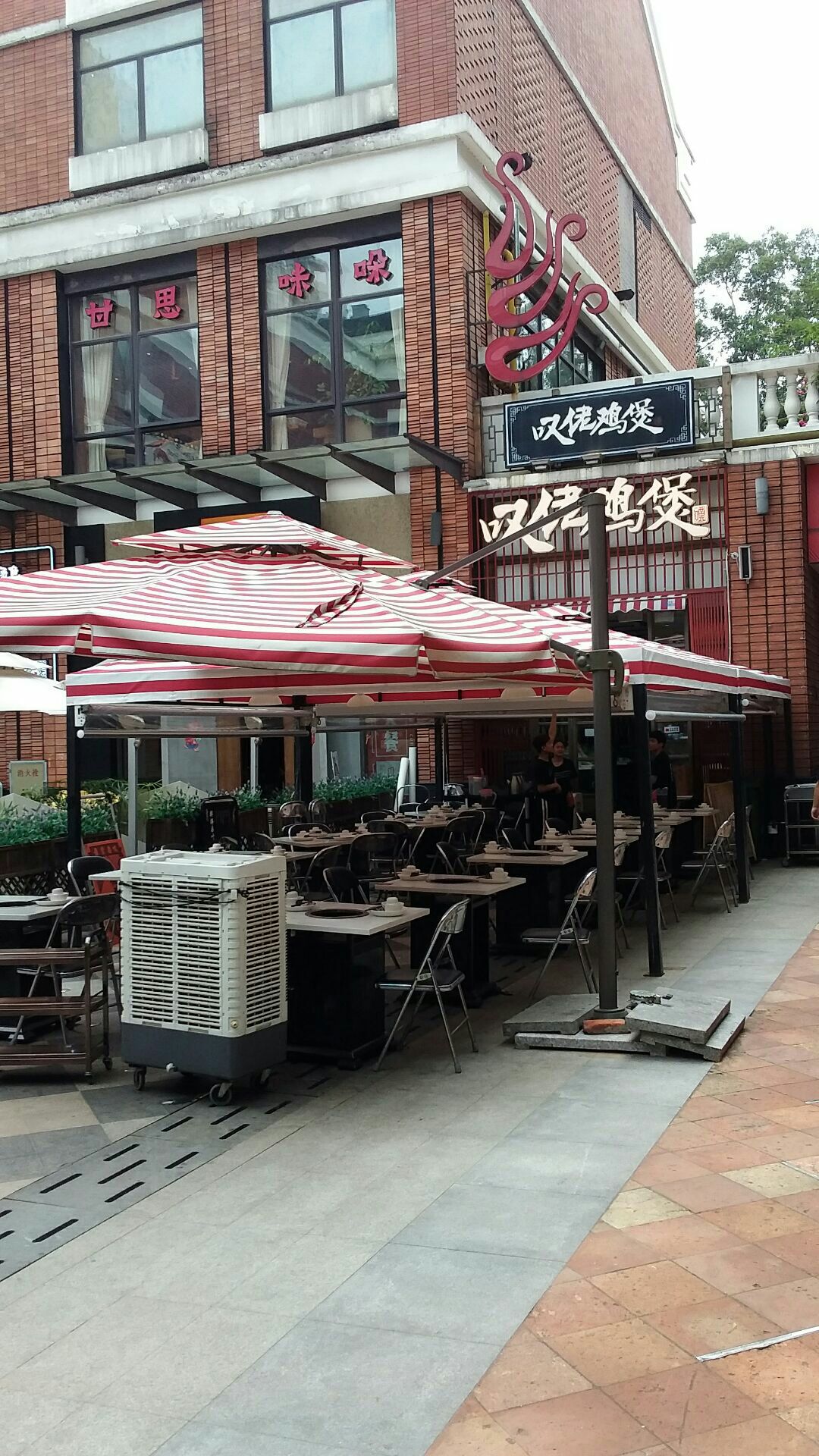 榕树头叹佬鸡煲是这几年广州城内非常受欢迎的餐厅之一,珠影星光城的这家分店,整个店面不是很多,很多就餐位置都在外面, 虽然已经过了午餐时间,但还有新的食客加入,我们点的是菌香鸡煲,份量挺足的,汤很香浓,但应该是没有加调味料。记得要喝完鸡 汤才加其它配菜。配菜12元一份,分量还不算少。