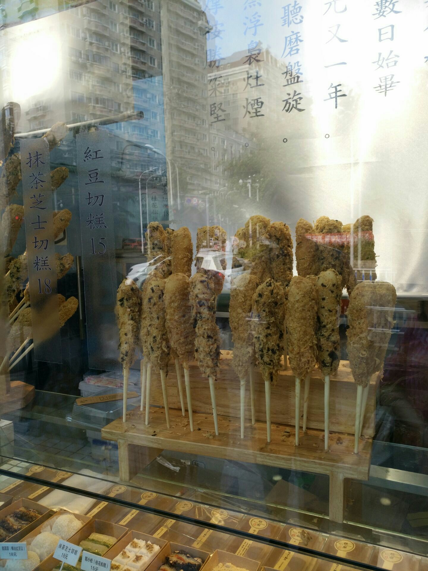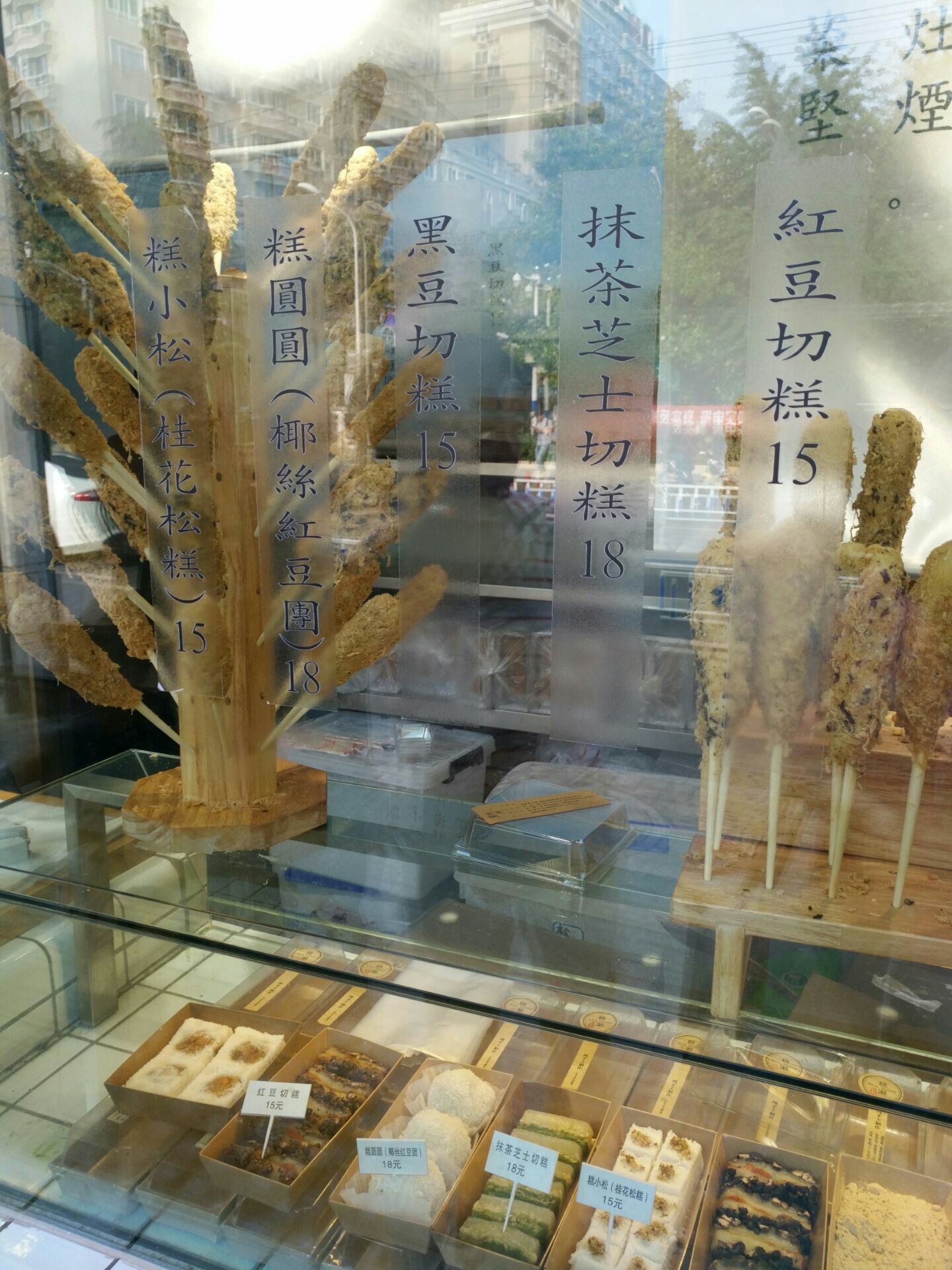 这家店在新生路201号,生意很好,排队的人很多,就感觉他家的招牌不够醒目。糕的品种也比较多,她家还有做成一根香肠形状,插了一根棒棒的糕,海苔肉松糕肠,插得就跟棒棒糖似的,买的人还挺多。我选的是芝士抹茶切糕,糕非常的软糯,但是芝士最好是非常热的时候吃,有那种拉丝的感觉,如果糕冷掉的话,那个芝士就变得硬硬的了,就没有那种风味和口感,当然,芝士吃到嘴里,最后还是挺香的感觉。那糕,还有家里有矿系列,感觉这个名字真的起的很高大上,非常有水平。