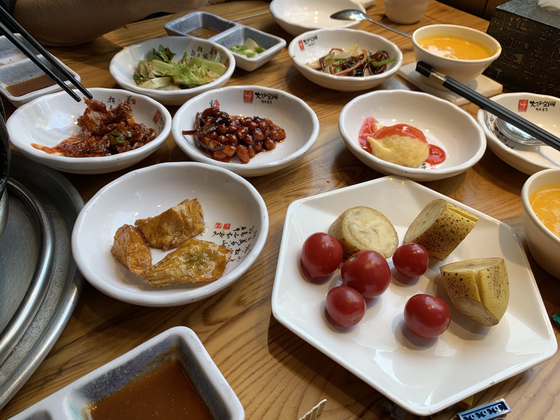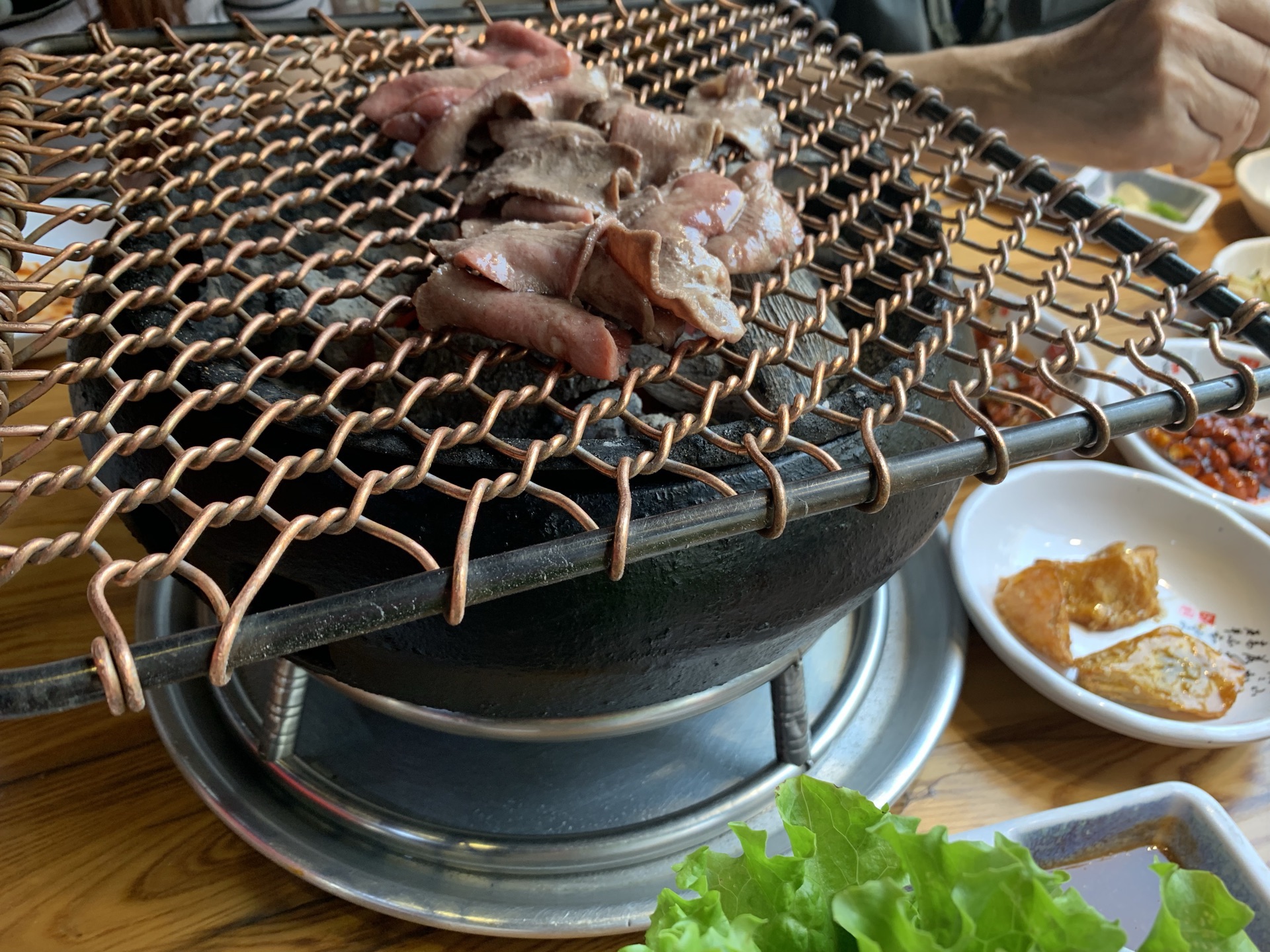 店家提供烤肉和北京火锅。牛排很赞,肥瘦相间,很嫩。送了好多各式小菜,开胃爽口。五花肉有些爆了平时和周末都有团购优惠,菜单里也有套餐。店家提供烤肉和北京火锅。送了好多各式小菜,开胃爽口。牛排很赞,肥瘦相间,很嫩。五花肉有些爆了。牛舌不嫩,我们把牛舌烤焦些。