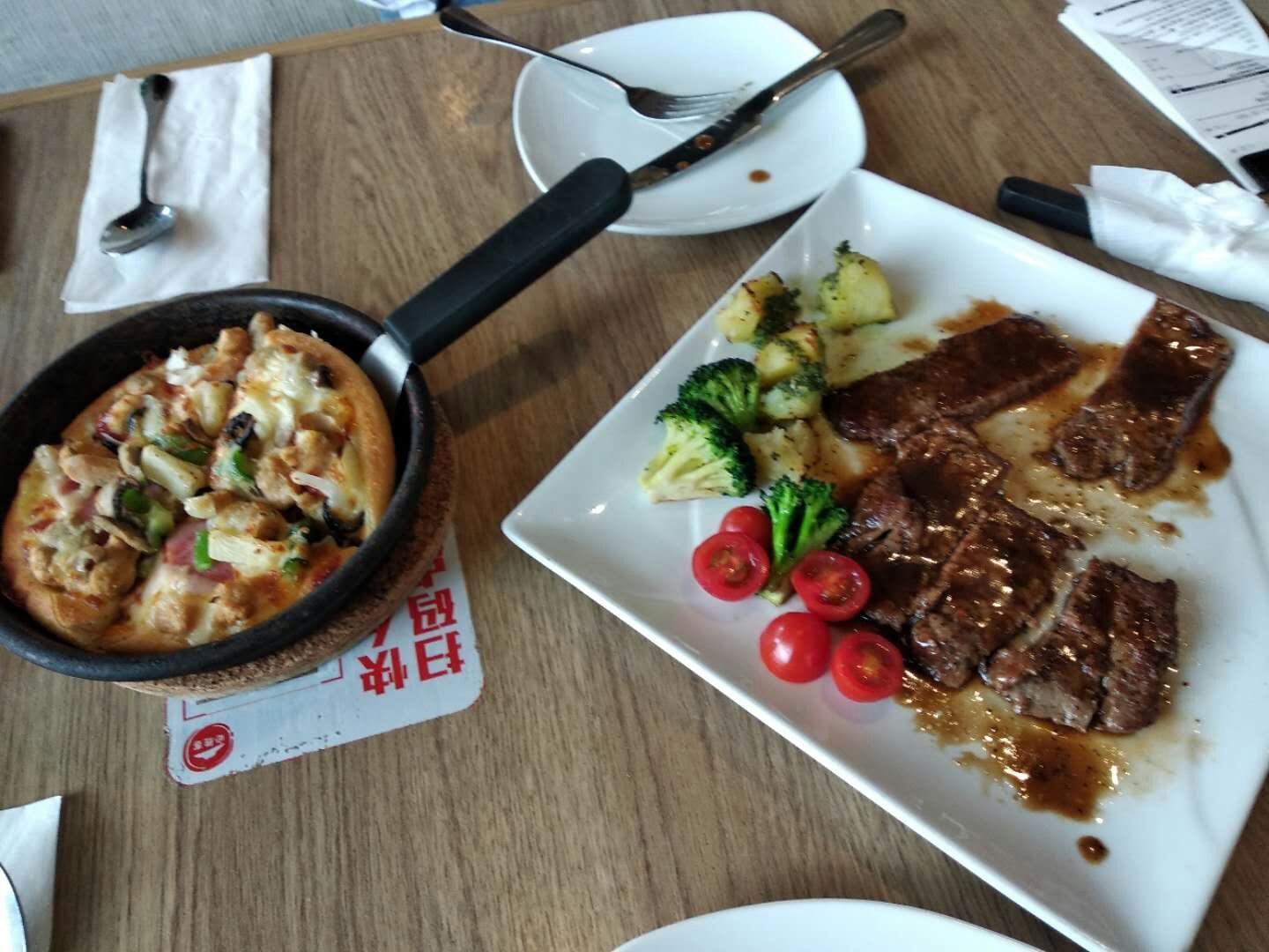 必胜客的披萨一直是很好吃的,这天我们点了牛排,好像不怎么样,大大的一块,很薄,太薄了,味道一般。最想说的是他们的服务,点完菜后,让服务员加水,半天也没人来,直到我们要用完餐,叫了另外一位,才来。这是我们在其他店,从来没有碰到过的。