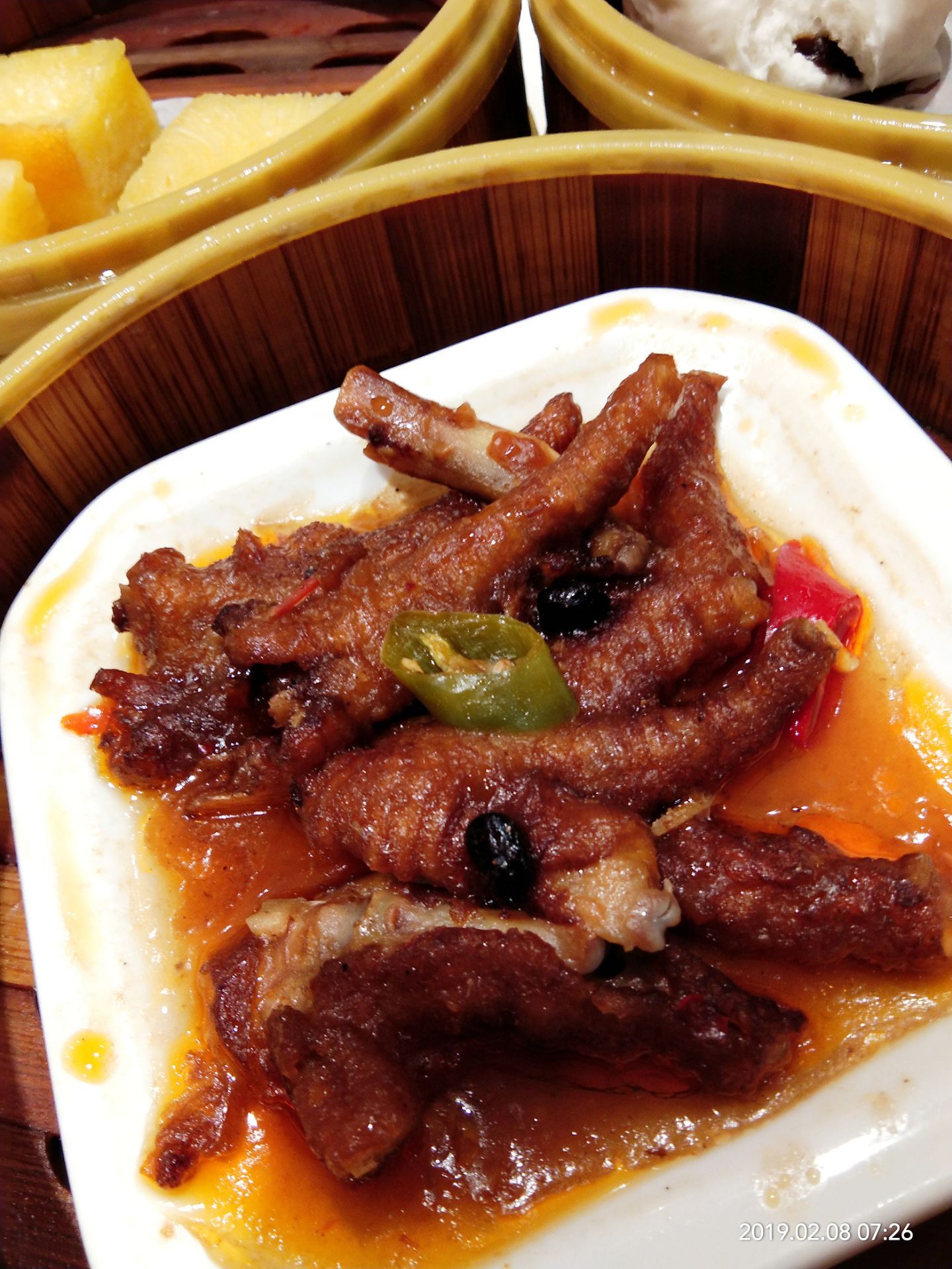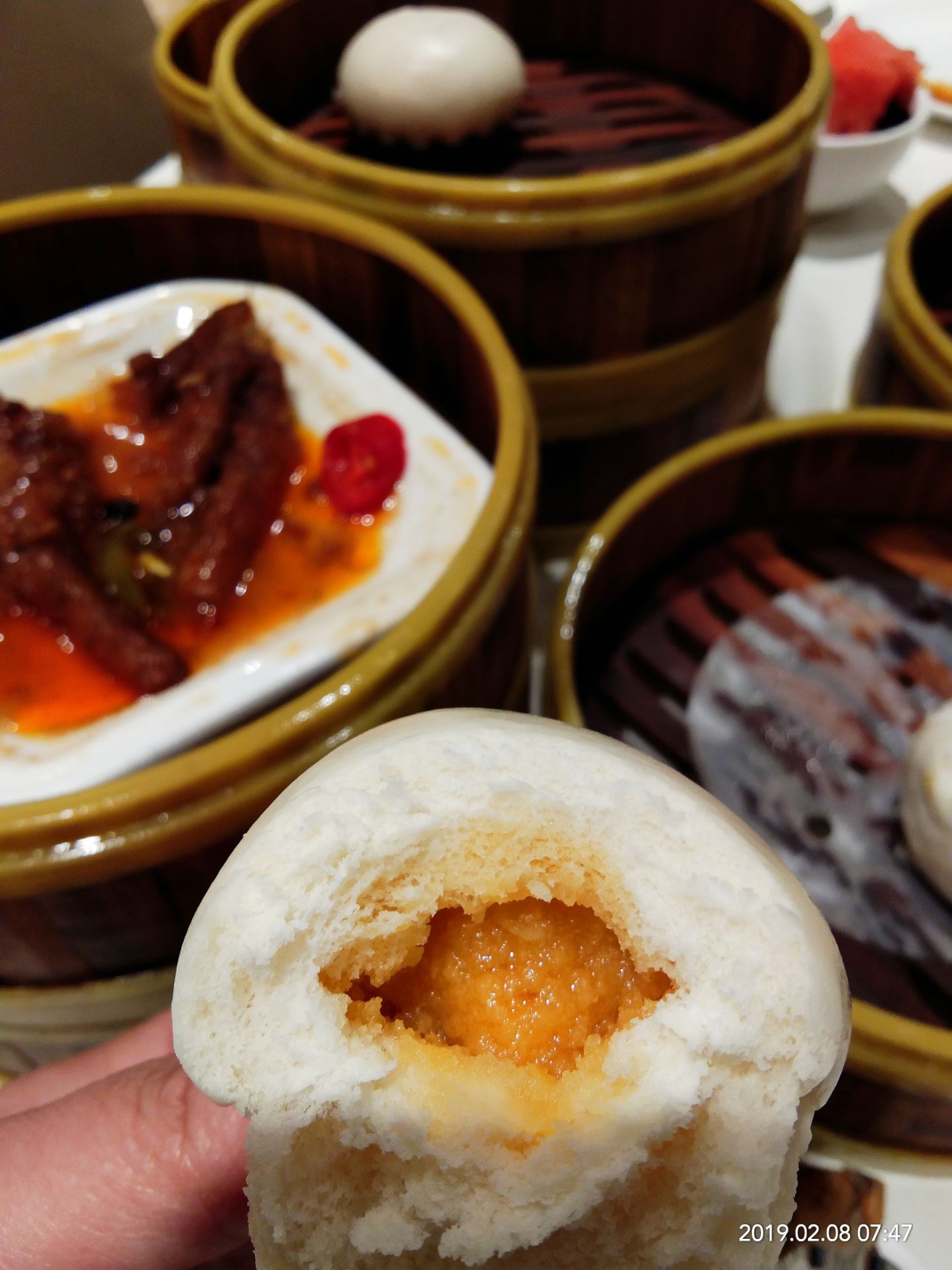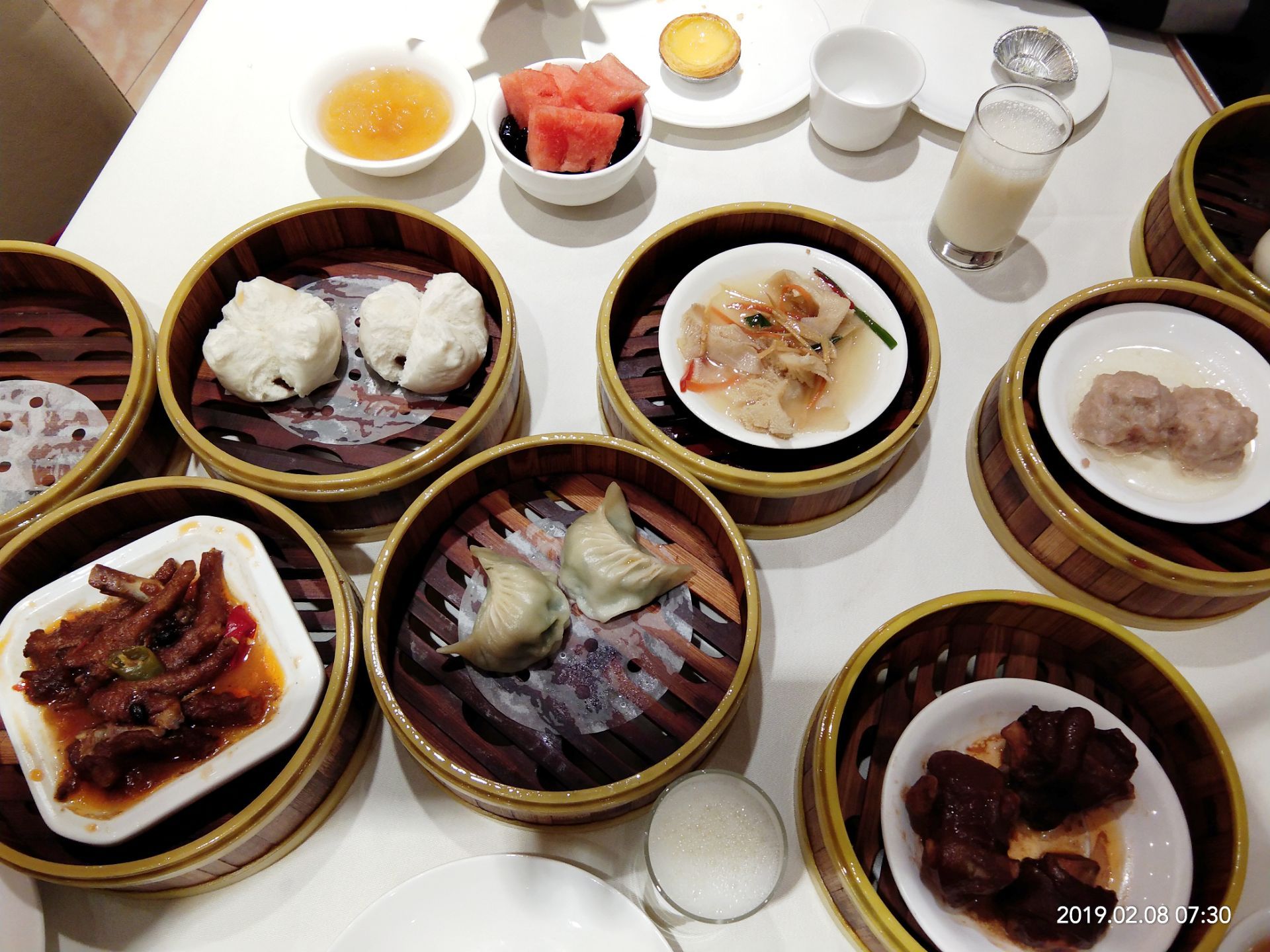 2019年春节成都之行( ̄y▽ ̄)~*捂嘴偷笑 在成都的吃吃喝喝玩玩的日子里,真是幸福,好怀念哦⊙∀⊙!这是吃的一次自助早茶,从高新区悠方骑共享单车一早到达,嘛呀,好远哦,导航不准[阴险][阴险] 七点多到达,已经有就餐的了,但还是有很多空位,找个离着餐台近的,方便,哈哈 喜欢凤爪,特别好,脱骨,我好像吃了三盘[胜利] 奶黄包是要到窗口单独领的,吃完一盘就可以去要,夹心给力,吃一个基本顶住啦[笑哭] 小猪蹄子,我喜欢,Q弹的肉肉,粘嘴,这胶原蛋白补得来。 毛肚,一小盘分量那么多,味道棒棒哒,没敢多吃,不好消化。 原本以为早茶的自助应该能吃很多,非也,也是眼睛不饱肚子装不下的节奏,唉,如果青岛有这品质的早茶自助就好了。 服务员们可能因为起太早的缘故,都不玩不热的。