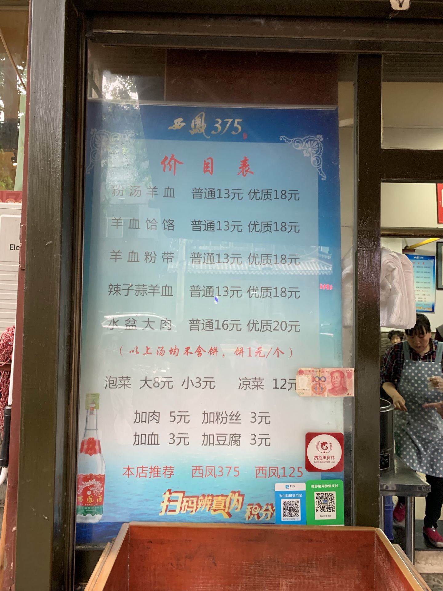 总评: 对于一个从来不吃血的人儿来说,他们家的我表示可以吃。 羊血很嫩,粉很入味,汤头够味还鲜,份量还特扎实! 生意好是有原因的,品质口味兼具嘛,性价比还高。 建议,一定要去试试,好吃不贵,说的就是它啦! 评分:84分 性价比:❤❤❤❤ 饭点的时候,店门口堆满了食客,一个高板凳当桌子,小板凳坐着,门口自顾自的陶醉吃着,特别享受,趁热吃,不管环境,吃完走人,随性而满足。 小亚我运气还不错,正好室内有人刚吃完,立马抢占,生怕晚了一步就没了。 【粉汤羊血】优质18元,普通13元 我点的是优质,也就是比普通的多一些羊血而已,那一碗的料更丰富一点。 真的是很大一碗,羊血切成细条,软嫩细腻,还有弹性,QQ的,有点果冻的感觉,得很吸味。 碗里还有豆腐和粉条,因为汤头很鲜,调味料也很足,油辣子还很香,所以即便是它真的很大碗,吃完它我也觉得很easy呀! 很多当地人都自己掰碎馍馍,泡在碗里,那一碗瞬间变两碗那么多,份量异常的足,看着就觉得很畅快哦! 我觉得陕西人,不管男女老少,好像胃口都很好,饭量也都不小呢。 大悦城也有一家他们的分店,虽没有老字号看着那么地道,但是味道经导哥鉴定,差不多的。