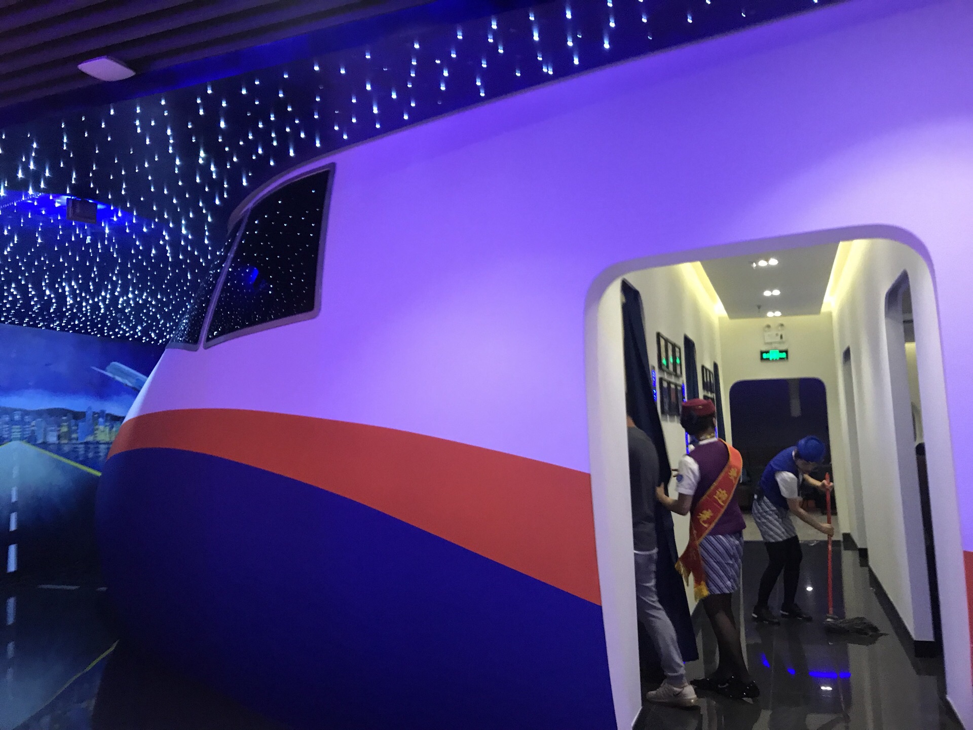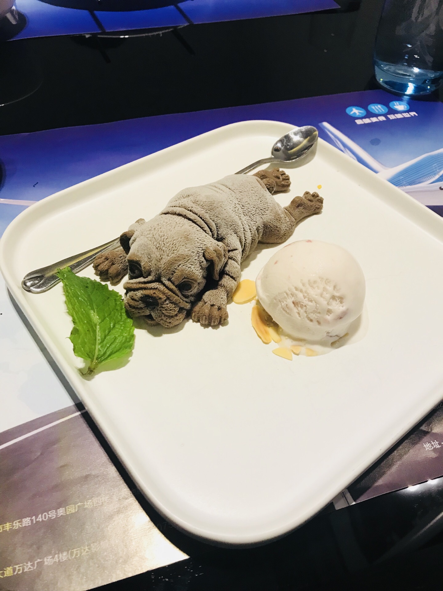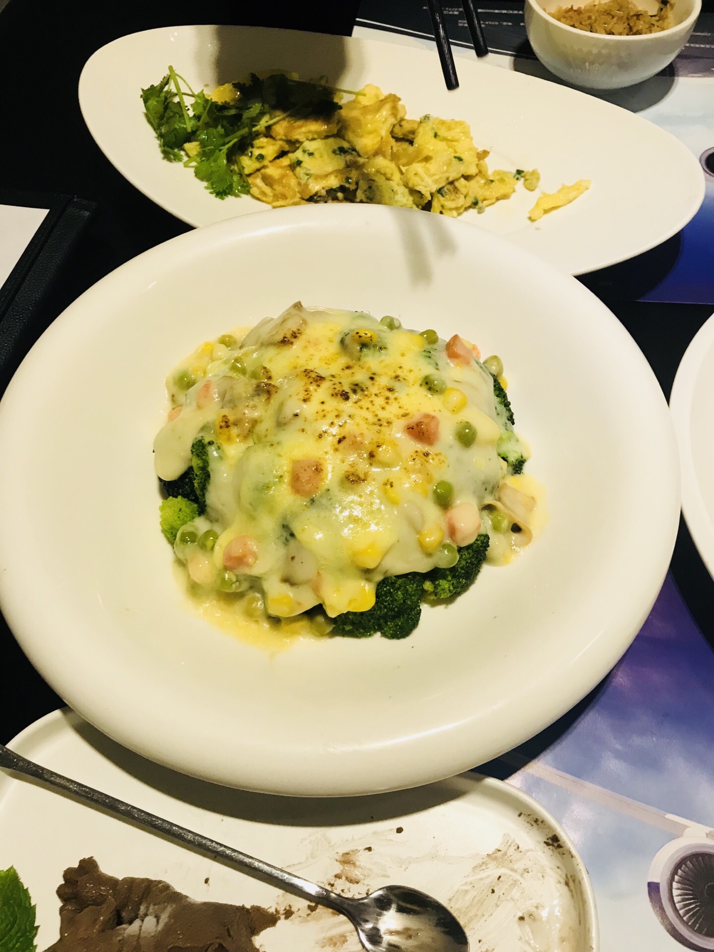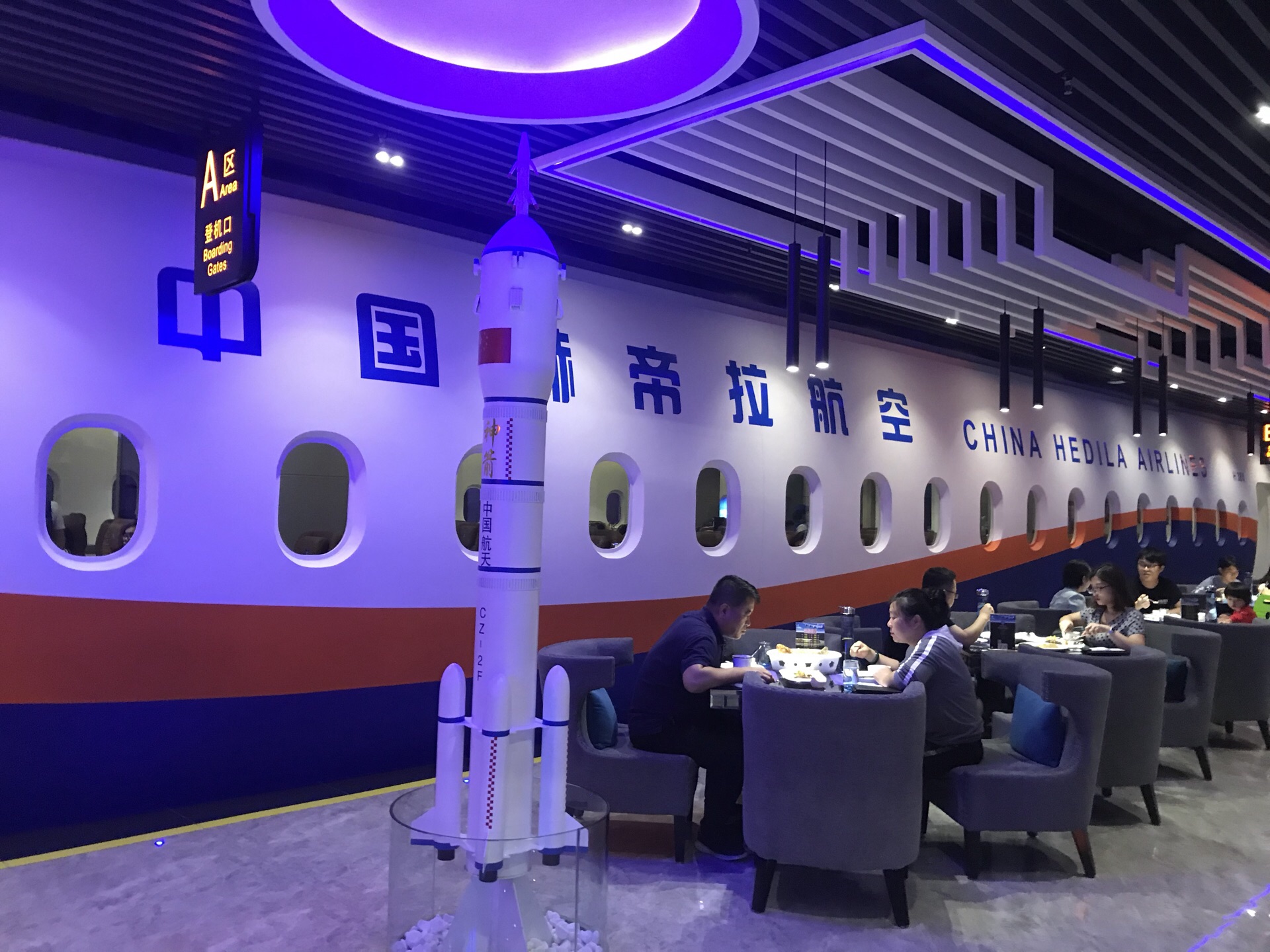 赫帝拉航空餐厅,一家以航空为主题的餐厅。 【环境】餐厅入口有外星人雕塑,服务员全部穿空姐空哥服装。我们用餐是个两人包厢的小餐厅,里面有按钮可以直接呼叫服务员。 【口味】餐厅出品很快,十分钟就上齐了。网红狗冰淇淋是巧克力味的,很好吃,配的冰淇淋球是草莓味的。主推海胆炒饭!超好吃,价格为68元人民币一份。生蚝煎蛋生蚝特别小,38一份。西兰花是芝士焗的,分量也很足。松子鱼比较小,78一份。两个人吃了247元,人均125左右。没点饮料,喝的随餐柠檬水。下次要试试石锅拌饭。准确的说,味道和价格成正比,超赞!