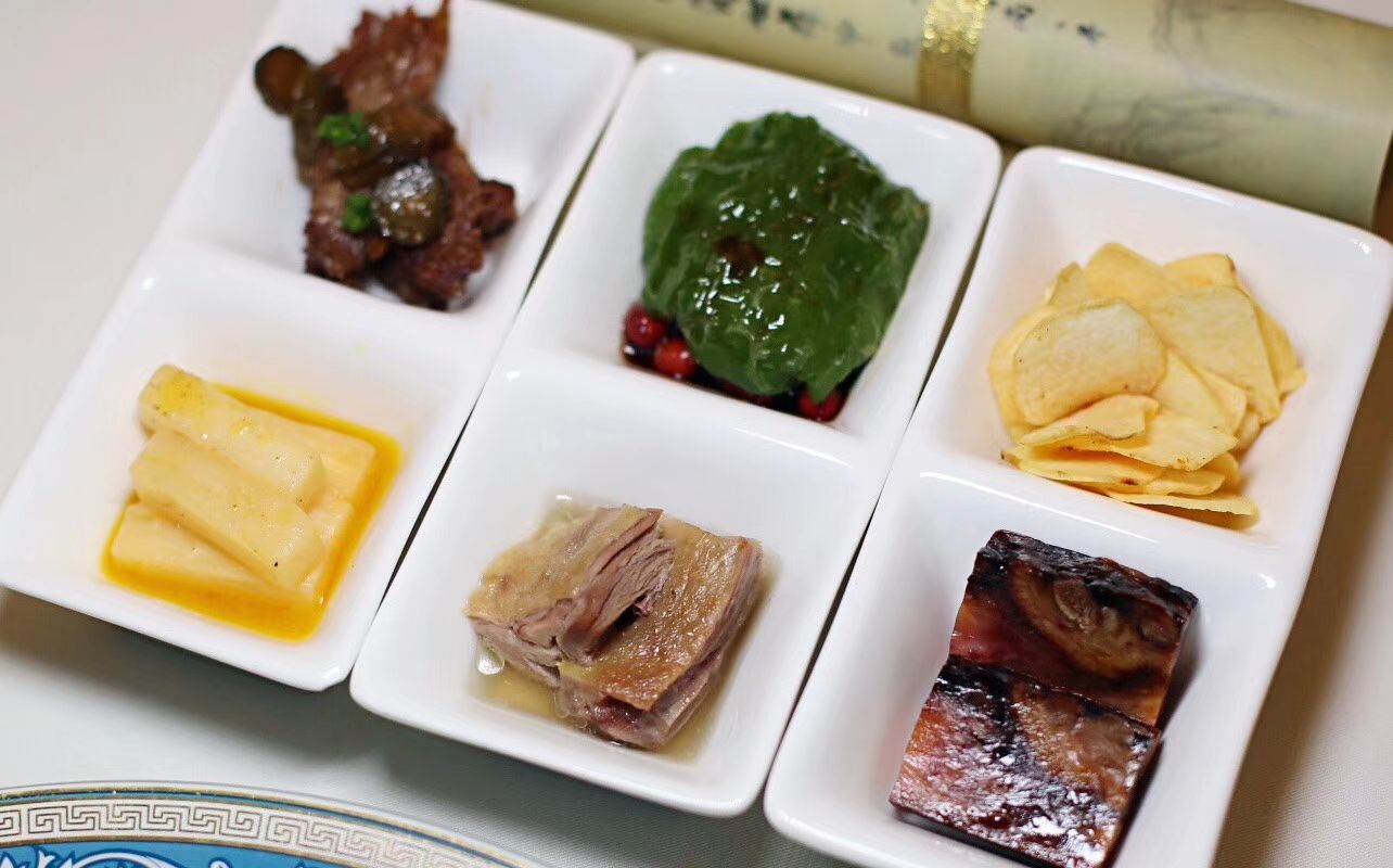 扬州迎宾馆国宴厅,淮盐菜始于春秋、兴于汉唐、盛于明清,淮扬菜根在扬州,底蕴浓厚,品质始终保持高水准,前菜六小碟为,靠小鱼、虎皮椒、卤茭白、酱时花、盐水鹅、炸茨菇,热菜:清汤酸辣甲鱼盅(配了似春卷)、酱河虾(比吃过的醉虾味道和口感都好),小吃:绿茶凉糕、萝卜丝酥。