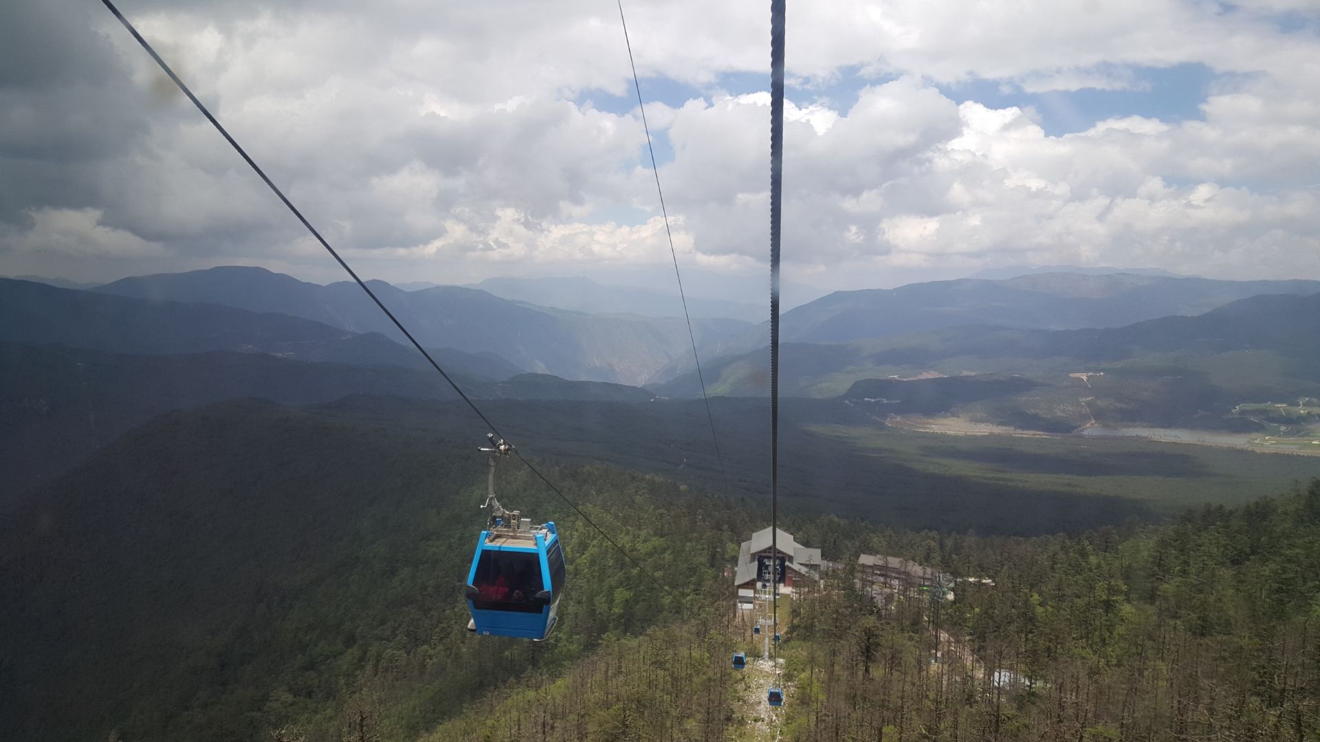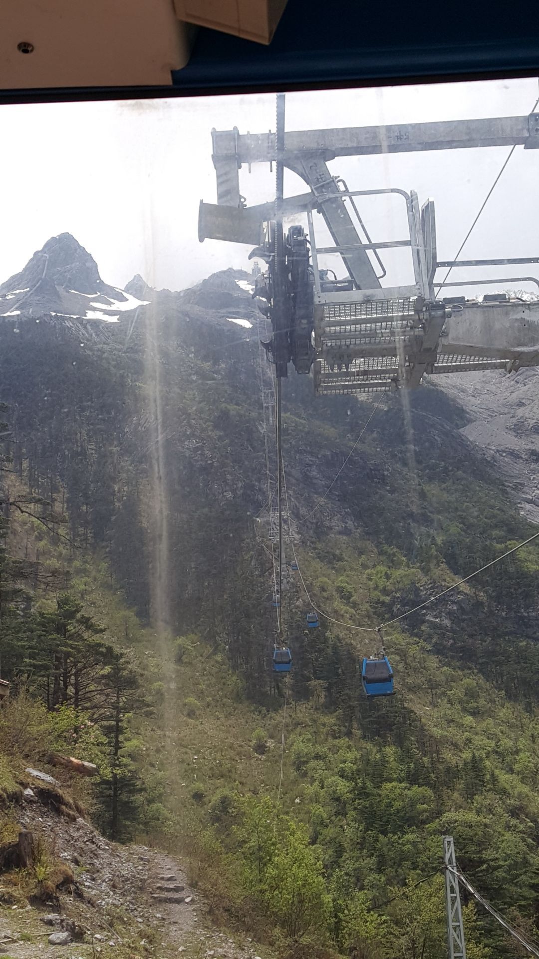 索道全长2914米,垂直高差1150米,是我国海拔最高的旅游客运索道之一起点站是一片茂密的原始森林,海拔3356米,索道由此往上运行,直至雪山主峰扇子陡正下方的上部站,那里海拔4506米。索道全长2914米,垂直高差1150米,是我国海拔最高的旅游客运索道之一。