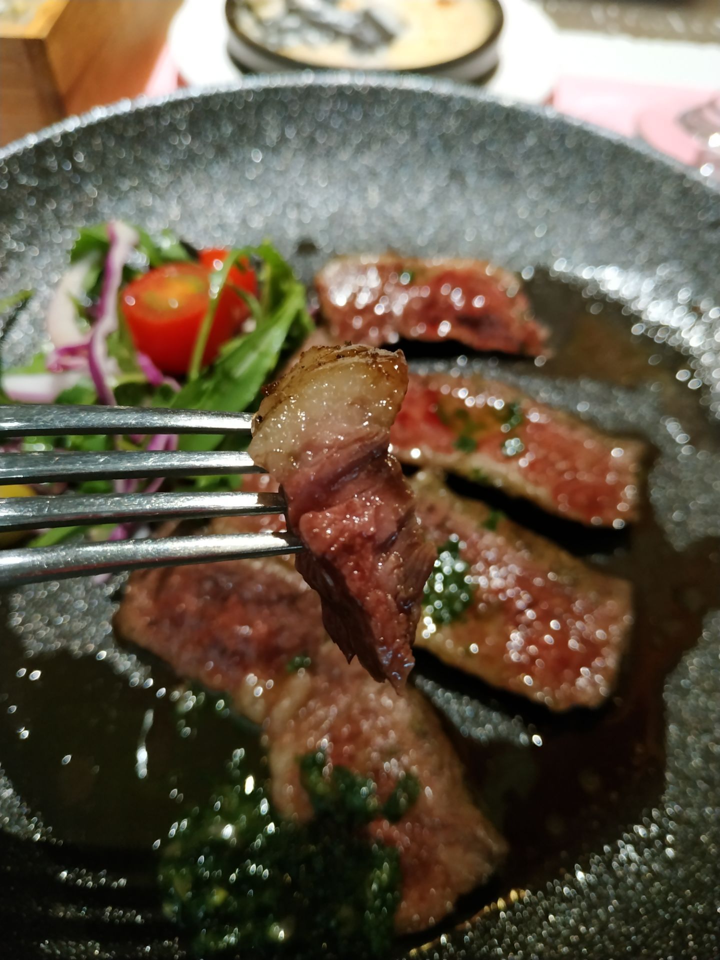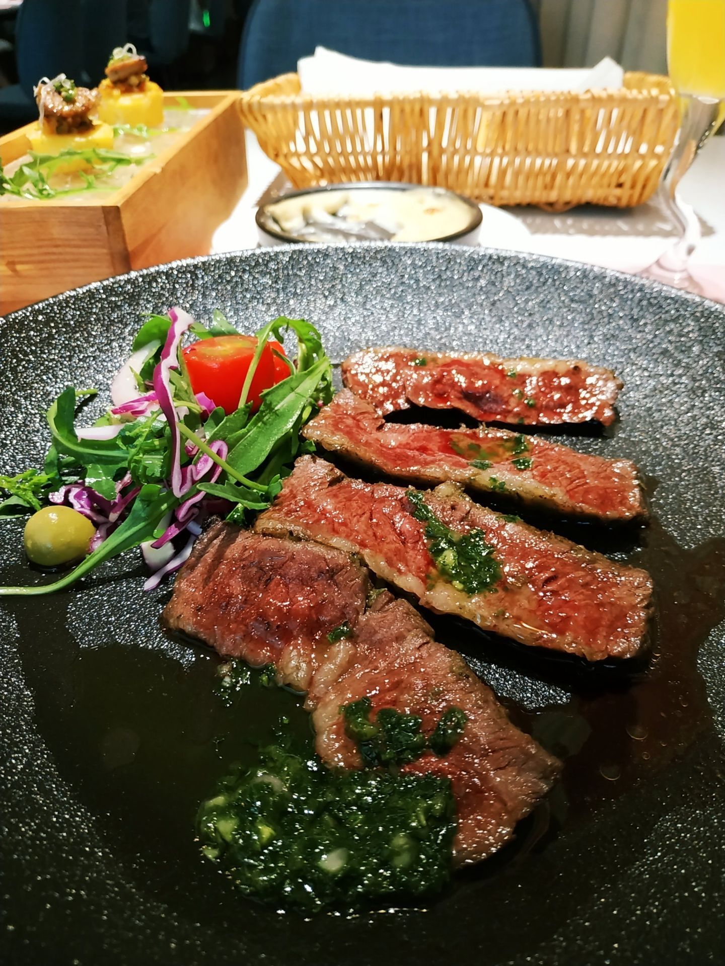 ...嫩,推荐的五分熟,上来后香味扑鼻,感觉牛排食材很好,本身就很美味,原汁原味吃最好,没有加胡椒酱