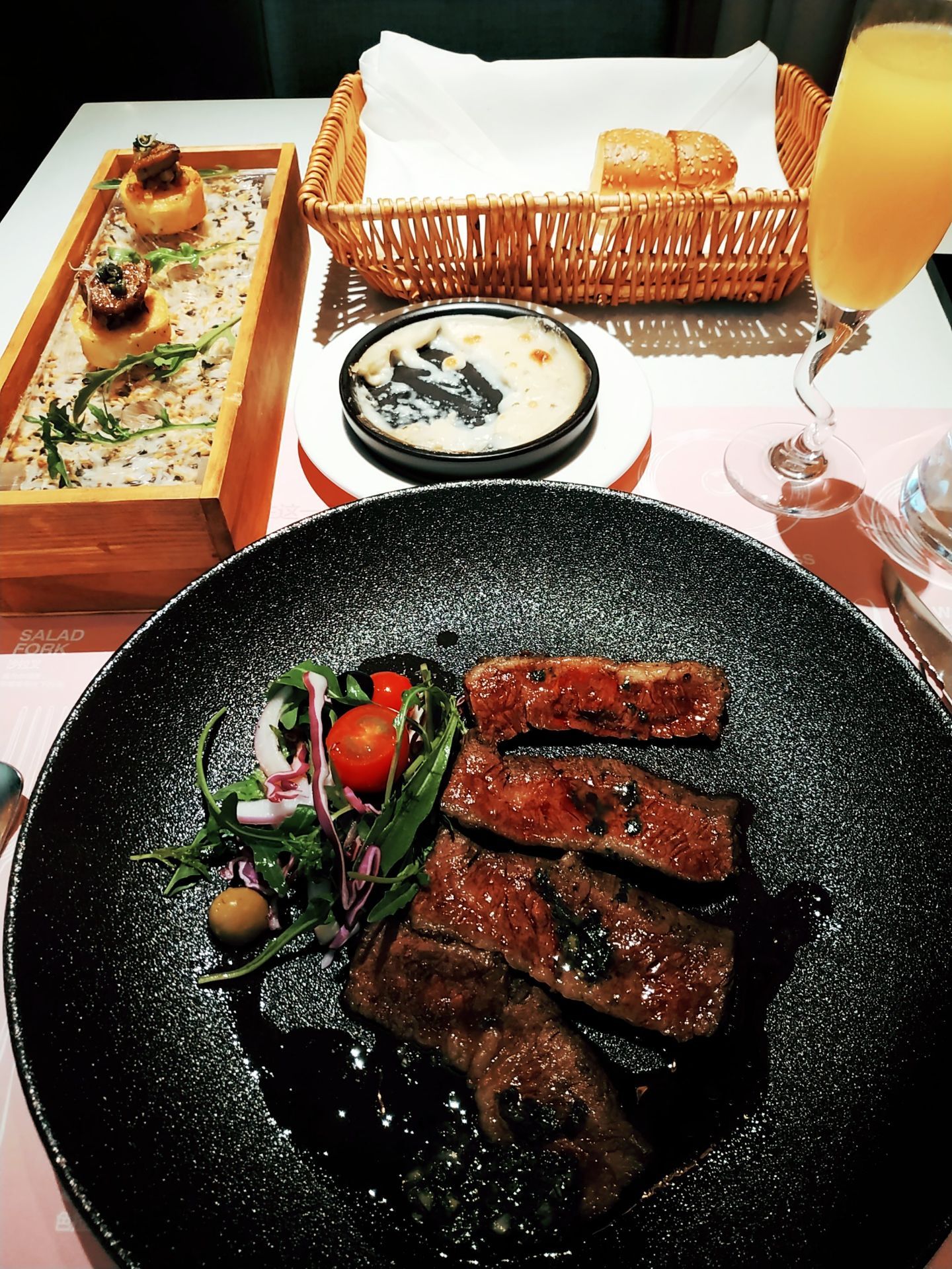 听说是王品旗下的 就迫不及待的过来一试 [玫瑰][玫瑰][玫瑰] |普罗旺斯法香牛排^因为牛肉很嫩,推荐的五分熟,上来后香味扑鼻,感觉牛排食材很好,本身就很美味,原汁原味吃最好,没有加胡椒酱。 |奶油菌菇浓汤^汤很浓很浓,味道也很浓郁,感觉蘸着餐前面包好吃。 |餐前面包^面包烤得很好,外酥里软。 |餐前饮料^上的橙汁很棒,里面开始是冰沙,后面化了之后橙汁很甜很爽口。 |现炸薯条^很大块,薯条炸的很香,比较中规中矩,他们家配的番茄酱感觉不错。 |香煎鹅肝配手作玉米饼(2个)^鹅肝感觉没有太香,玉米饼味道感觉一般。