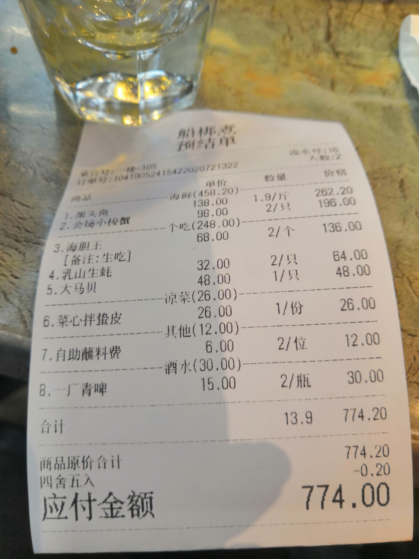 海鲜都比较新鲜,轮流下锅蒸,定时,保证食材的鲜嫩。乳山生蚝个比较大,大马贝里肉很多,可惜紫海胆不多了没得挑就没有吃,黑头鱼肉紧实鲜嫩,调的汁也不错。 唯一不足就是选海鲜时说螃蟹都满黄,不满黄给免费换,选的98一只的,实际黄并不多,感觉有点宰人。另外生蚝和马贝都是自己挑的,上锅蒸了以后老公发现自己挑的还在门口的筐里。问了服务员,他们解释是服务员沟通的问题,也就将错就错了,虽然个头可能都差不多,但我们心里多少有点别扭。