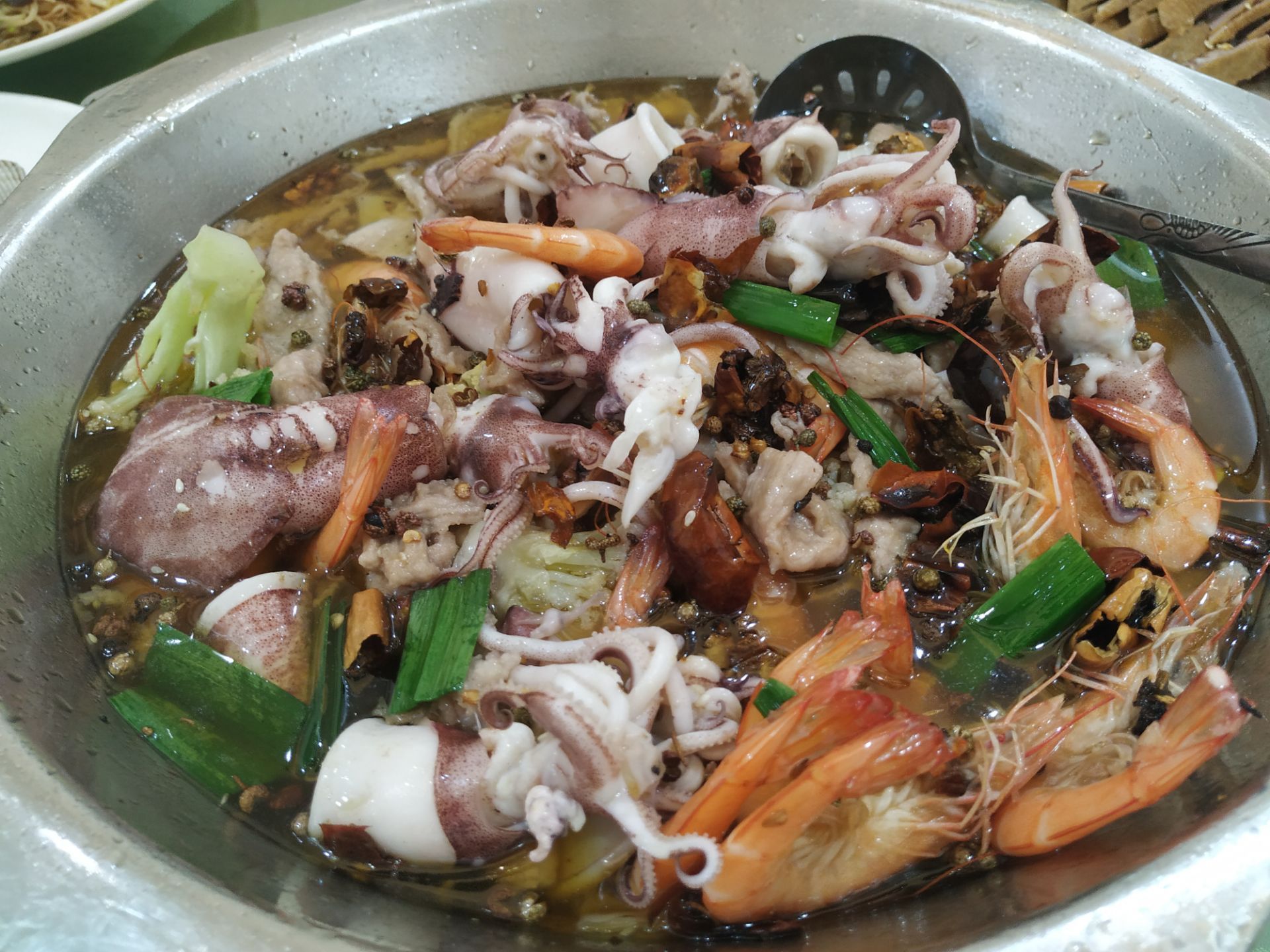 悦来福东山海鲜在厦门也算是有些名气了,这次来这家是老朋友聚餐。手机扫码点单因为有很多海鲜是时价所以显得不是很方便。招牌的水煮三鲜分量还是那么足,血蛤壳子不好开,不过有配工具打开还算方便,熏鸭味道比较淡,石橄榄汤很清淡降火可以多喝一点,炒米粉是厦门人喜欢的主食。包间的环境还可以,但是不关门的话还是很吵闹。