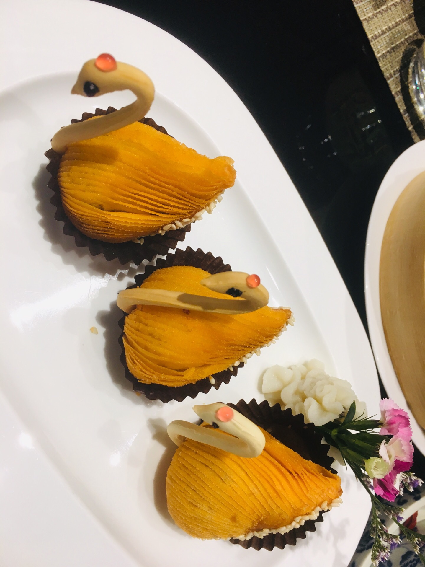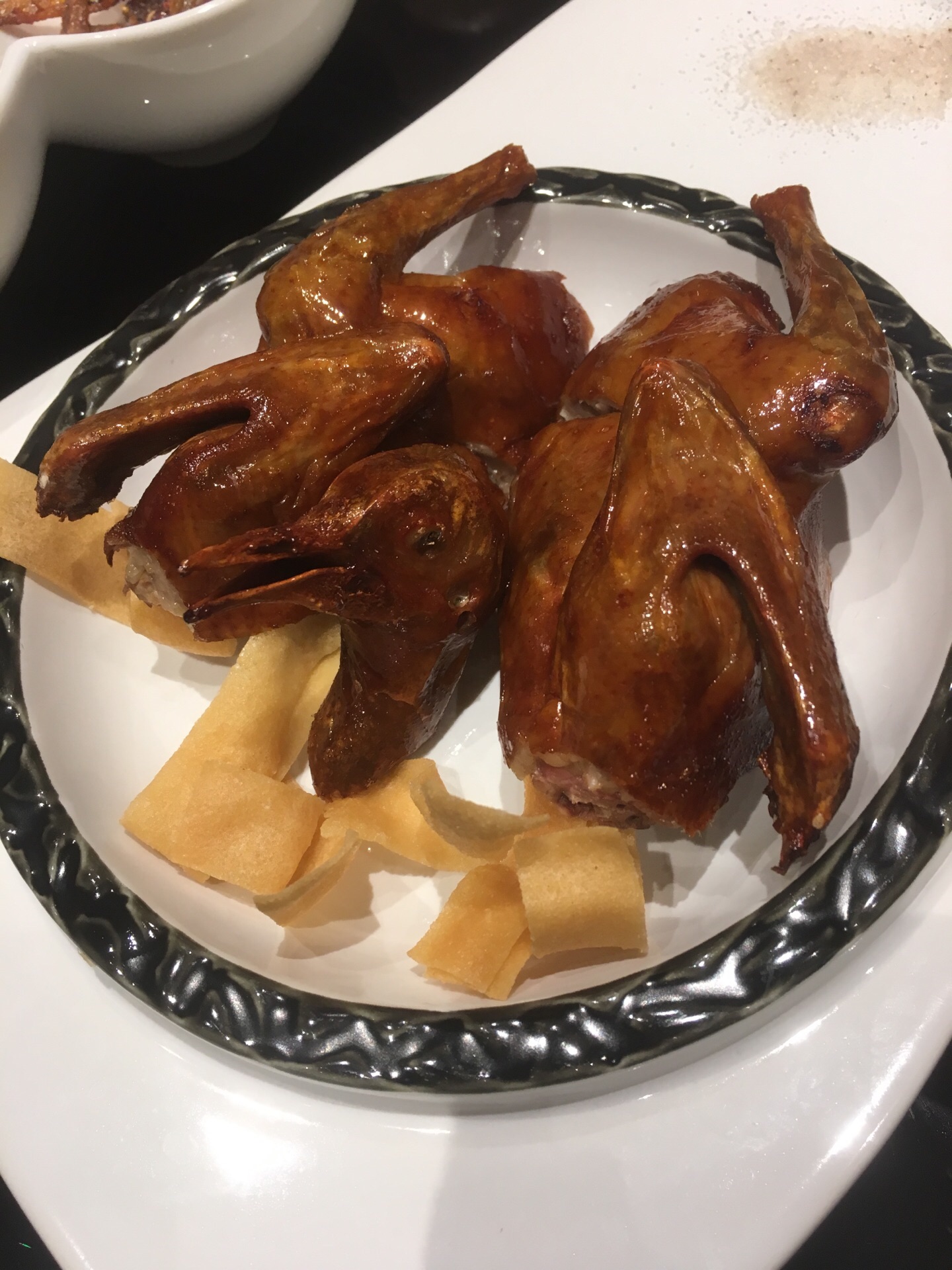 五星级酒店的餐厅,主打是粤菜,装修风格是中式现代感,环境是我喜欢的,乳鸽是第一道菜,总体感觉还好,但是和唐宫的比还是有差距,汁水不够,鸽子太小各种粤式点心做得没有太大问题,蓝莓味的山药做得值得肯定,粗粮细作考验厨师的功力!