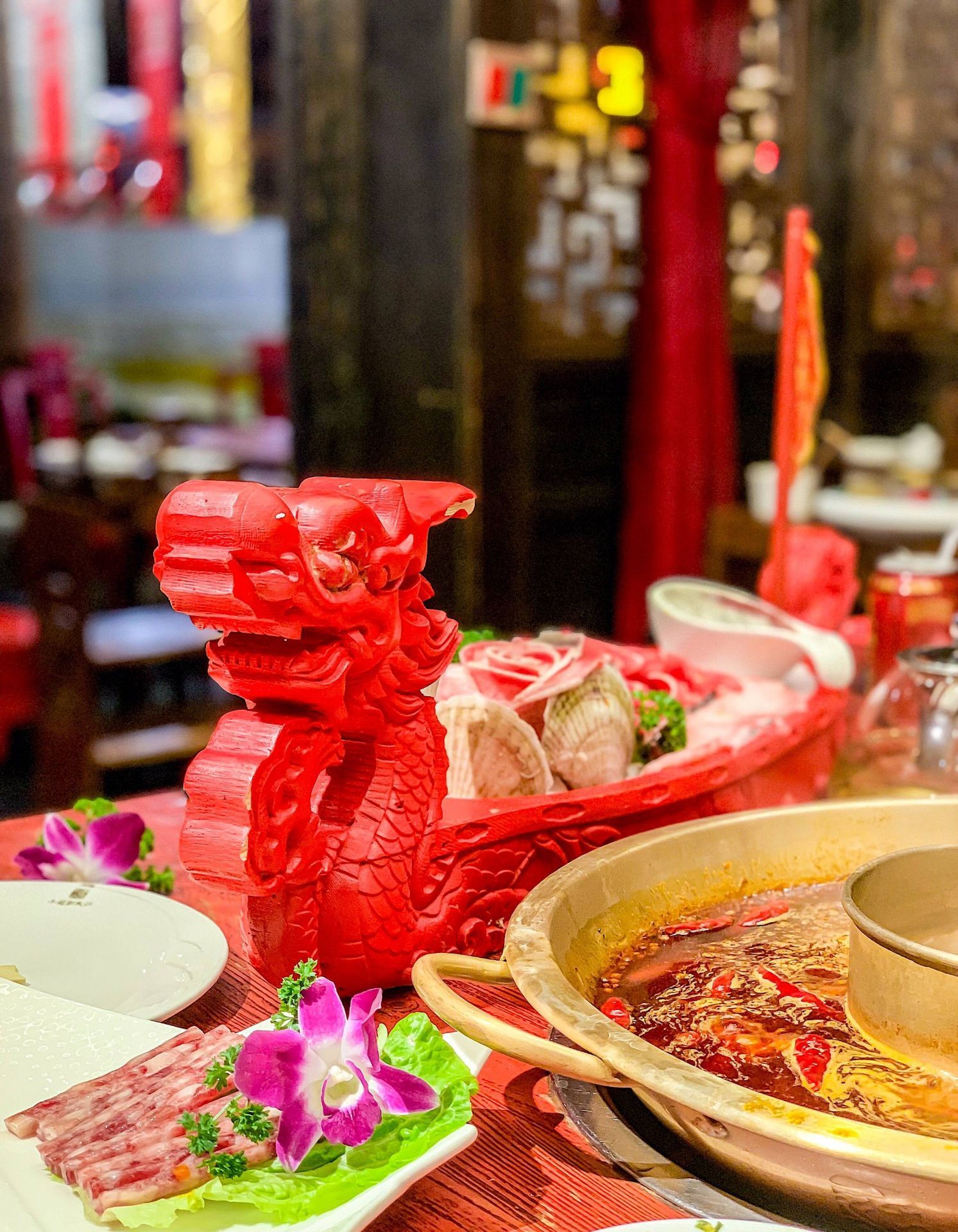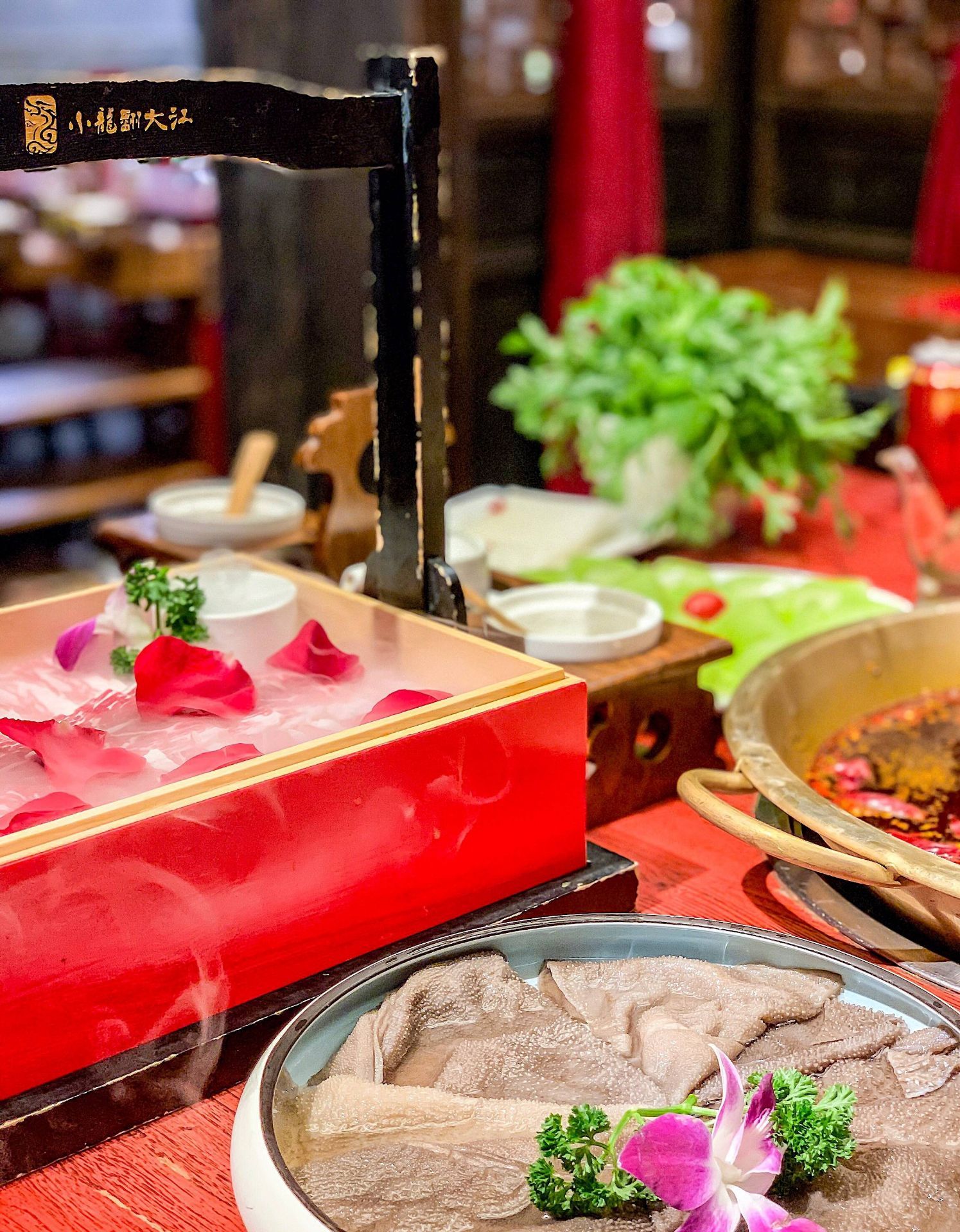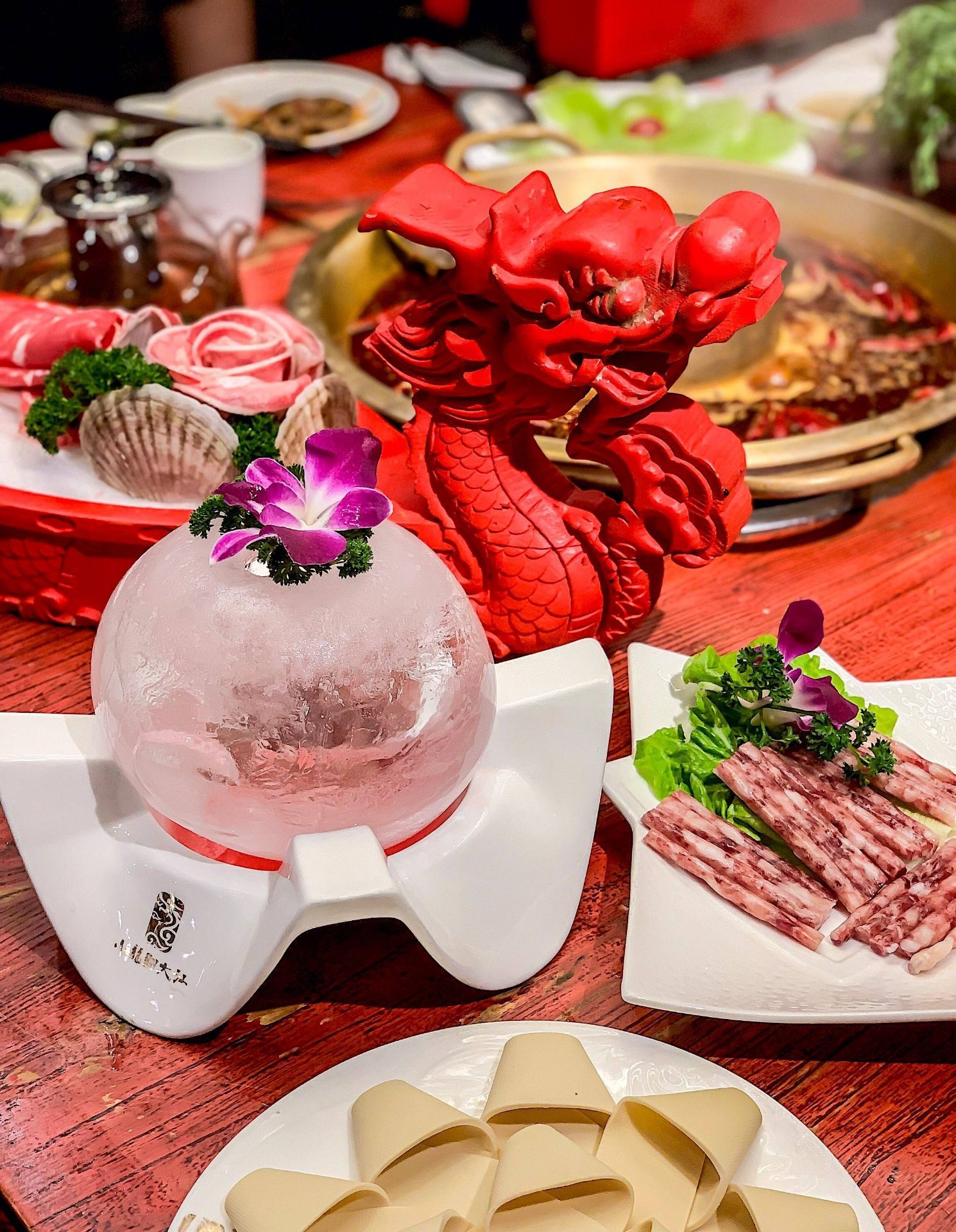 小龙翻大江火锅酒楼(春熙店) 这家店是小龙坎的高配版,这个装修耗时一年的火锅店着实让我惊到了。这么大条霸气的龙在大堂正中间。 这里的鹅肠装在一个冰球里,小龙翻大江真的是整条龙端了上来,就是肉干了一点,我更喜欢肥瘦相间的安格斯牛肉和新鲜的毛肚。 包厢服务费会另外加80 ▪️地址:东大街下东大街段21号附29号香槟广场3层 ▪️营业时间:11:00am –23:00pm