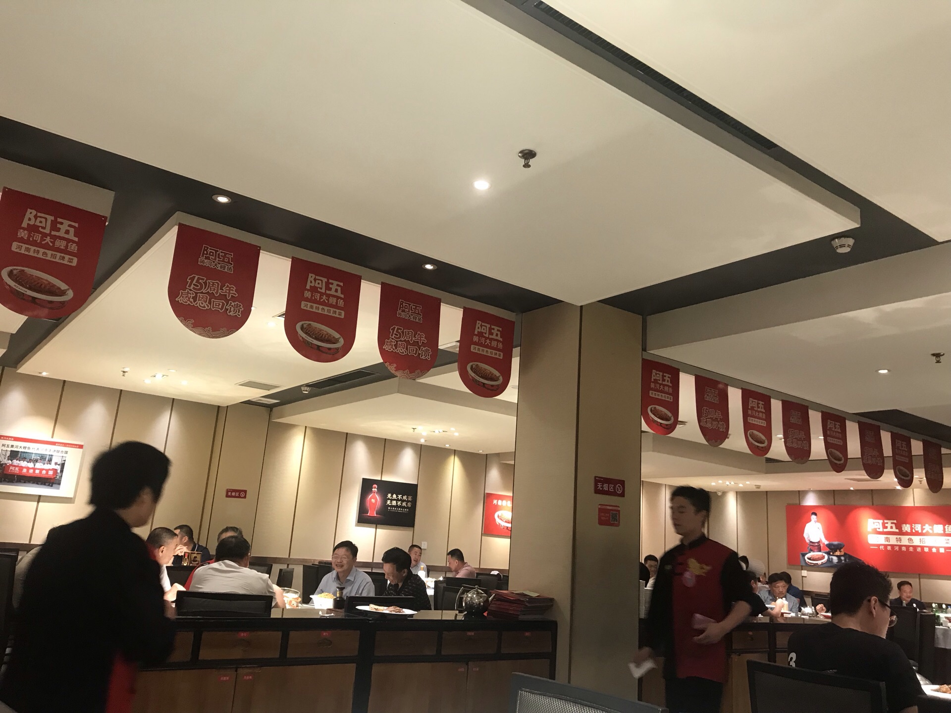 网友2019-05-29...,招牌菜就是黄河大鲤鱼,进门就可以看见大厨制作,其他的菜做的也很可口,就餐环境比较好,值得推荐阿五黄河大鲤鱼是连锁店,这家距离酒店不远就慕名而来晚餐,饭店主打豫菜,招牌菜就是黄河大鲤鱼,进门就可以看见大厨制作,其他的菜做的也很可口,就餐环境比较好,值得推荐。
