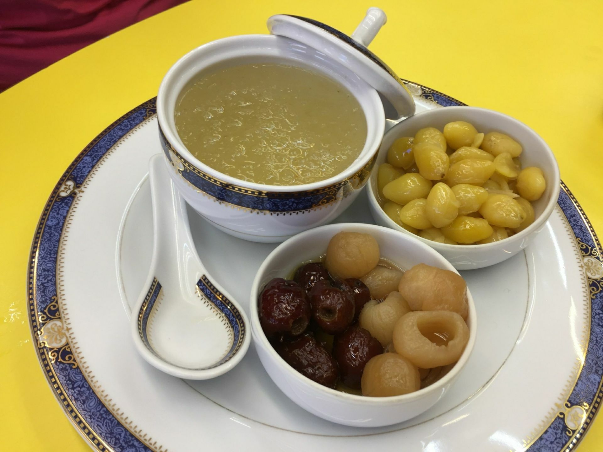 东方燕窝泡发的燕窝,上锅隔水炖煮30分钟,倒入精致的容器内配上白果龙眼及红枣,端到眼前时还是很惊艳的