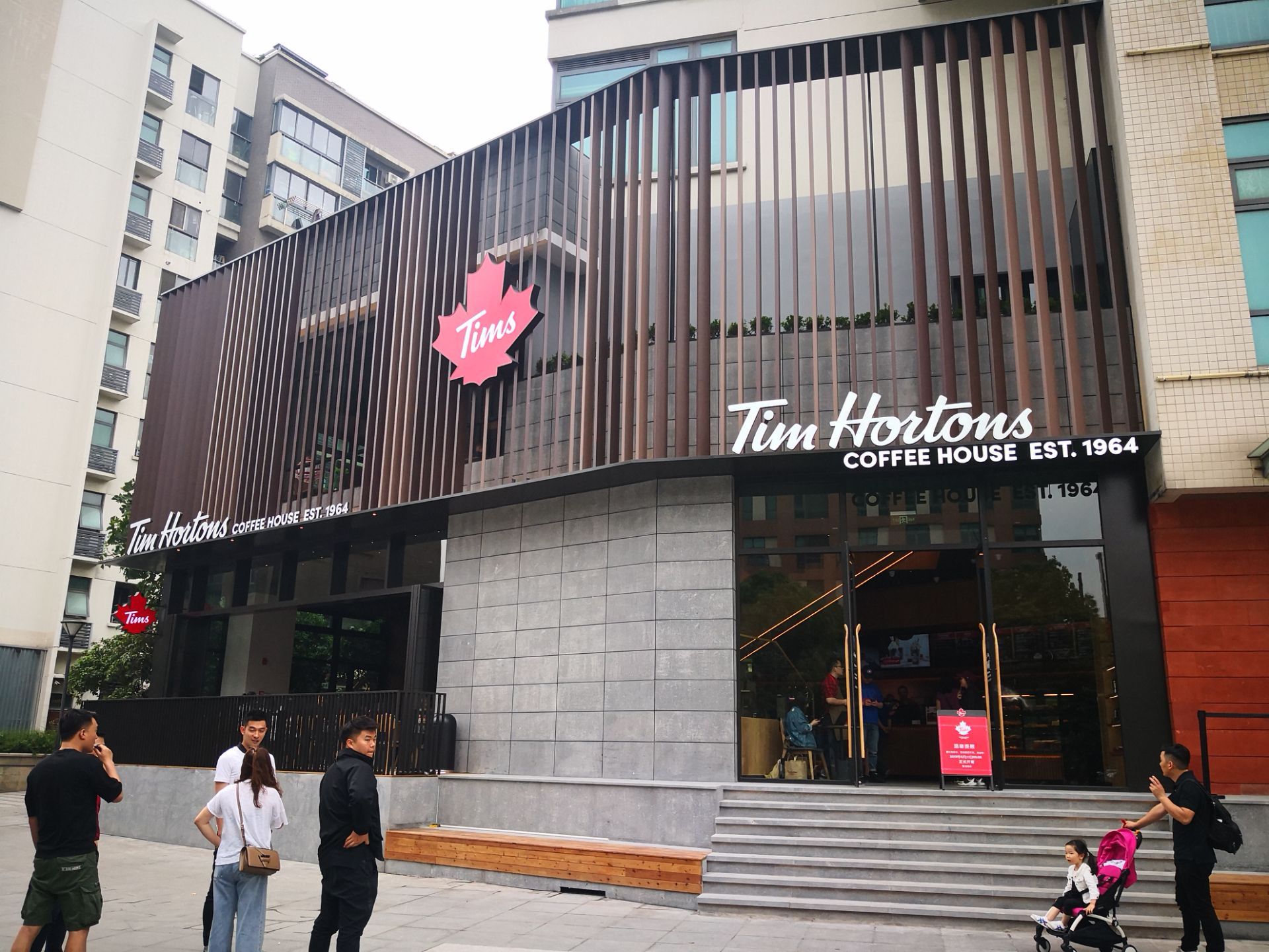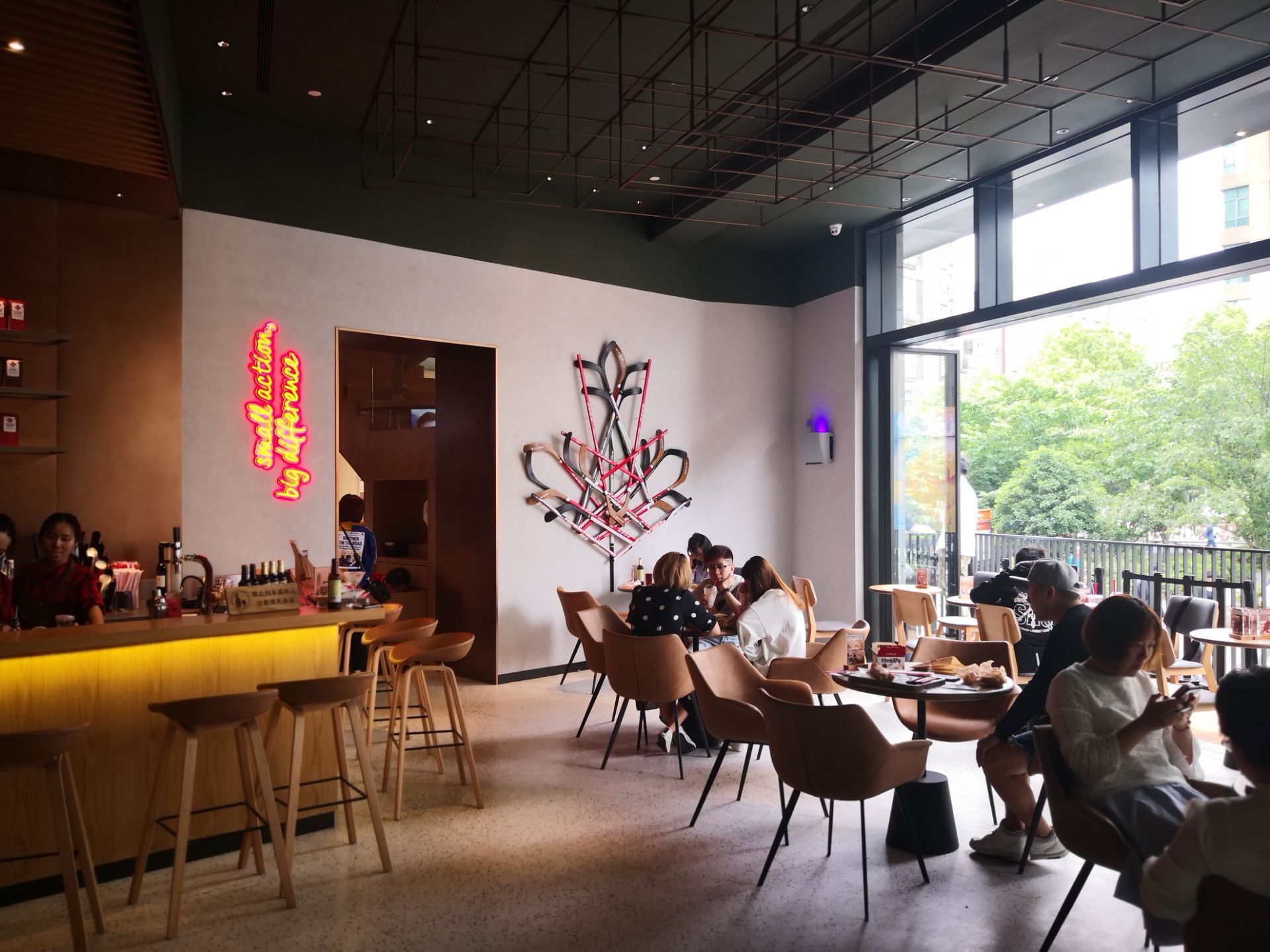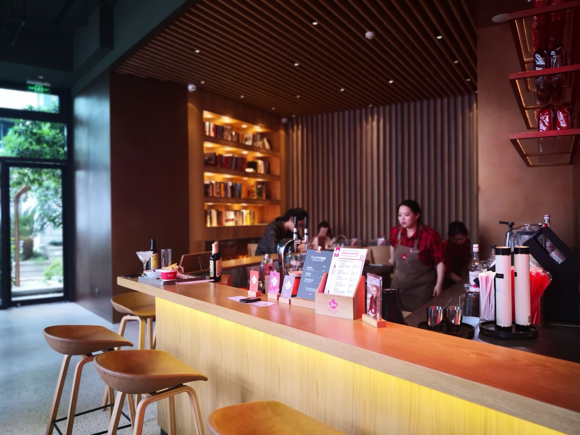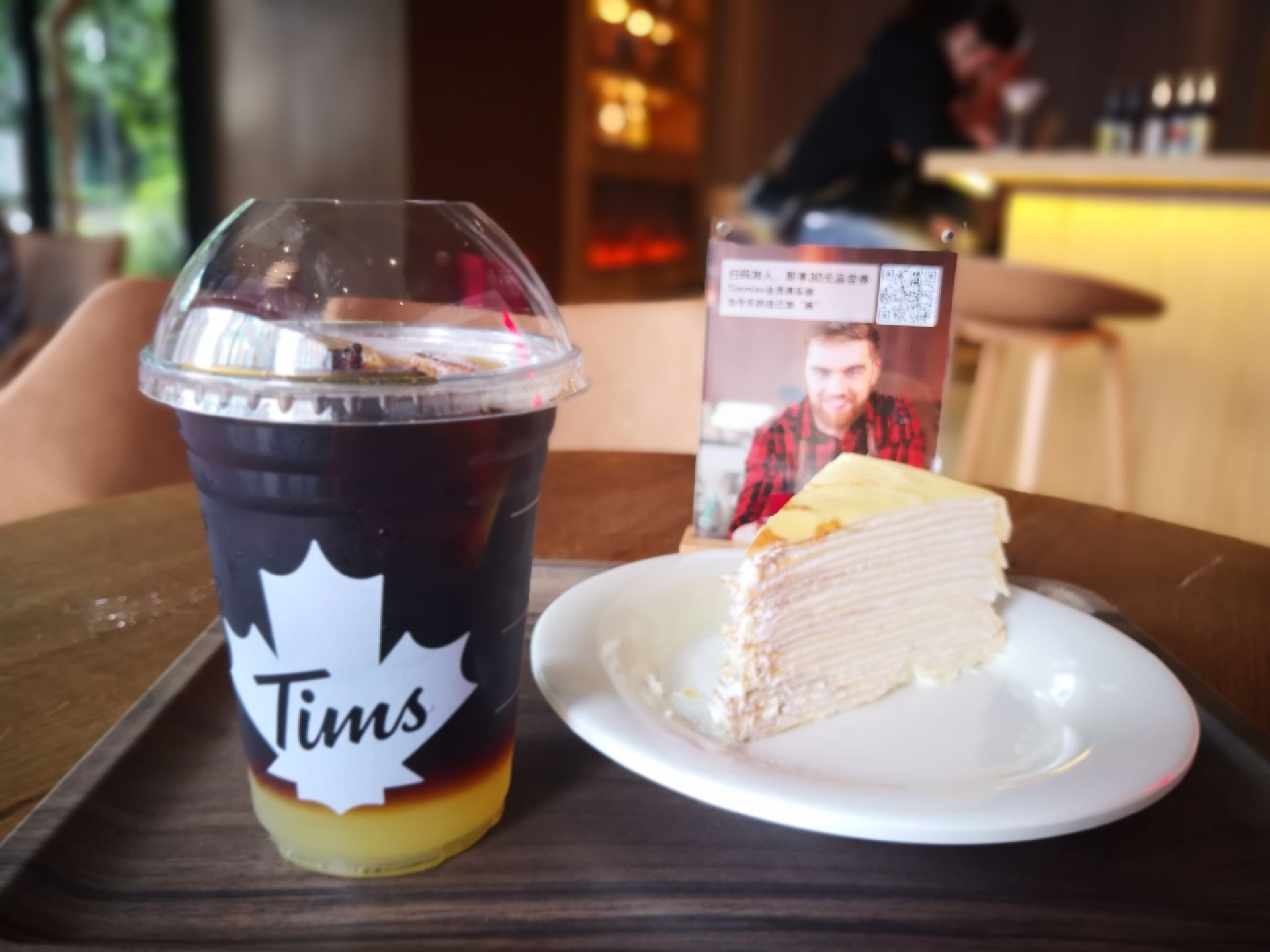 在伟德路上的独栋建筑里,Tims Coffee House建造了一栋仿北美小木屋的两层小楼。 一楼是半开放式的, 门口右手边的柜子里,摆放着Tims的各种人气周边。 进门就看到点单台和玻璃橱里的各种甜点。 点餐完毕,从取食台这里可以拐进一楼的就餐区,或者上二楼。 一楼的空间宽敞明亮,这里Tim还设立了一个酒吧吧台,这这里,你不但能喝到手冲咖啡,精酿啤酒,还有调酒师现场调制鸡尾酒。 二楼的空间我更加喜欢,给我一种可以侧地放松自己的感觉。 而每一个角落,妥妥的都是自拍的最佳角度。 于是,找一个舒服的位置,开始我的Tims Coffee 下午茶时间了。 因为还是下午时间,没有尝试店里的鸡尾酒,而是品尝了Tims的新品:香柠冷萃。 这是一款冷萃咖啡和香柠的组合,喝的时候,我并没有事先将两者混合,所以当喝的时候,酸甜的香柠穿过纯净柔和的冷萃咖啡,像在明亮之中增加了一抹甜美。 甜品搭配了千层芝士蛋糕,口感酸甜。 下次要找个有着清凉夜风的的晚上,来品尝Tims的鸡尾酒了。