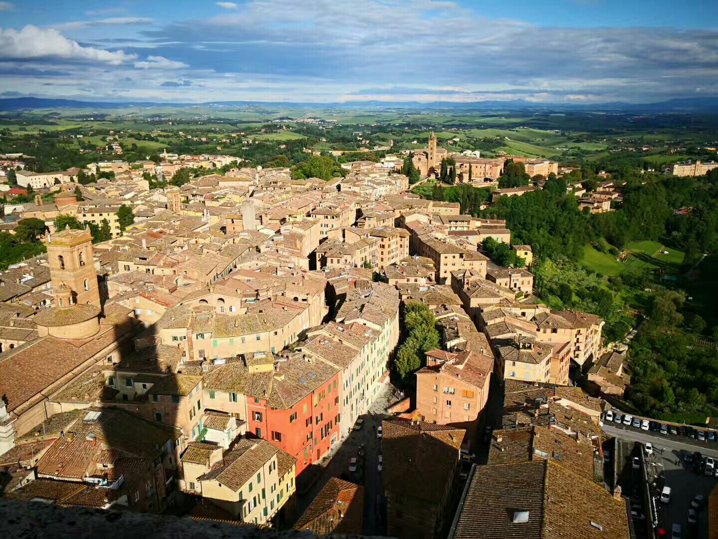 ...纳,老城中心的广场,高102米的曼贾塔楼,在最后售票的时间及时赶到,顺着狭窄的楼梯一口气爬上去中世纪小镇锡耶纳,老城中心的广场,高102米的曼贾塔楼,在最后售票的时间及时赶到,顺着狭窄的楼梯一口气爬上去。惬意地俯瞰形状呈九瓣的贝壳型田园广场以及小镇全貌。
