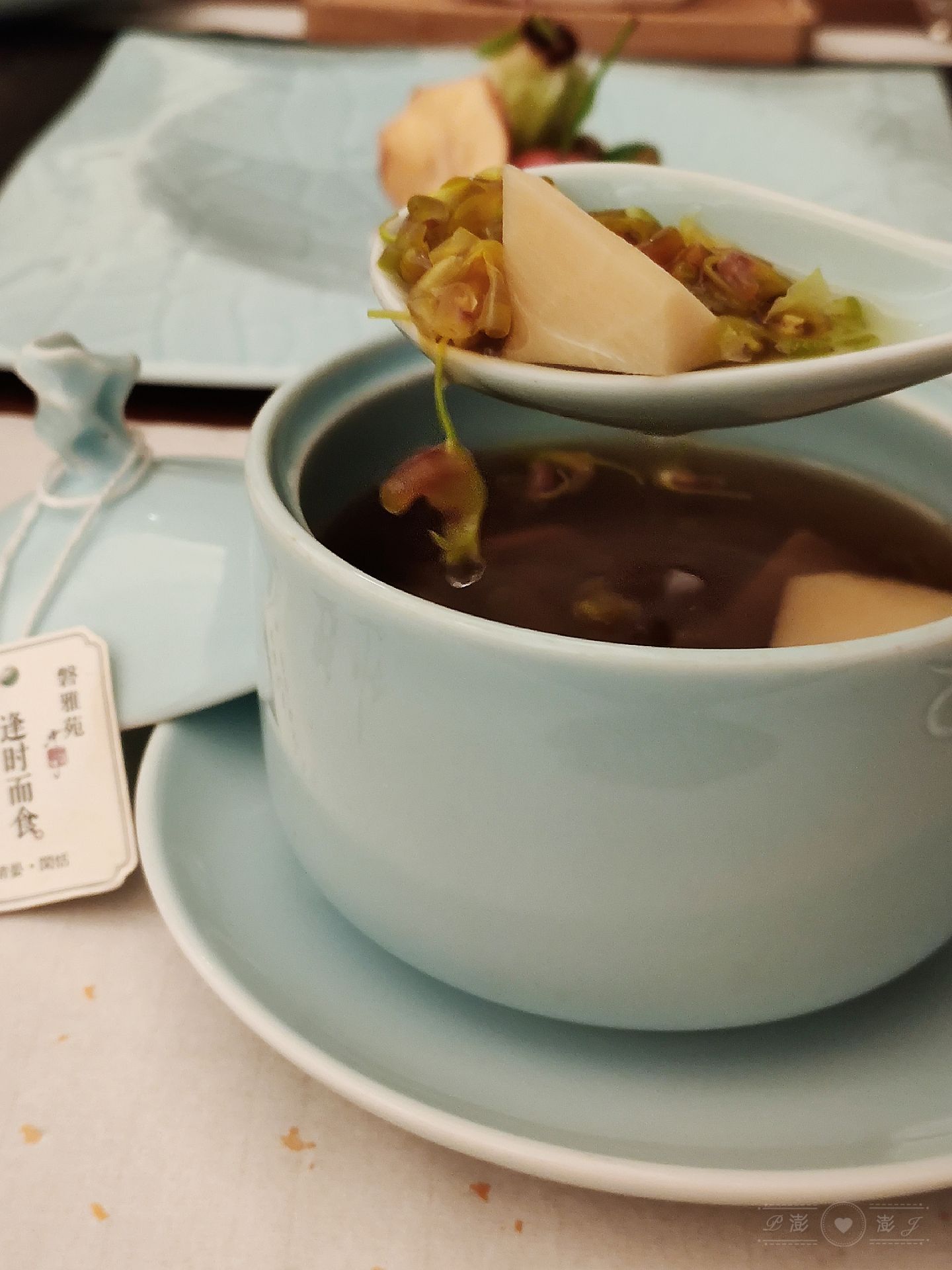 素食之美不止是美在颜值更是要美在舌尖,眼福口福统统要的磐雅苑素食餐不二之选 首先环境幽雅肃静,今晚还淅沥下了会小雨,坐在包厢的窗边意境浓浓,与朋友品着清茶,看着诗意般的食谱卡,闻着淡淡百花香,吃着美味素食,聊着往事未来…… 每道素食料理都给味蕾满足的体验,人均298的晚餐真心值了,菜品11道,主食不够可加,这里推荐几款特别喜欢的菜品 【欣欣斛花帝菌盅】非常养生的一盅汤,里面食材都非常珍贵,新疆皇菇、石斛、桃胶…… 【茉莉言臻食鲜饼】酥炸的茉莉花入口微苦,再入芬芳留香,用煎饼皮包裹别有一番风味 【清疏芡实奉碧炒】芡实与甜豆配合的天衣无缝,软糯香甜 【既满新豆菌焖面】非常惊喜的一道主食,菌菇的香味焖入面里,忍不住吃了两碗真心满足 其他菜品也是非常棒,推荐尝试尝试才知道其中的美!