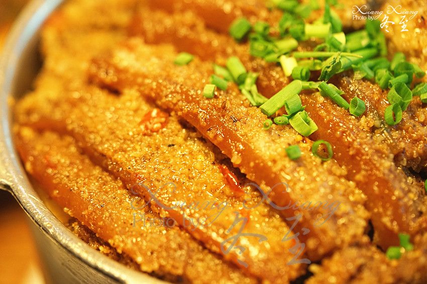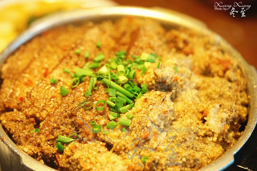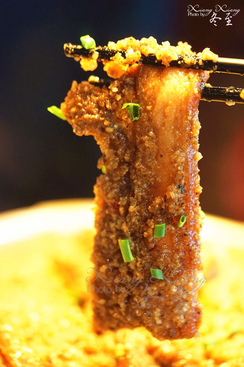 【高压锅蒸肉】是很多类似的餐馆都有的一道菜。比较费解的是,垫底的红薯居然没有蒸耙