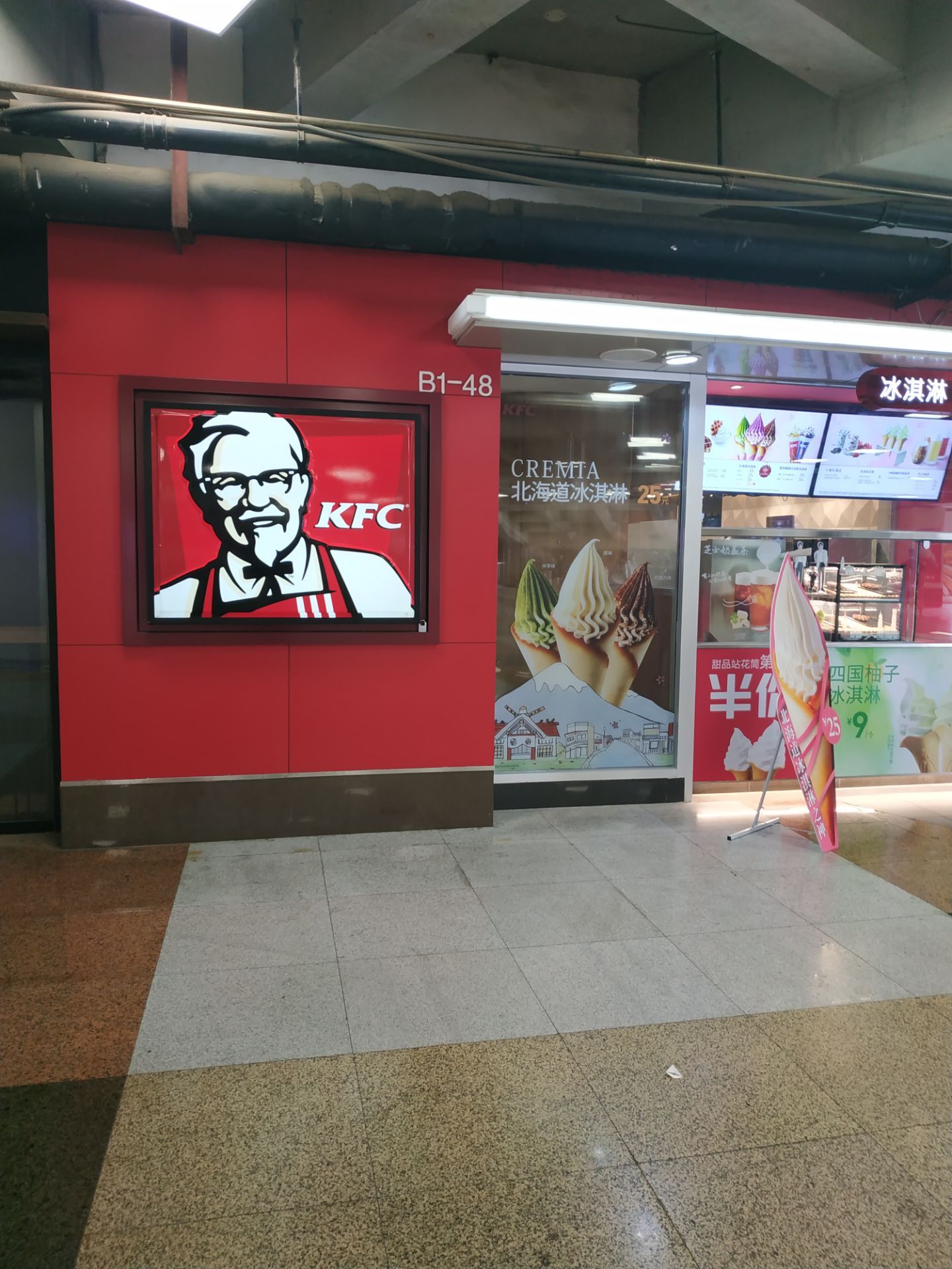 门脸不大,而且位置较为偏僻,一般不注意找不到。里面和其他肯德基一样这家肯德基店位于西直门凯德茂的地下一层,旁边是地铁出入口。门脸不大,而且位置较为偏僻,一般不注意找不到。里面和其他肯德基一样。该有的都有。