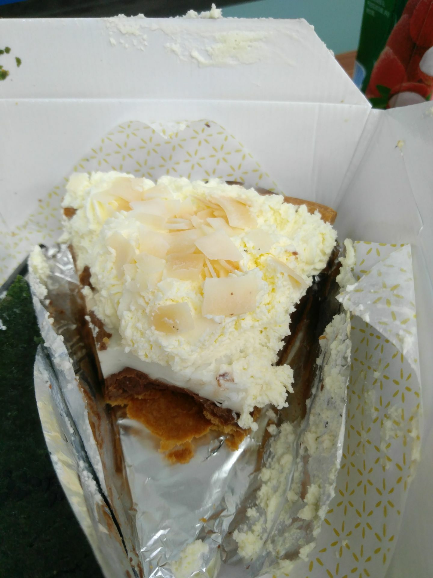 他家以各种美式甜品为主打啊,环境还是很不错的,到底这个地段放在哪里的。现在还有活动满100送果酱哦。可惜CC是买不到100了。 招牌的椰子奶油派的确很值得推荐,淡奶油打发的很好,甜而不腻,中间还有椰子果冻,地下则是巧克力,整体感觉没有美式甜品那种甜到齁的感觉,很清淡。 抹茶黑芝麻,一把把,感觉抹茶和黑芝麻的搭配有点怪怪的,还是分开来回好一点。