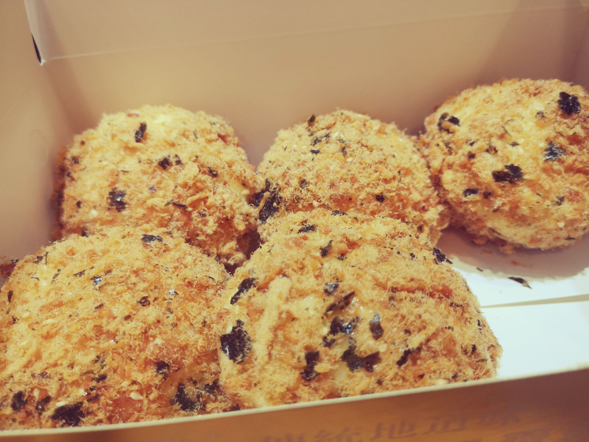 ...贝^一盒五只,个头不小,海苔粒脆脆的,肉松鲜香,蛋糕湿润有弹性,里面的馅料似乎是芝士,口感浓郁