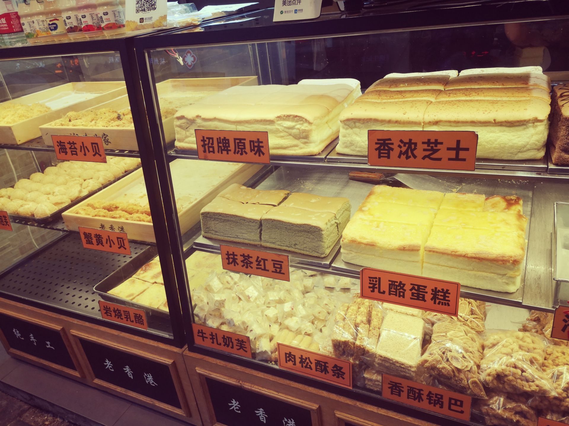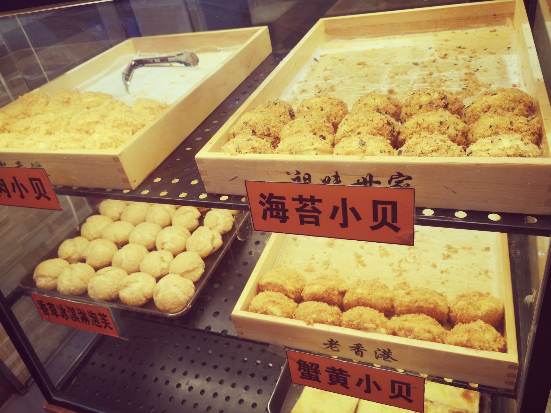 [环境]老香港祖味世家,凤起路381号,古朴的店面,私房手工蛋糕,品种丰富,色泽诱人,摆在玻璃橱窗里,就如同一个个甜美的童话。 [服务]服务员小姐姐态度不错,热情介绍,利索打包。 |海苔小贝^一盒五只,个头不小,海苔粒脆脆的,肉松鲜香,蛋糕湿润有弹性,里面的馅料似乎是芝士,口感浓郁。 老香港祖味世家,海苔小贝一口酥松。