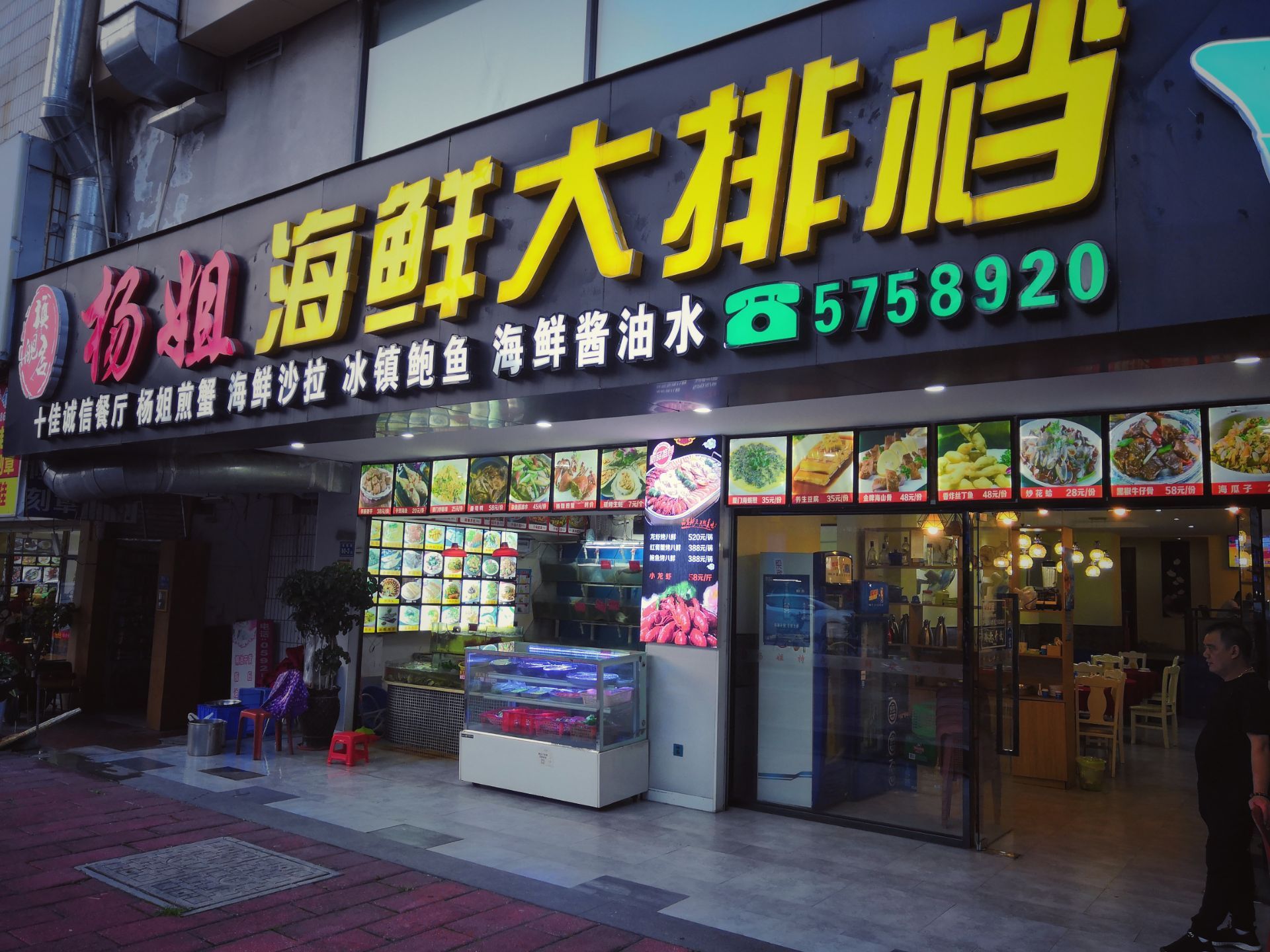 店门口有一排公共停车位,不过位置比较紧张,不一定有地方停,如果开车来,可以停到天安工业村停车场,离店只有大约100多米的距离,挺方便的,停车场收费也不贵,四个小时内五元。 店面不大,就一层楼,进门左手边一个海鲜池,大堂几张圆桌,有一间可以容纳12人的包间。 【鱿鱼芋丝】外观挺有特色的一道菜,芋丝松软,鱿鱼QQ的。 【铁板虾】味道不错,宝贝一个人吃了半盘。 【紫菜饭】已经炒好的大锅饭,选用的米应该是珍珠米,个人比较喜欢细长Q弹的泰国米。 开在居民区的大排档,价格接地气,适合周边居民消费,环境中规中矩,老板和员工都挺热情的。