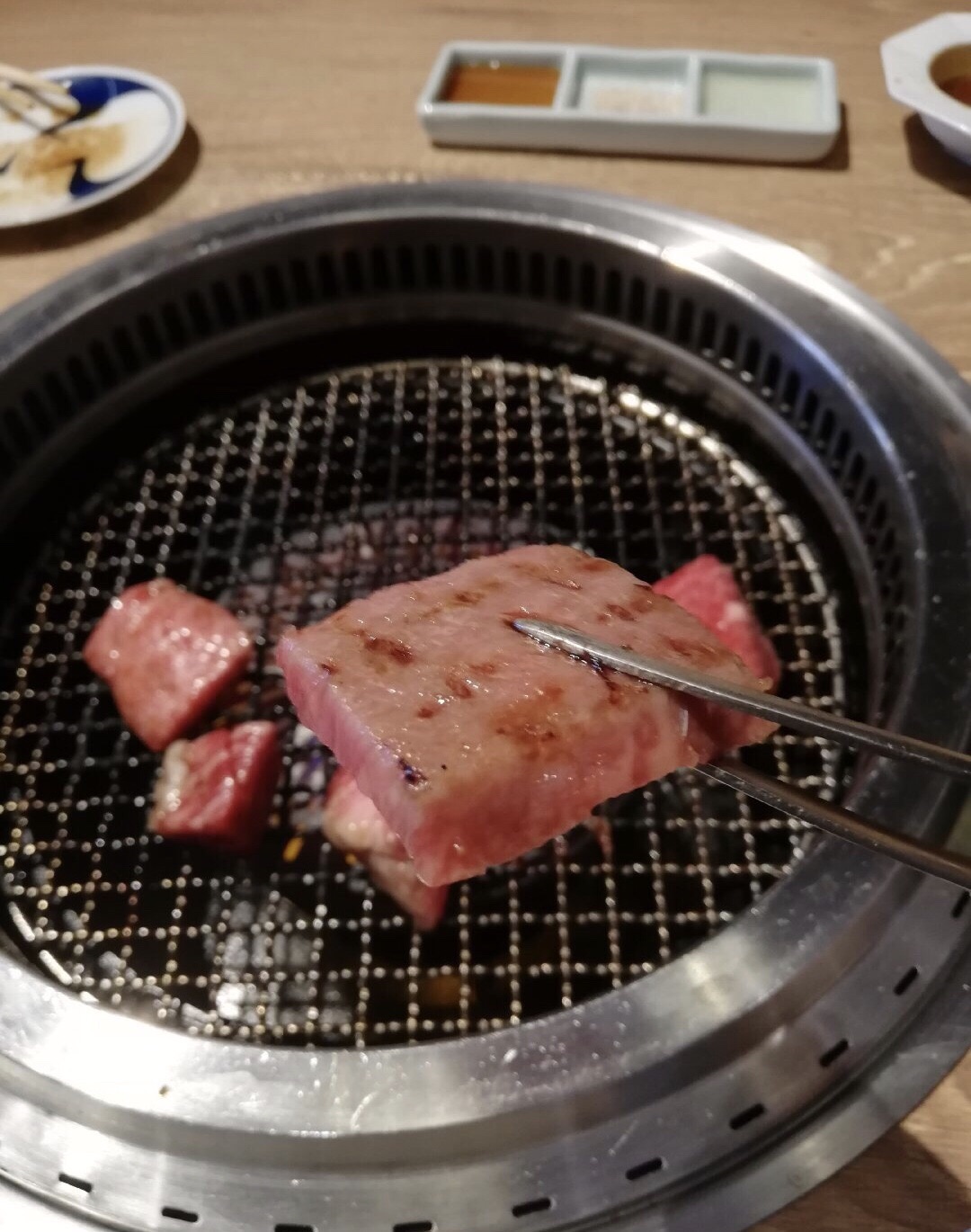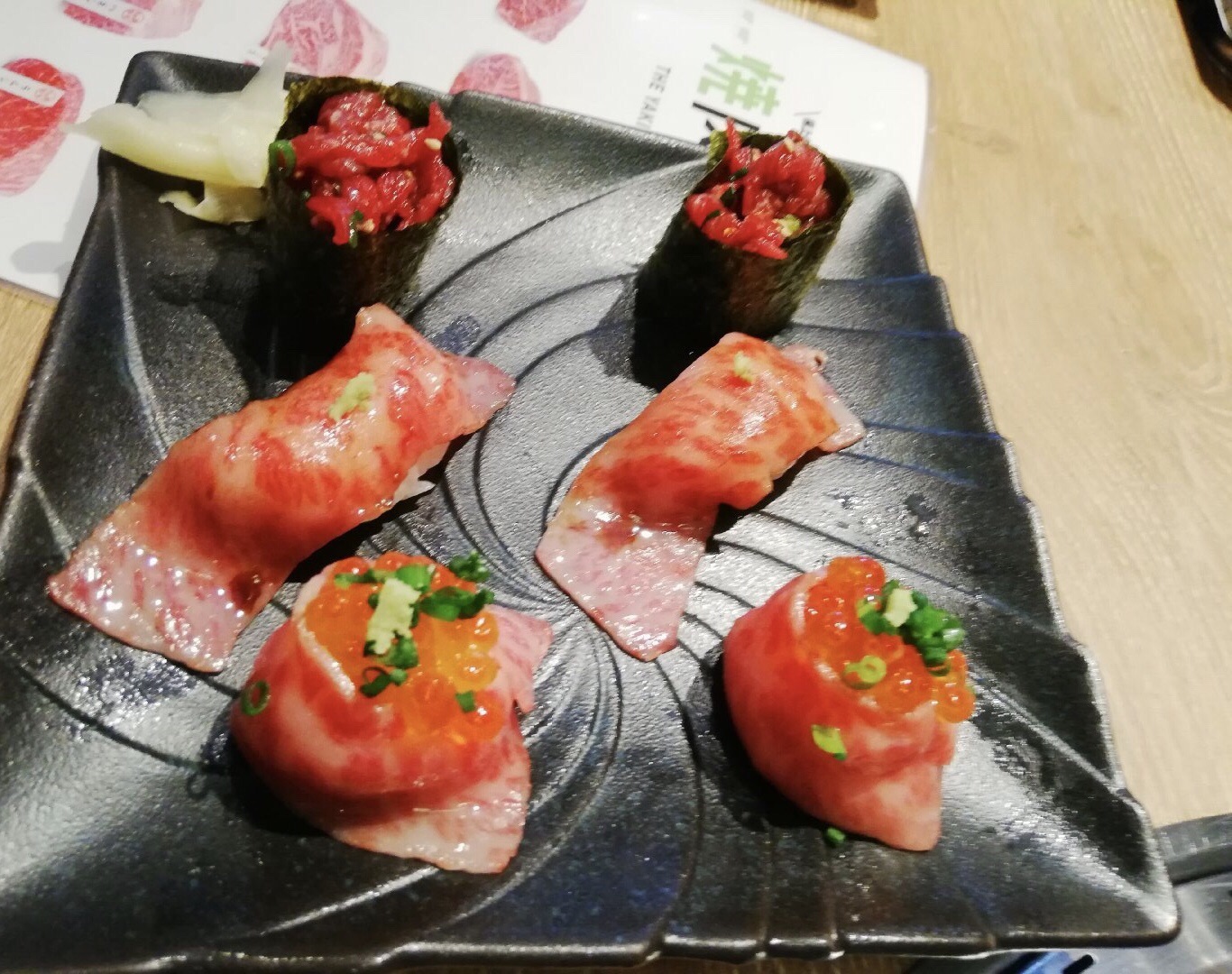 跟回转寿司店一样,上菜都是传送带 要的一份烤肉拼盘和和牛寿司。今天午餐去心斋桥旁边吃的烤肉