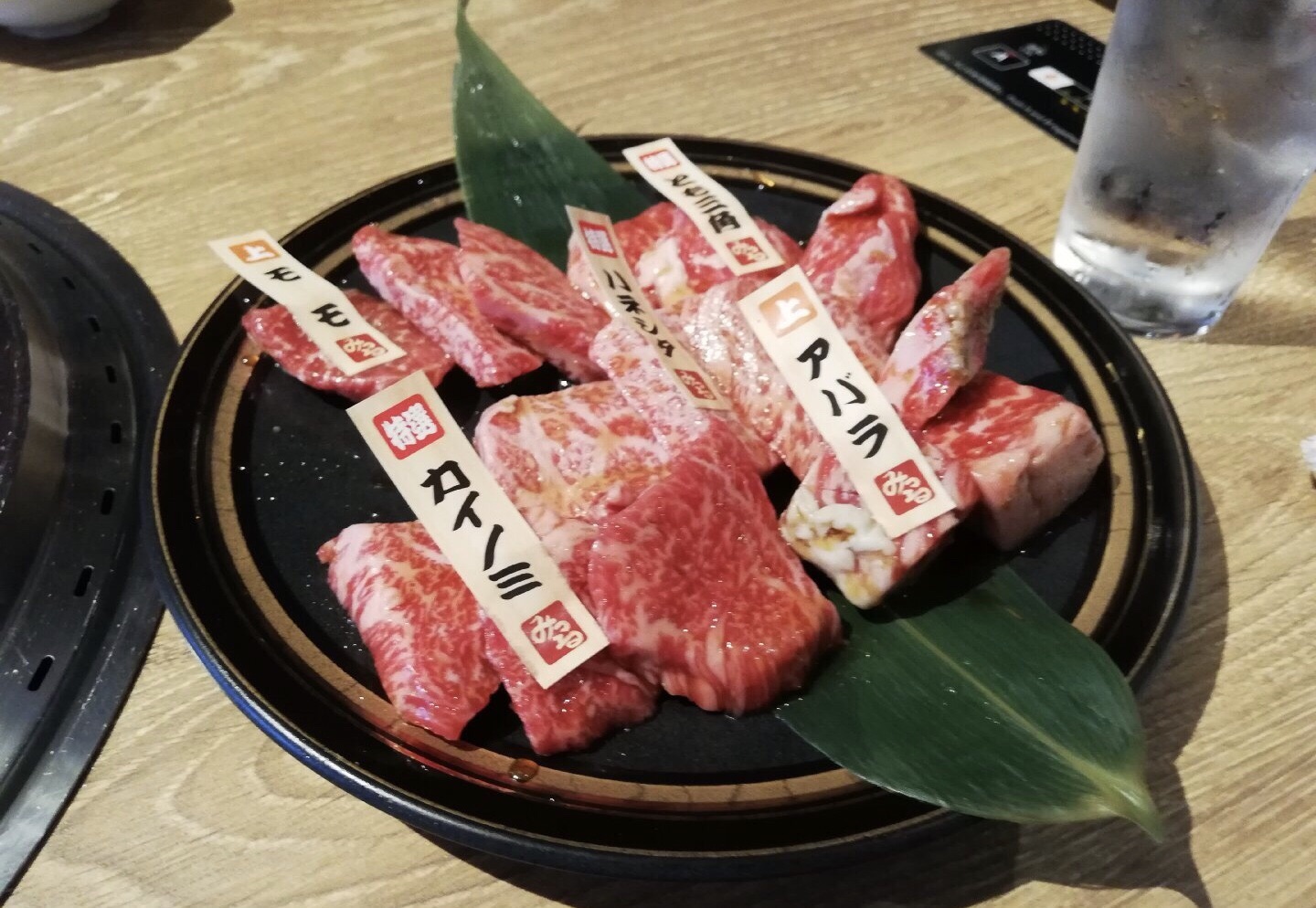 今天午餐去心斋桥旁边吃的烤肉。 跟回转寿司店一样,上菜都是传送带 要的一份烤肉拼盘和和牛寿司。 用平板点单,有中文菜单,我们点的是吃吃比比5种拼盘大概200人民币,肉寿司三贯大概60元。性价比比较高。推荐给大家。道頓堀黑毛和牛心斎橋店