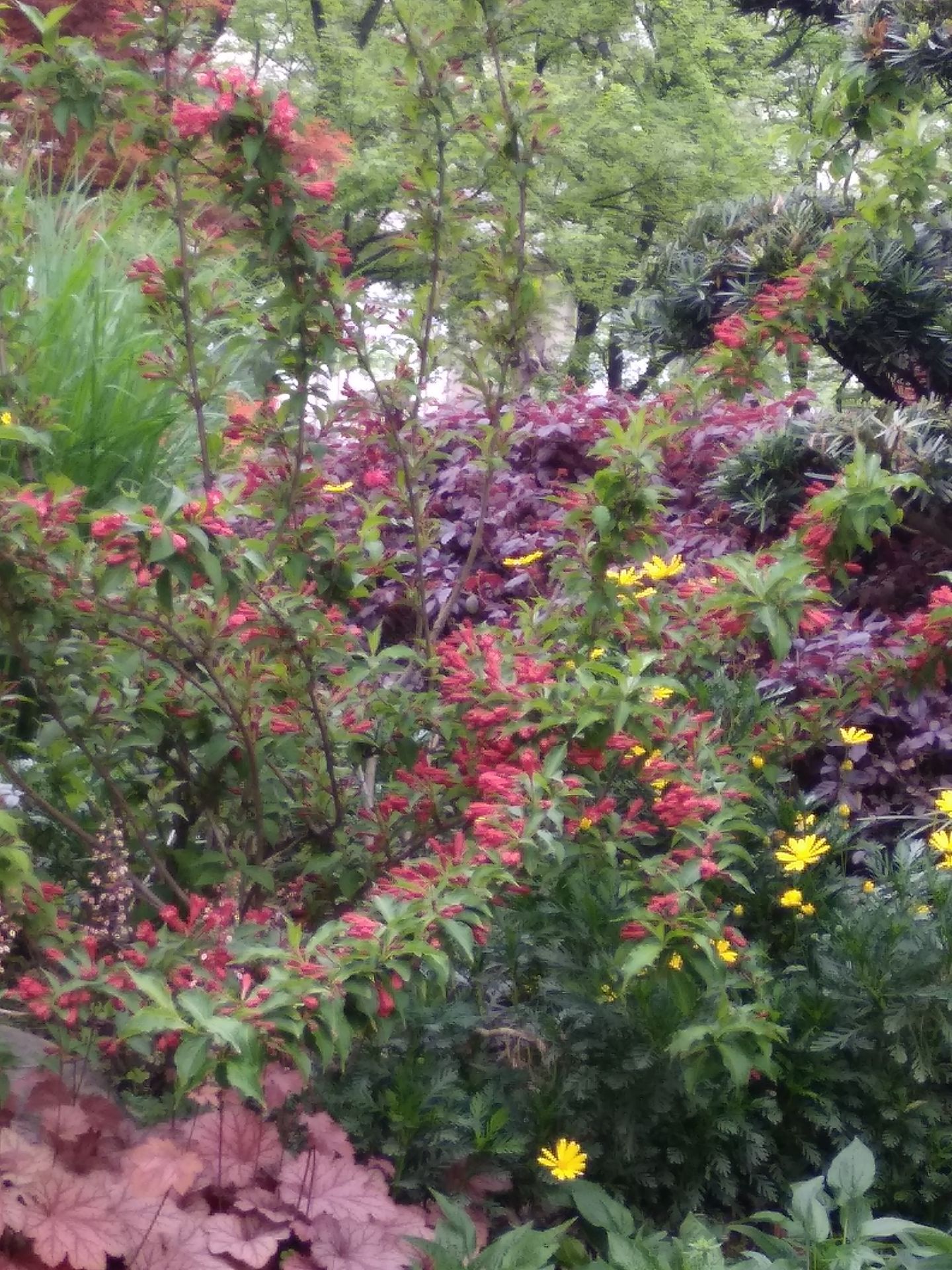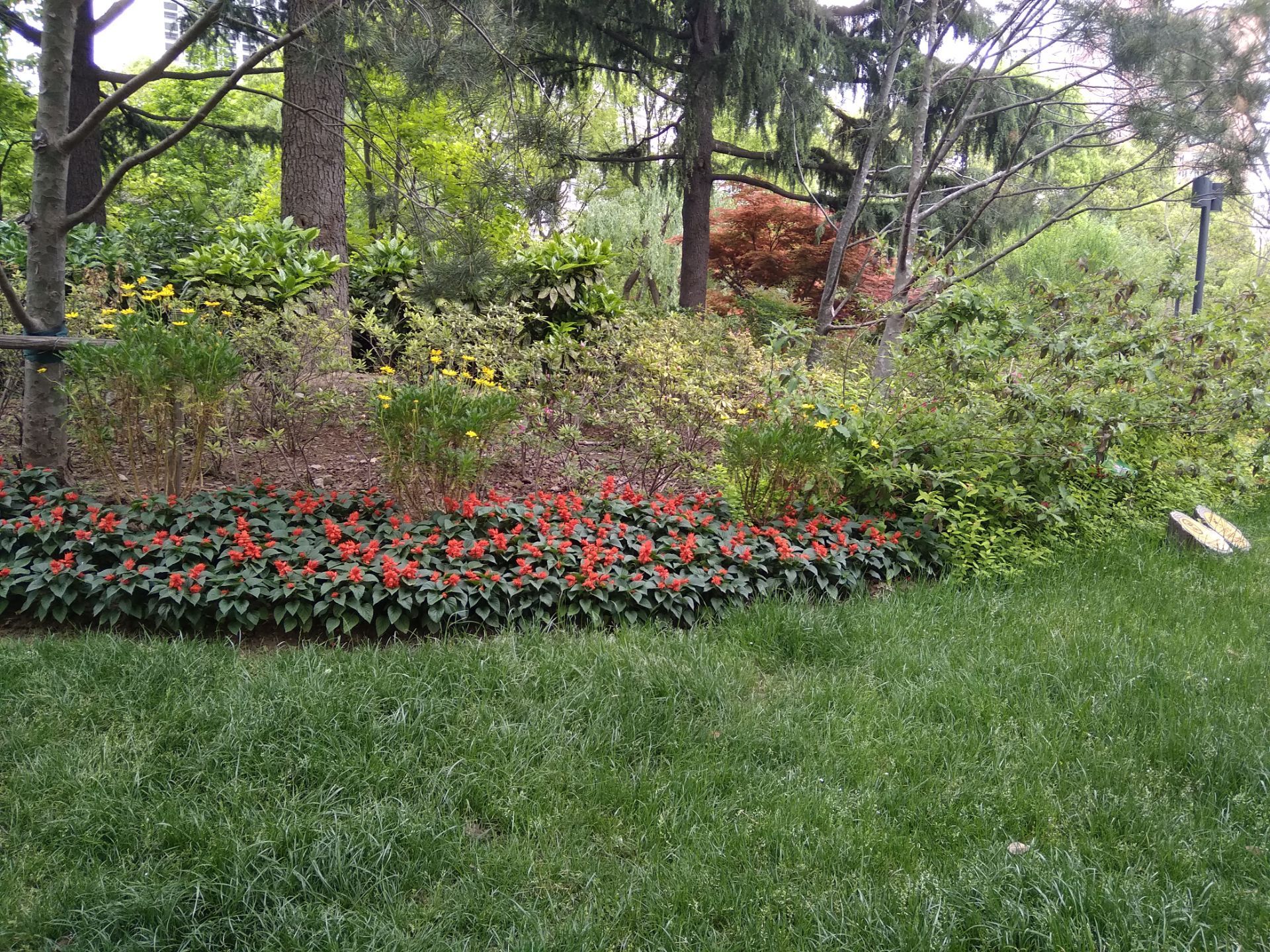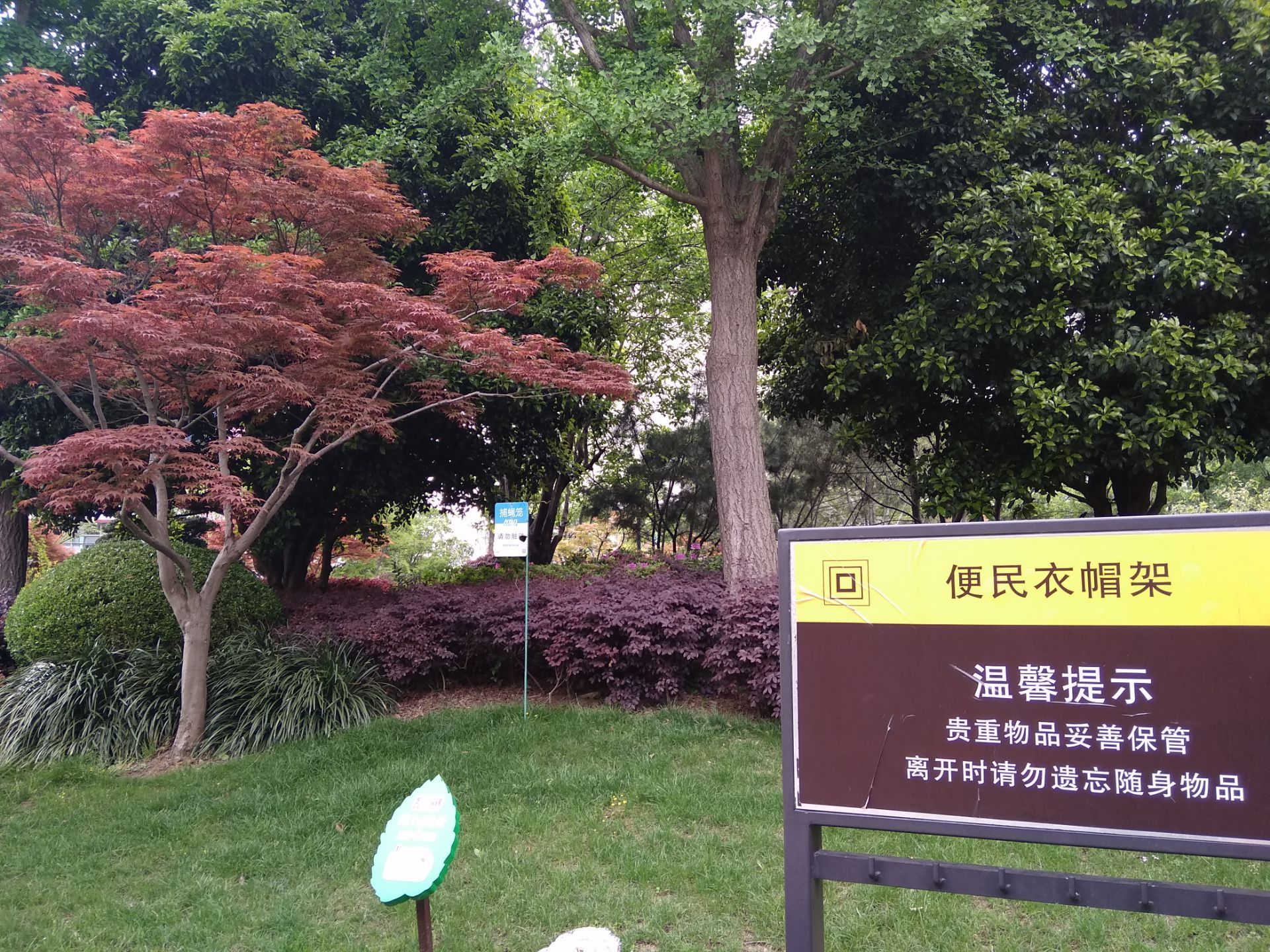 四川北路公园:那次因为去某店,到的早,就在这里逛逛,公园感觉不大,不过绿化挺好的,正是春季,花儿开得正好,有的树也是比较高大的。 公园是没有围栏,不收费,可以自由进出。 感觉大上午的就有不少人在公园散步啦!公园里还有供人挂衣服的便民衣帽架。