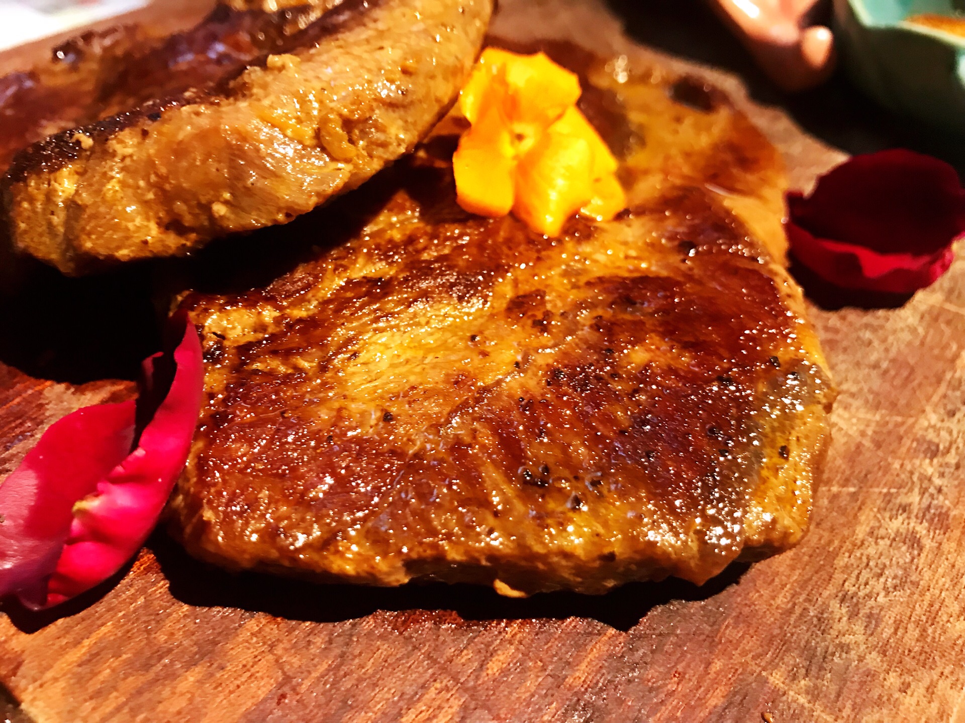 香煎牛板筋 煎得正好,七成熟,肉质鲜嫩,略带点粉红色。不放任何酱汁,撒点盐更加原汁原味