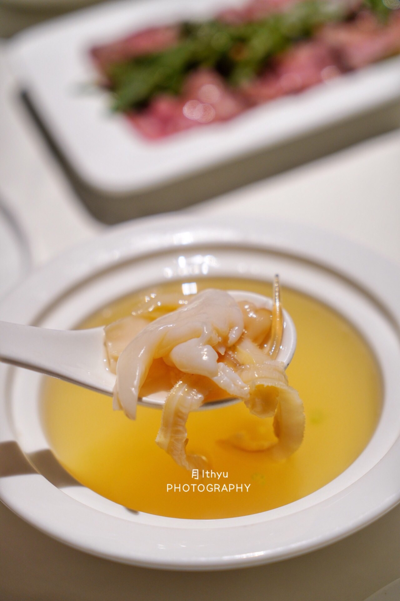 鸡汤氽贵妃蚌,新鲜的贵妃蚌放在汤碗中,加入烧热的鸡汤,稍等片刻食用就非常鲜美