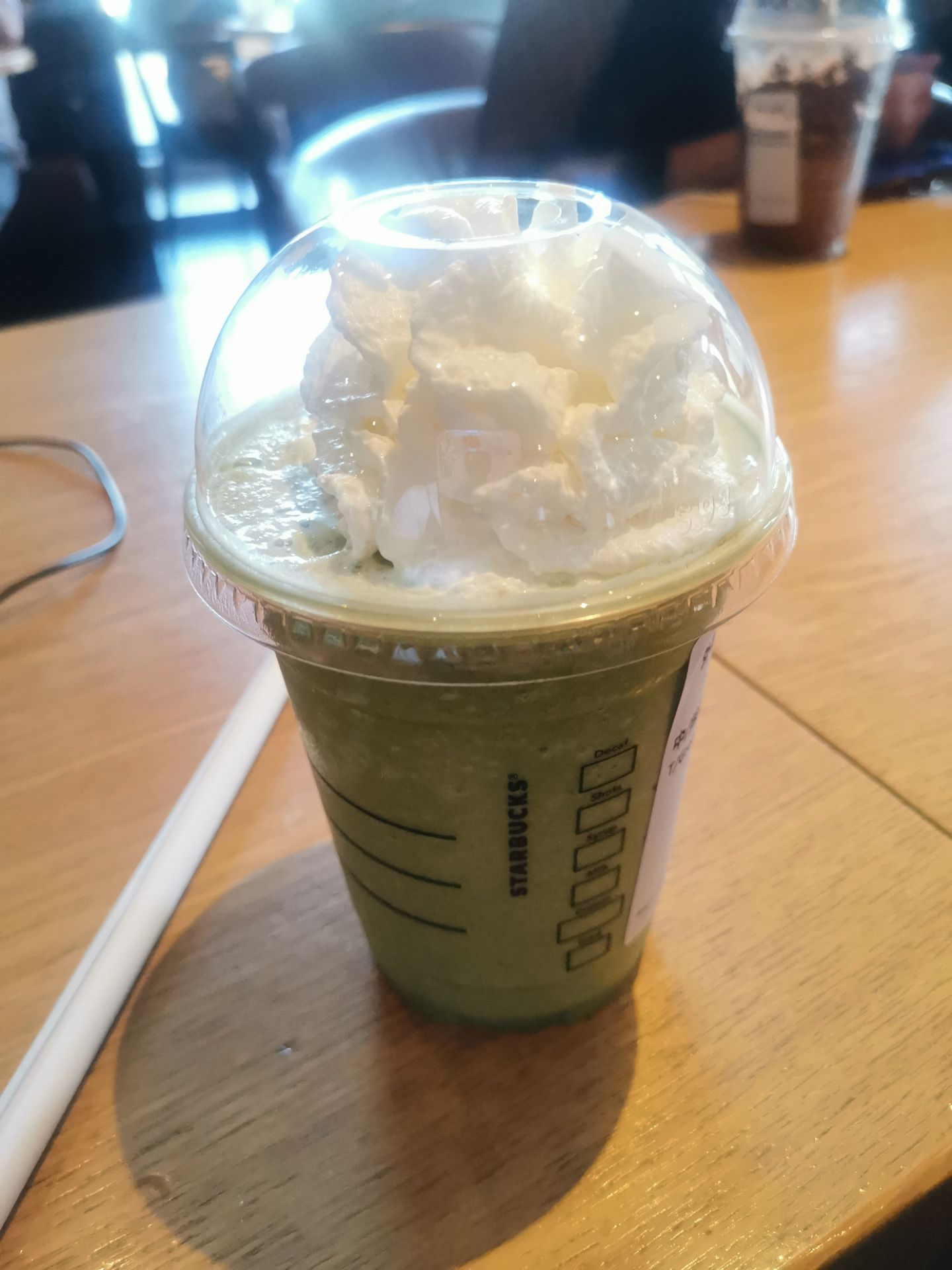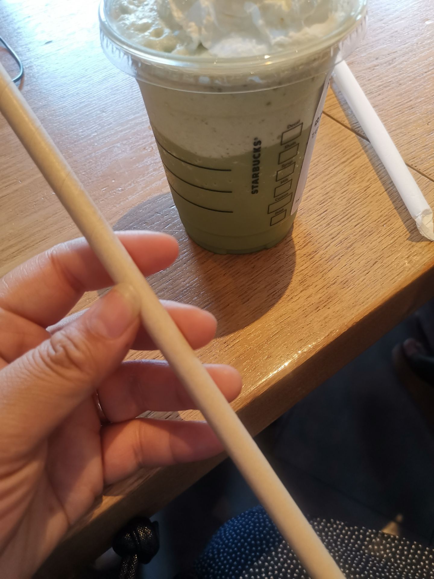去莘庄百盛谈公事,就找了边上的星巴克,这里的星巴克工作日任何时间人都很多,地方虽然大但是很多人都不走所以还是比较难找位置的。 夏天他们家的星冰乐就是我的最爱,特别是抹茶星冰乐,虽然有点甜但是入口还是很爽的,这次突然发现吸管变成纸质的了,真怕被饮料泡软。