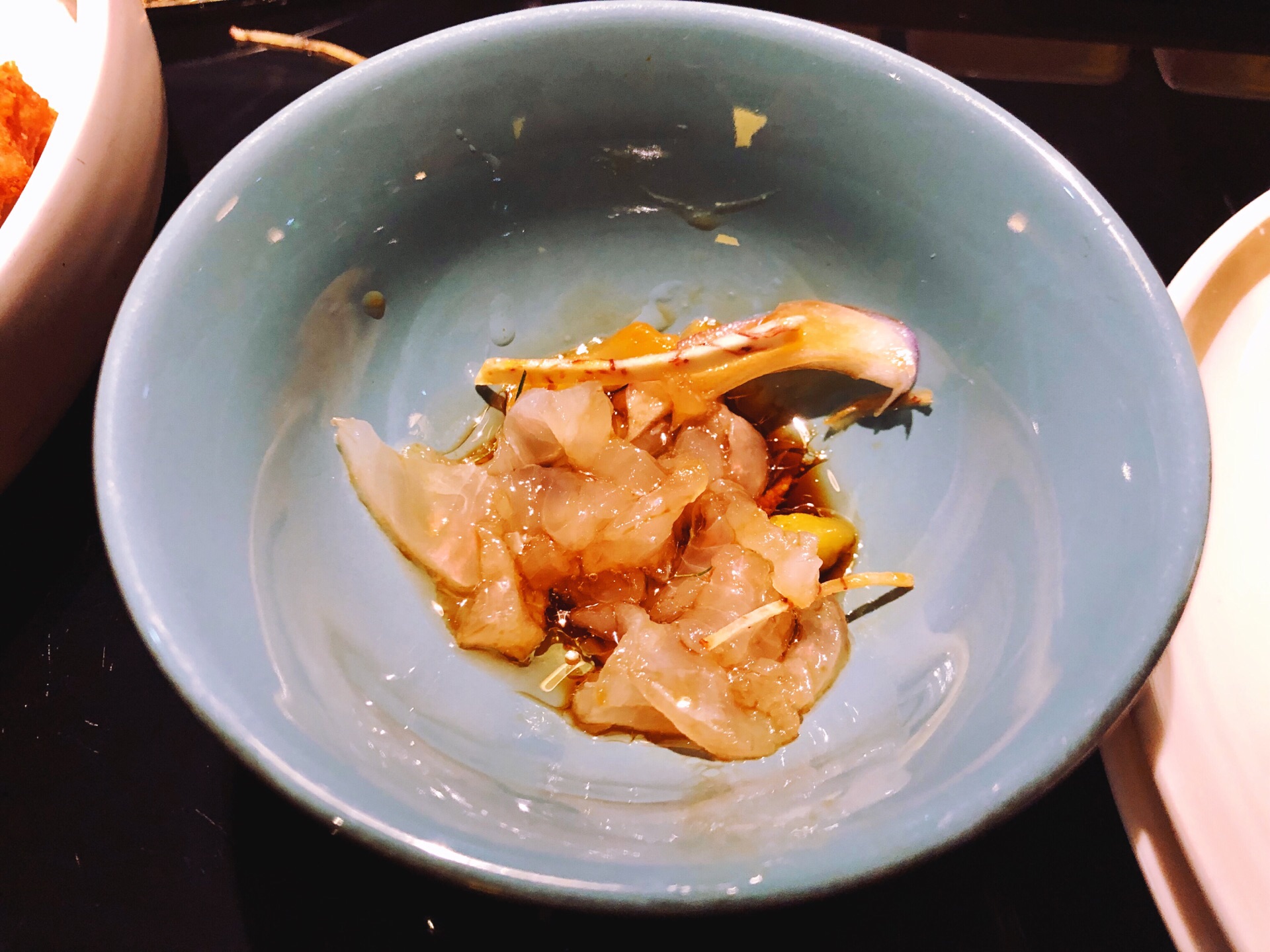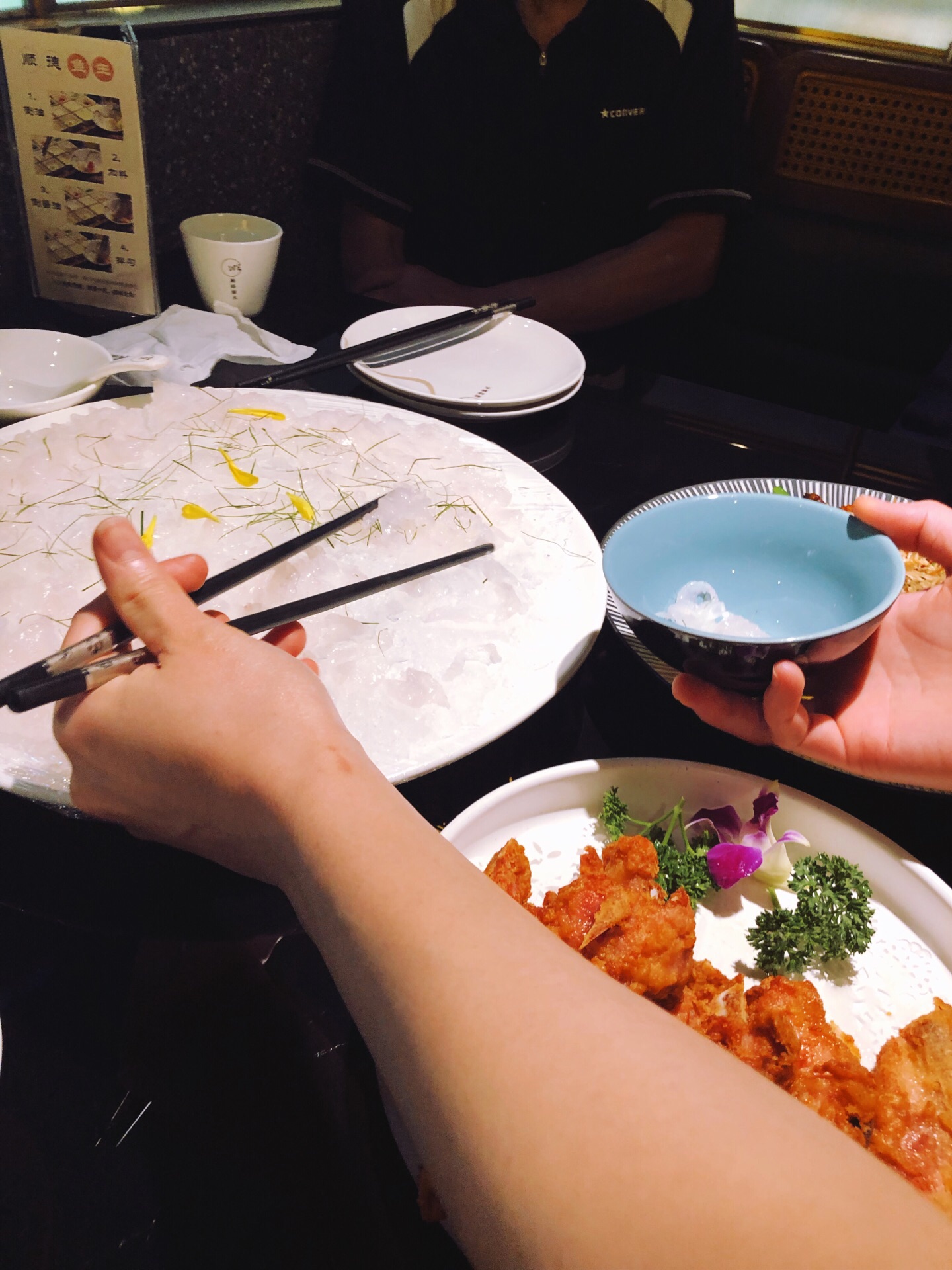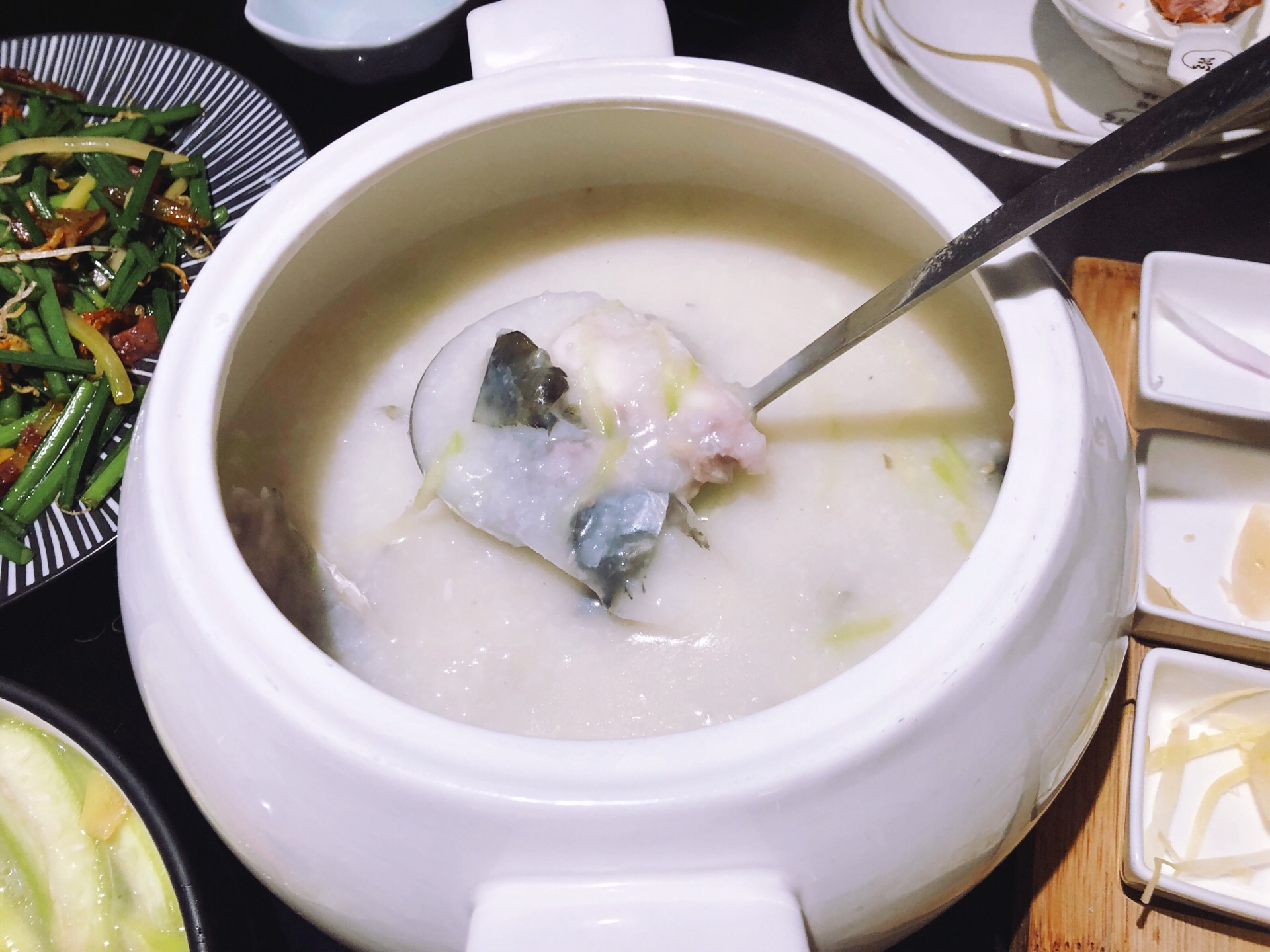 带父母来吃顺德菜不错,口味清淡,适合一家人,过节要有仪式感,出门尝试各种美食才是人生~~~ 第一次尝试一鱼四吃,老公一直想吃鱼生,这下吃满足啦! #顺德鱼生# 据说日本人的生鱼片就是学我们的鱼生的。冰上铺了保鲜膜,上面放满了鱼生。店员会指导吃法:1.将鱼生放在碗里,倒上花生油。2. 根据自己的口味放入各种调味。3. 淋上酱油,就可以吃啦!鱼生很新鲜,很顺滑,但我居然吃出了冬阴功的味道,不知道是哪几个调料起了反应哈哈! #椒盐鱼骨# 虽说是鱼骨,肉也不少,炸得酥脆,口味刚刚好。 #鱼头鱼尾粥# 加了30块钱加工费做了粥,这样的四吃一点也不浪费!妈妈说粥很鲜美,老公正好前一晚辣吃多了,肠胃不适,来一碗暖心的粥最合适不过了。 #凉拌鱼皮# 一直很爱吃鱼皮,记得上一次吃是在无锡酒店吃自助下午茶提供的。品质当然没得比。这里的鱼皮顺滑Q弹,麻麻辣辣很爽口!