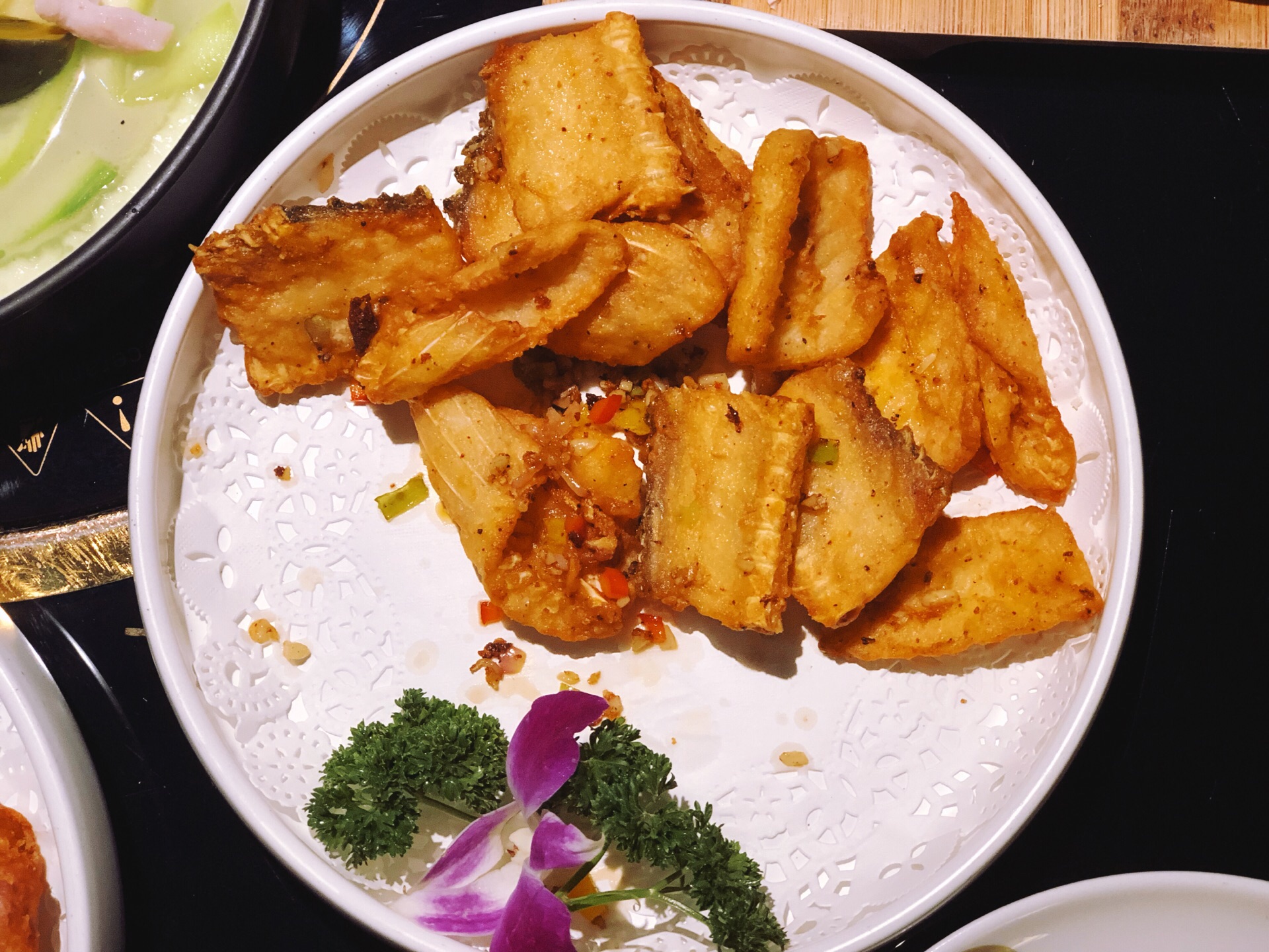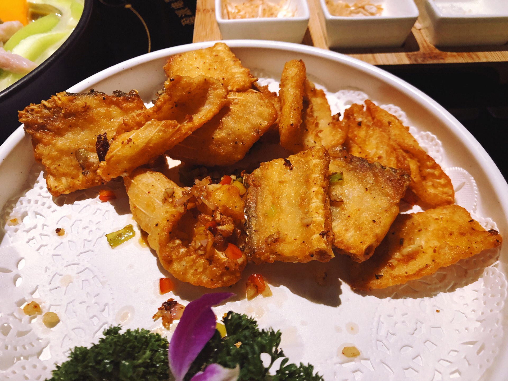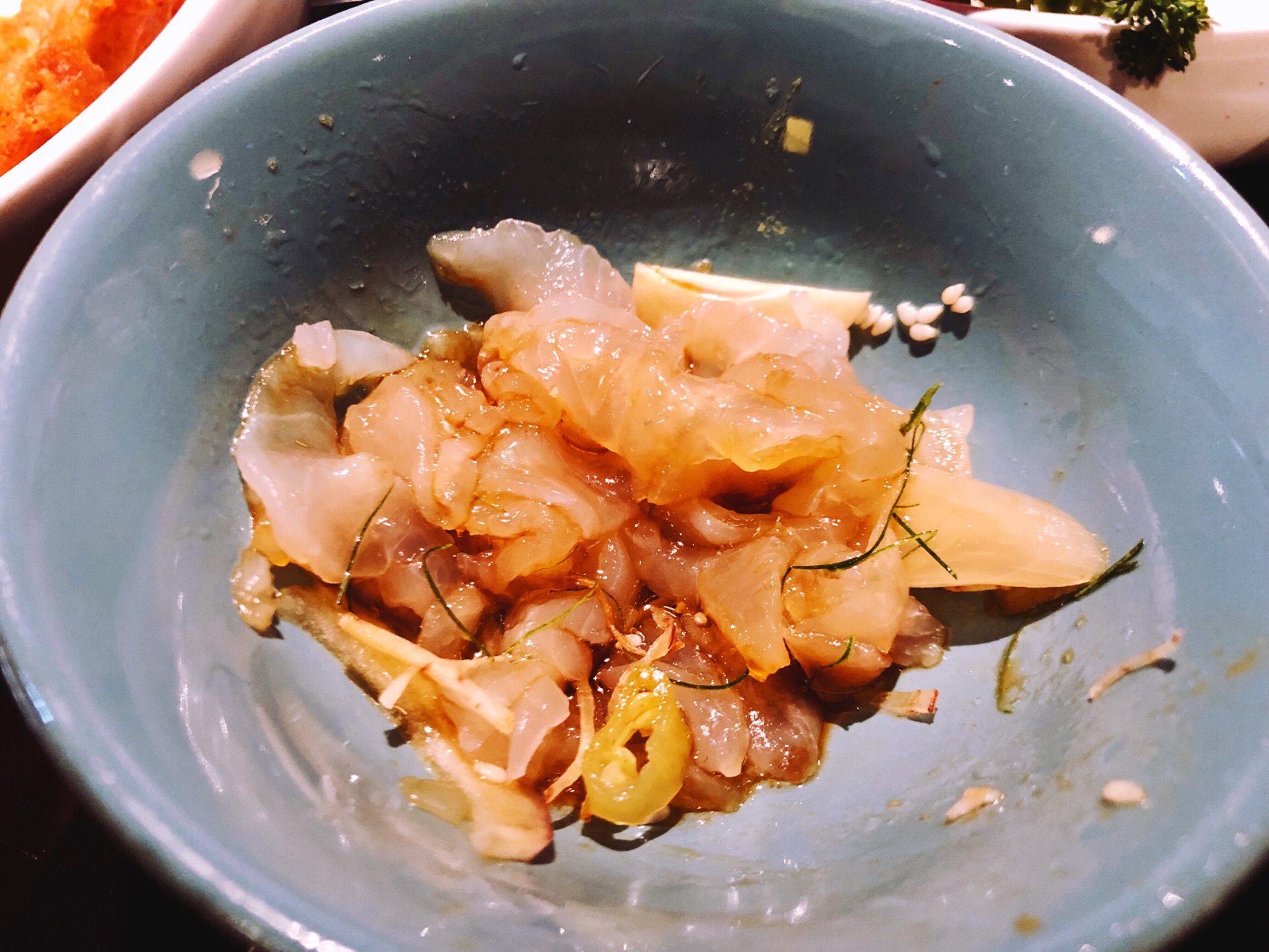 带父母来吃顺德菜不错,口味清淡,适合一家人,过节要有仪式感,出门尝试各种美食才是人生~~~ 第一次尝试一鱼四吃,老公一直想吃鱼生,这下吃满足啦! #顺德鱼生# 据说日本人的生鱼片就是学我们的鱼生的。冰上铺了保鲜膜,上面放满了鱼生。店员会指导吃法:1.将鱼生放在碗里,倒上花生油。2. 根据自己的口味放入各种调味。3. 淋上酱油,就可以吃啦!鱼生很新鲜,很顺滑,但我居然吃出了冬阴功的味道,不知道是哪几个调料起了反应哈哈! #椒盐鱼骨# 虽说是鱼骨,肉也不少,炸得酥脆,口味刚刚好。 #鱼头鱼尾粥# 加了30块钱加工费做了粥,这样的四吃一点也不浪费!妈妈说粥很鲜美,老公正好前一晚辣吃多了,肠胃不适,来一碗暖心的粥最合适不过了。 #凉拌鱼皮# 一直很爱吃鱼皮,记得上一次吃是在无锡酒店吃自助下午茶提供的。品质当然没得比。这里的鱼皮顺滑Q弹,麻麻辣辣很爽口!