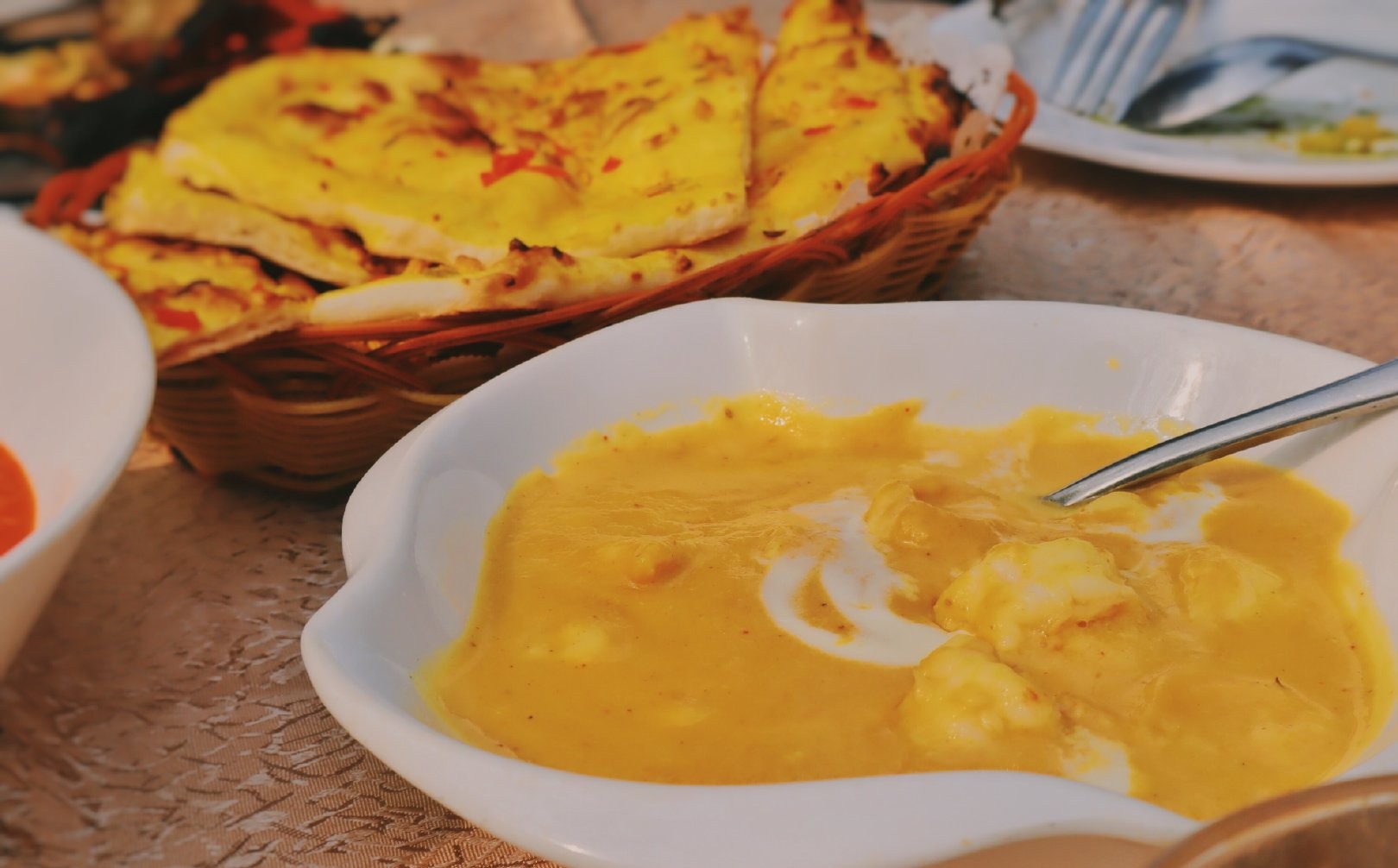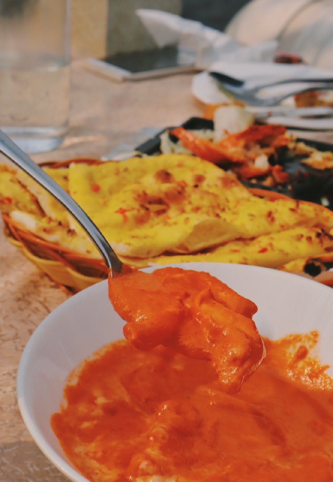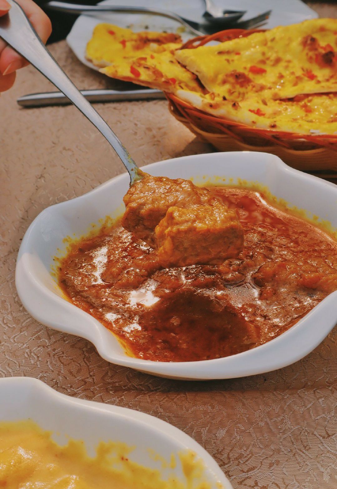 Santoor萨都里印度餐厅 北锣鼓巷甲70号二层 【 Butter Chicken特色奶油鸡 】 红咖喱+奶油的搭配 甜大于辣 并且也不会太油腻 鸡肉的口感比较嫩 很符合我的口味 蘸饼吃不错 【 马来椰汁大虾 】 其实是虾仁且个头不大 椰汁本味不浓 甜度过高 【 咖喱牛肉 】 看图就知道实在是太油了 【 咖喱角 】牛肉/蔬菜 肉的比素的好吃 咖喱味浓郁 表皮酥脆 牛肉内馅扎实 咸度适中 蔬菜的就是面粉裹土豆 【 烤肉拼盘 】 牛肉不知道是什么部位 很老 嚼不动 羊肉有点膻 奥尔良鸡肉还行 鳕鱼算是这一盘的亮点 【 萨都里特色烤饼 】 普普通通一烤饼 口感不错 松软有韧性 但没有调味 蘸咖喱吃还可
