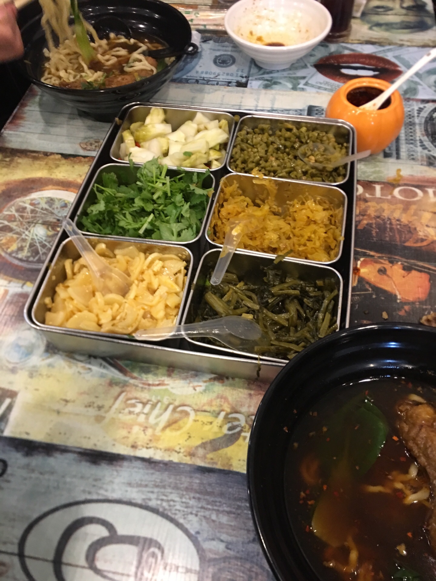 雁荡山旅游胜地,灵峰景区附近有一片停车场,停车场周围都是农家乐、饭店、住宿…晚上有一家馄饨店开得很晚关门,看着当地人还会开车过来吃,于是就凑热闹去吃吃… 吃的就是面条馄饨,味道一般。价格在当地算是有一点小贵,就是老板有些小家子气……面的调料是可以自己加的,老板盘子里放着6个品种。不知道味道如何,就每样拿了一点点尝味道,刚拿好还没有坐下来吃,老板见状赶快把这盒配菜拿走了…哎!既然老板你这么心疼,那就别拿出来呀!当地人加了许多你怎么不敢去抢这盘配菜?看见游客你就……坚决不会再去的