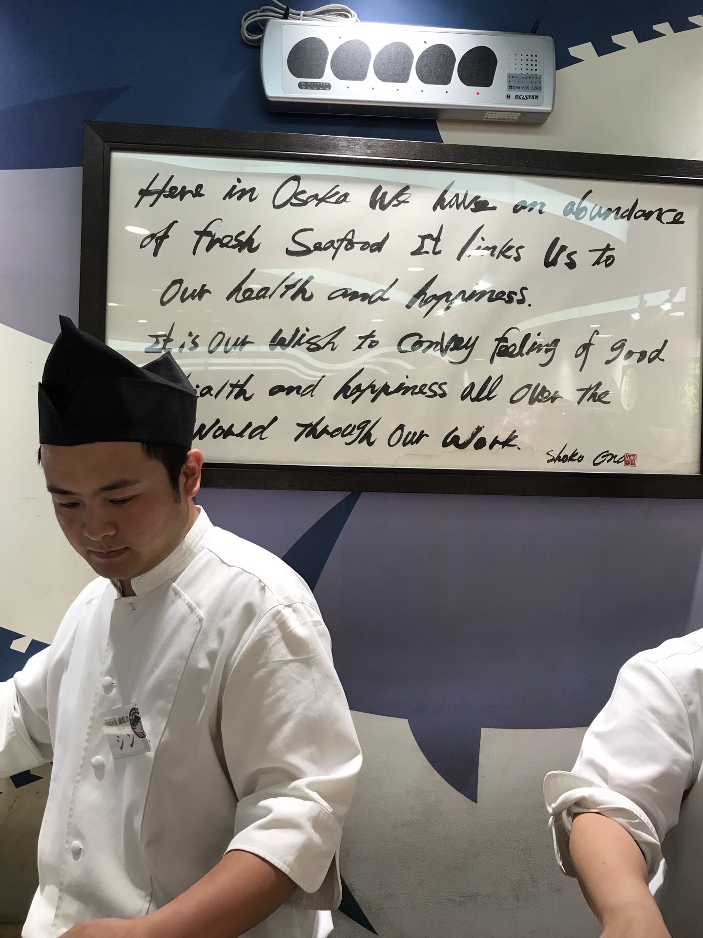 在回转寿司的大队伍中还是不错的哦! 他们需要就餐的人全部到齐后才能进去在回转寿司的大队伍中还是不错的哦! 他们需要就餐的人全部到齐后才能进去。 寿司的话,虽然都是大起,但是一楼的品种比二楼多多了! 我们去的时候还正好赶上他们在解剖整条的金枪鱼,挺有意思的。