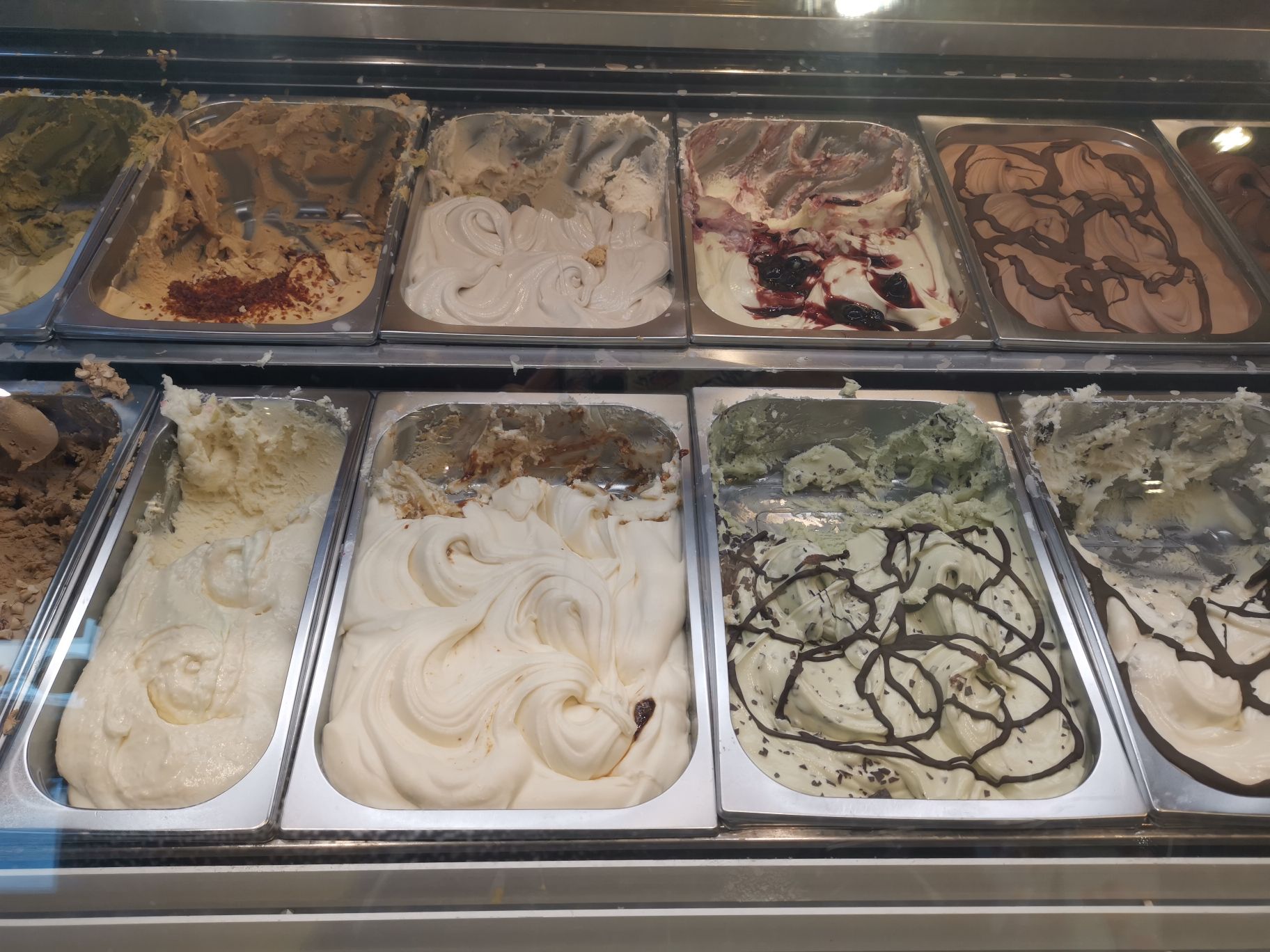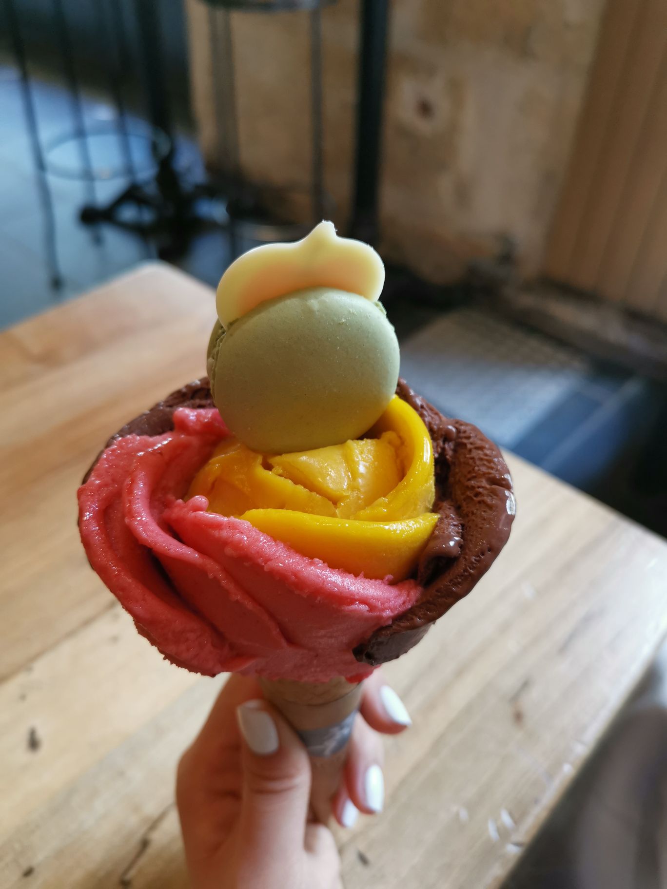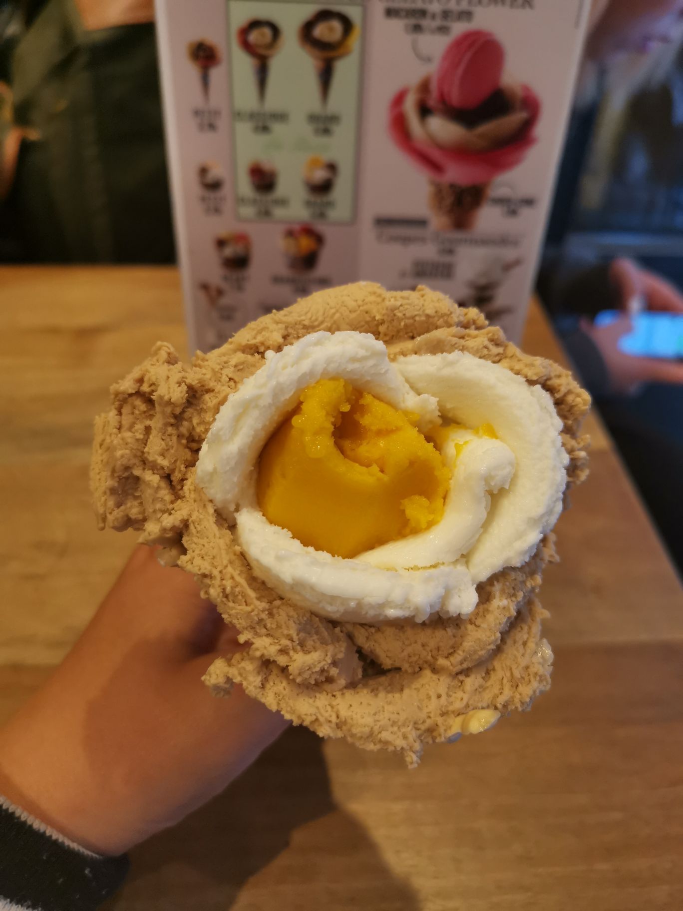小天使在巴黎有很多分店,主打就是把甜筒做成玫瑰花的样子,平均一个中筒冰淇淋的价格是4.8欧,如果选择要带巧克力的脆皮筒,则需要多付一欧,可以额外加马卡龙,也是一欧,挖冰淇淋的服务人员技术不等,我的两朵花是两个服务员弄的,明显第一个不走心