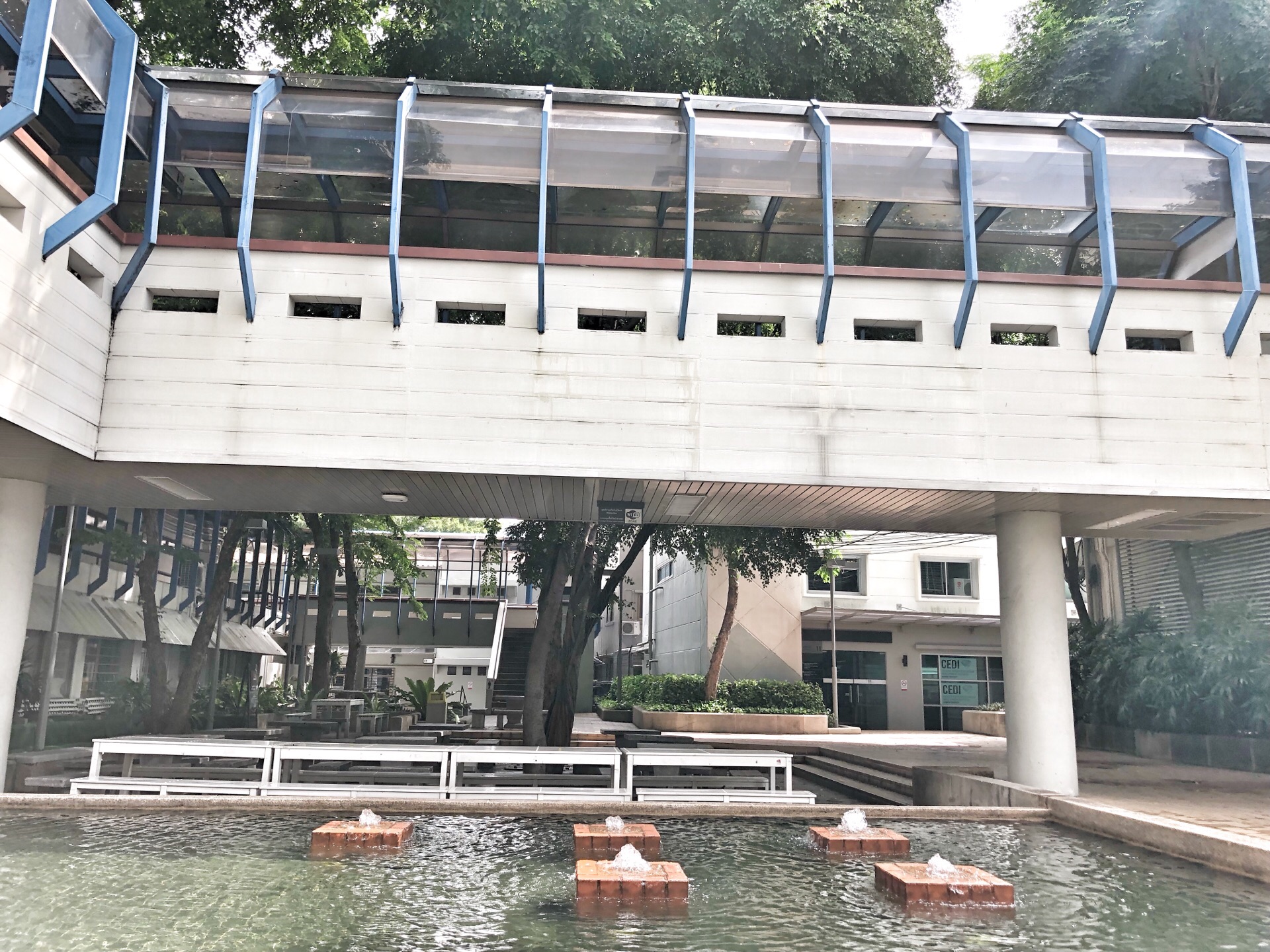 正好路过那就进去逛逛,这次完全就是随意走走,气温还挺高,一会就出汗了。好在大学校园不大,否则要晒成行走的五花肉,不过就算是休息日,来听课的学生也是不少,所以里面到底有个大学食堂还是开放着的,绿色小清新,简约型,基本也没啥特别好吃的。天热就点了一杯pink 的奶昔,颜色是不错,价格是便宜,就是太甜腻了;还有一杯荔枝味道的饮料,偏酸一点,还不错,冰块放得够多,其他还有特色小吃,油炸的比较多,因为刚吃过早饭所以也就不考虑了。 曼谷大学顾名思义建立在泰国曼谷,建校最长,名气最大,规模也最大的私立大学之一。年纪再轻点的话申请一个专业学习学习都很不错啊,哈哈。里面有国际学院大楼、实际操作室、教室、会议室、图书馆、计算机中心、健身房和学生会办公室、排练中心、学生事务处及艺术馆,文化科技中心,招生咨询处、餐厅、咖啡厅及其他服务部门,面积不大,走走大概7-8分钟就可以兜一圈的,不过从本科到博士的研修都有,还是蛮不错的。
