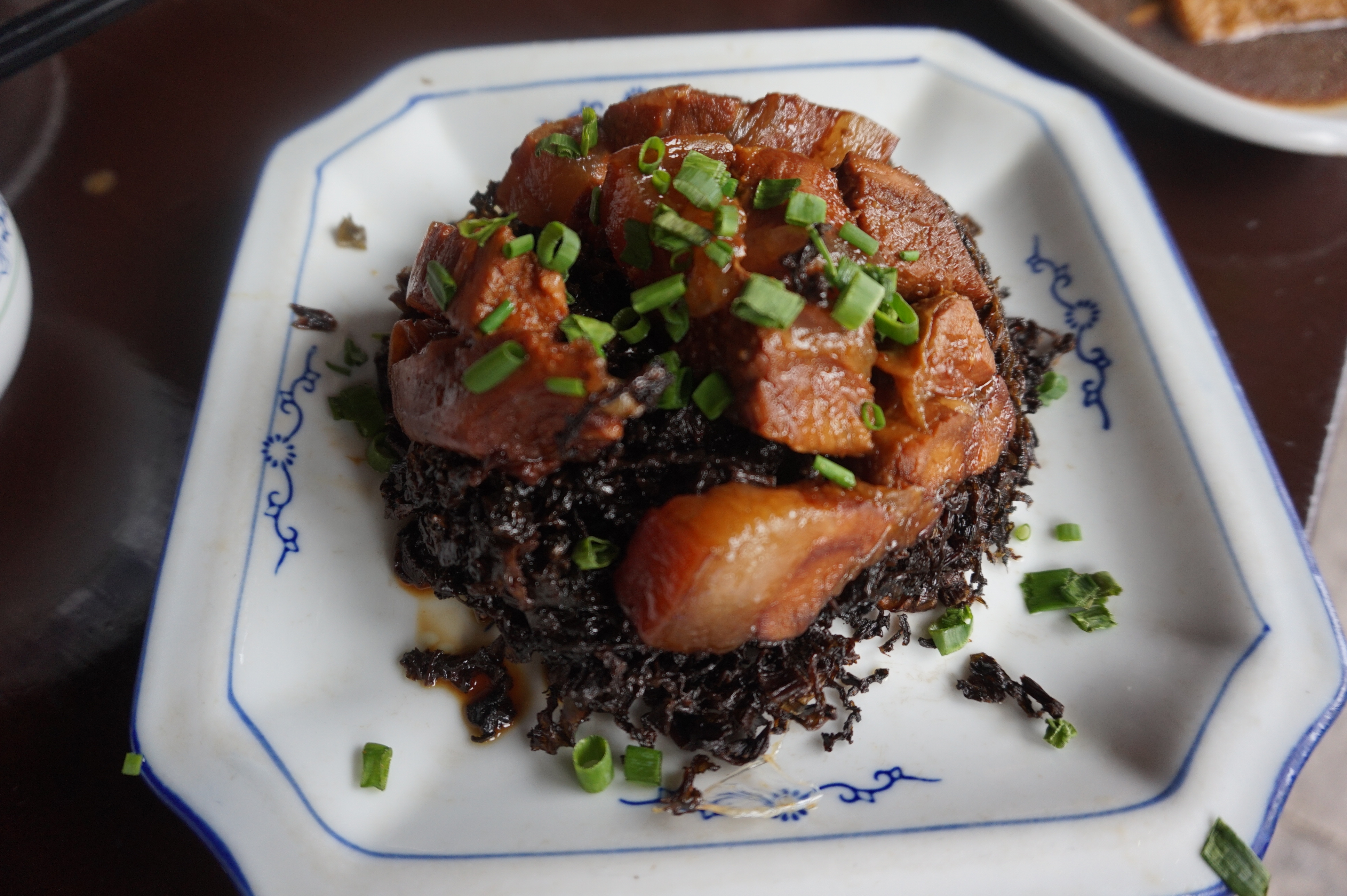 一石居是一家传统绍兴本地家常菜的餐馆,位于鲁迅故里景区新建南路的入口旁,景区内的餐饮店似乎都是座无虚席的,一石居属于景区外,食客的人数还好,至少我们没排队,所以就选择了这家餐馆,来品尝绍兴本地的家常菜。梅菜扣肉虽然是一道广东客家菜,但是梅干菜是绍兴的特产,所以来到绍兴也一定会品尝这里的梅菜扣肉,红烧肉扣在梅干菜的上面,从颜色来看,梅干菜的颜色颇深,可以判断味道是比较咸的,需要和米饭混搭,米饭需要额外收钱,一份2元;红烧肉的颜色正好,我很喜欢红烧肉的肥肉部分,入口即化,一份梅菜扣肉是38元。