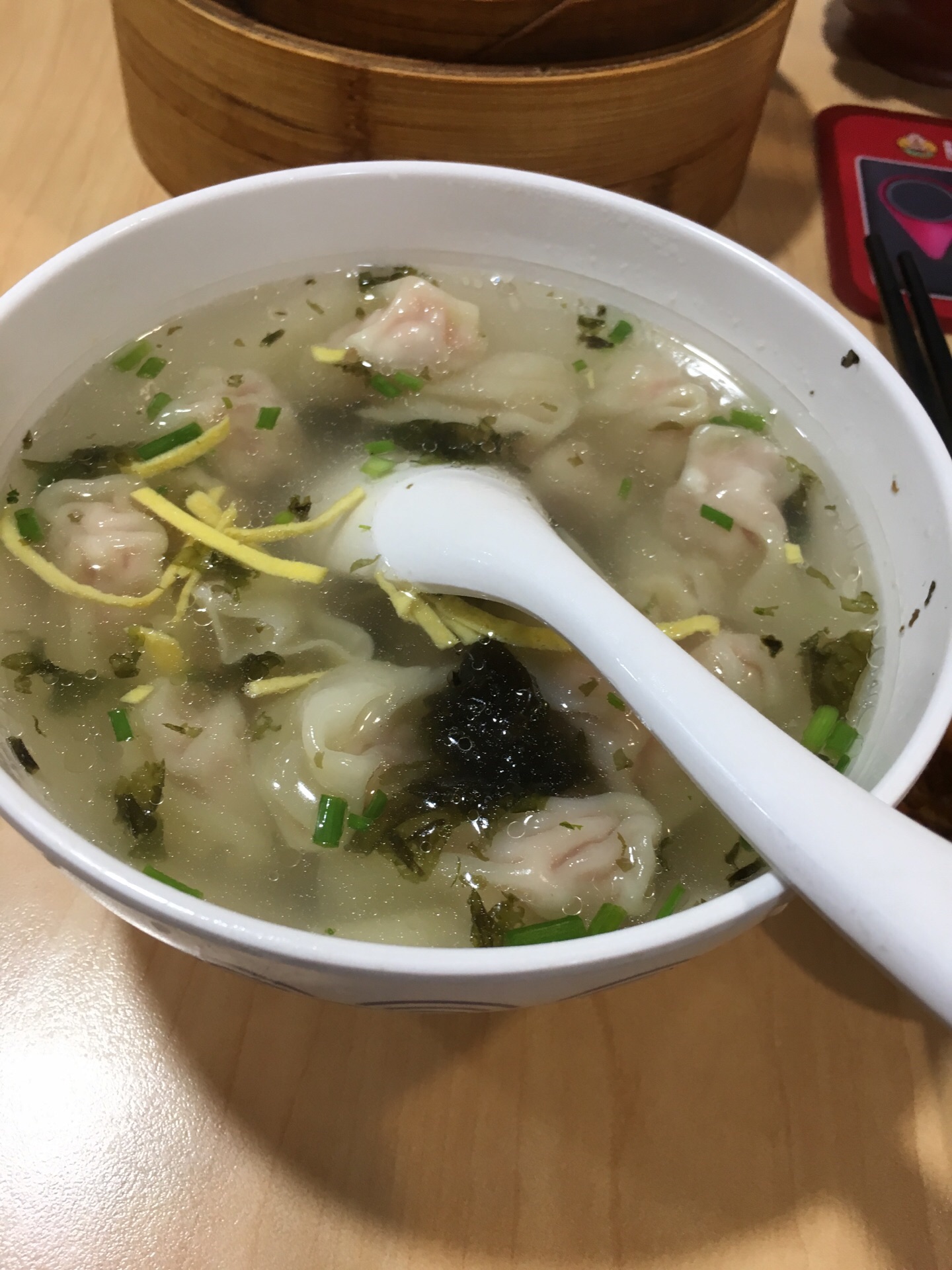 午饭时间人不算多,小笼包子是最好吃的,皮薄肉新鲜,汤汁多多不腻,沾上少许醋,味道好极了,价格也实惠7元;小馄饨就差很多,虽然价格也不贵5元,但是不好吃,看着不错,其实肉一点点,基本就是吃一面团,怪不得看见旁边桌有点小馄饨的都留下一些不吃了。
