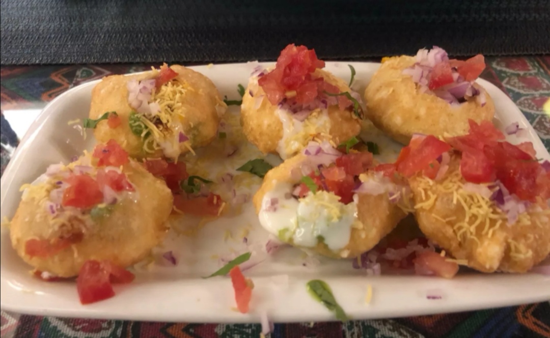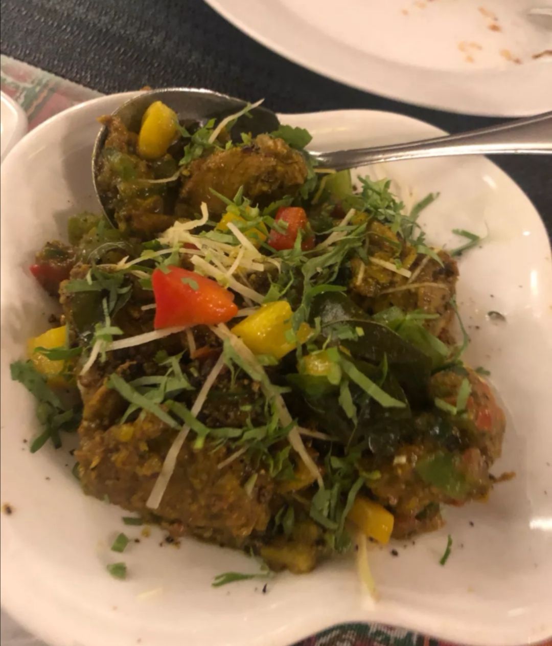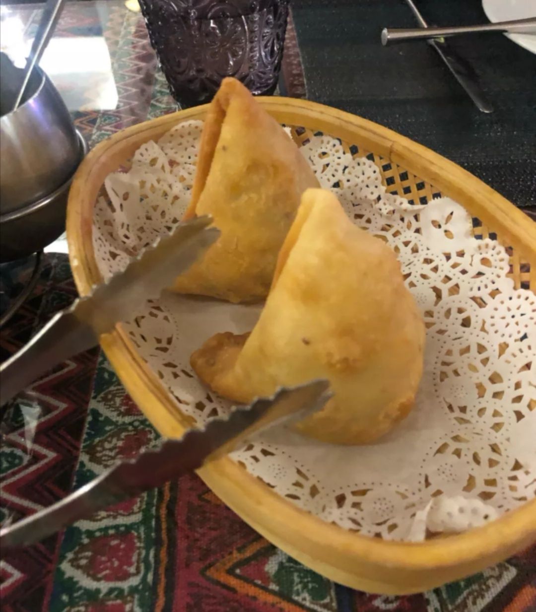 酸奶土豆麦球,很特别的口感,外皮薄脆,里面是酸奶,很清新。要快点吃,放长了酸奶会把外皮给泡软。 杂菜咖喱角,里面包的土豆和豆子,味道还行,蘸他们家的薄荷醬很好吃。 胡椒咖喱羊肉,羊肉煮的很烂,味道还行。
