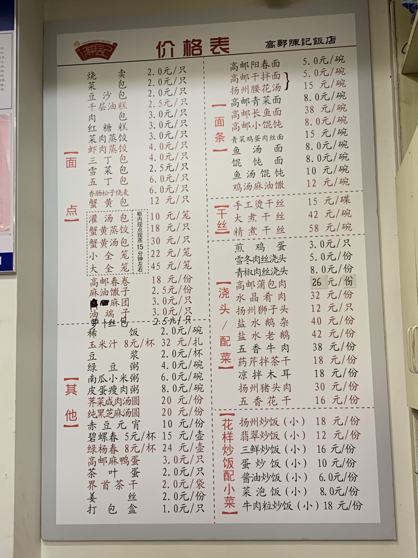 这家高邮陈记饭店曾来过几次,位于凤凰西街上,离北圩路不远。除了各式淮扬点心,还经营中晚餐。这家的口味也一直被称道。可以来试下干拌面+腰花汤的组合,据说是高邮特色。另外包子点心也蛮不错的,比如烧卖是香肠松子馅的,油而不腻,感觉口感蛮丰富的,值得回味。其余象三丁包、油糕、蒸饺的也中规中矩的,另外蟹黄包、红糖糕据说也不错,还不及品尝,留待下次了。