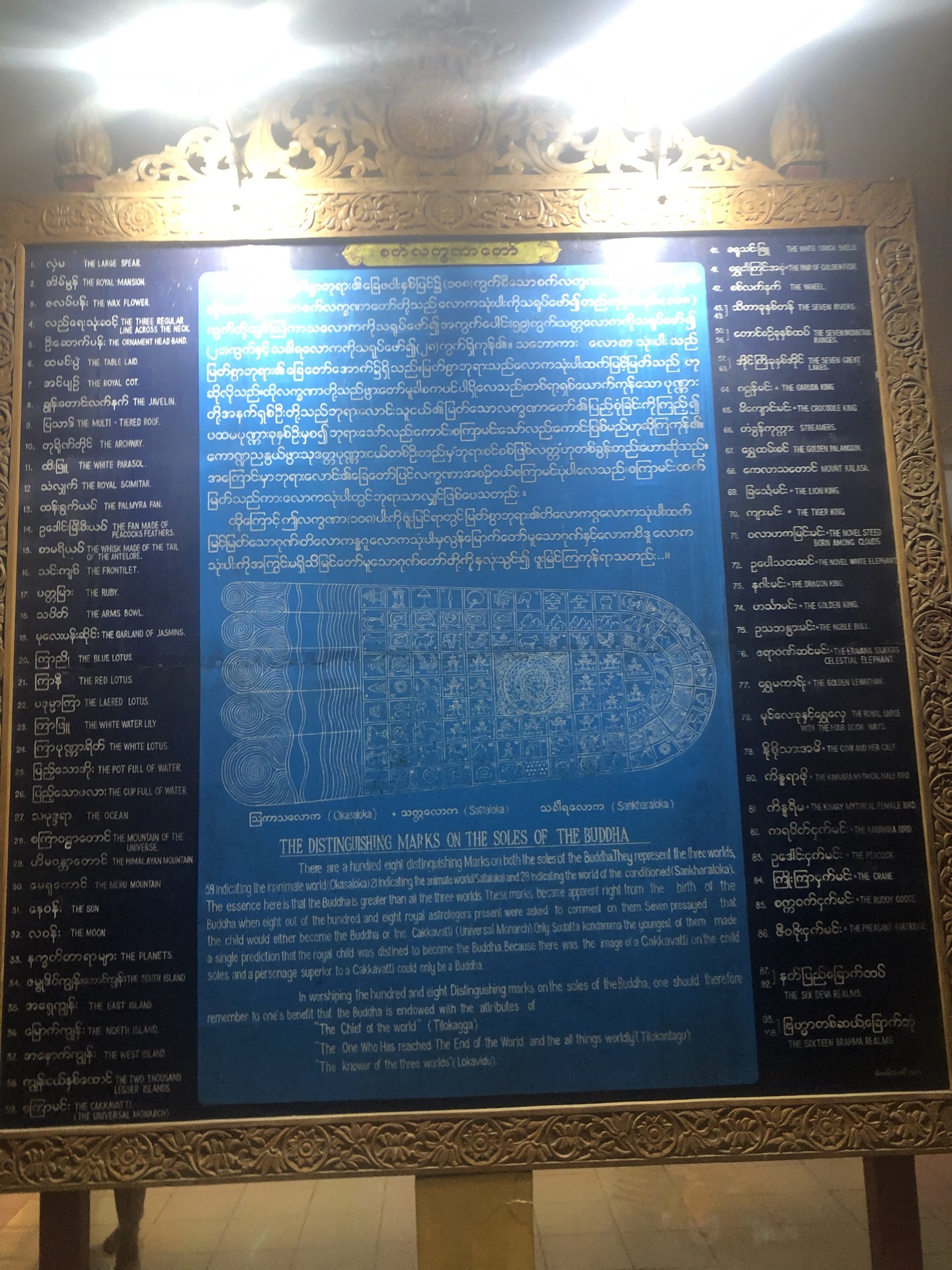 仰光乔达基卧佛是缅甸室内最大的卧佛,长65米,高16米。卧佛的脚底板有108个小格,其中的图像隐喻着人类的108道轮回。