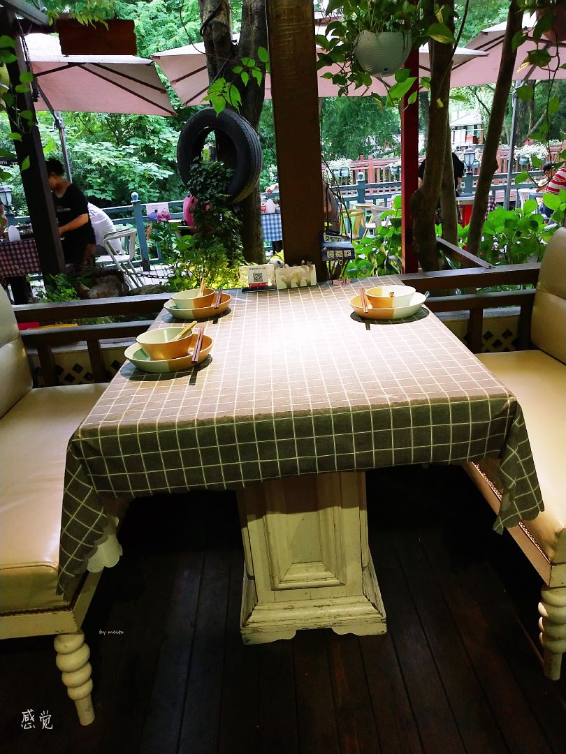 漫步在天堂,沉浸于西溪 西溪且留下,千百年前高宗赵构的话语在耳边萦绕 为何留下? 在乎于那碧水淼淼,鱼儿欢游 在乎于那绿树葱葱,鸟儿幽鸣 在乎于那映入眼帘画般的景致 在乎于那荡涤心灵的恬静淡雅 清风中飘来悠扬抒情的男歌声 那是汝拉小镇餐厅幽静的乐符 小桥流水,仙气环绕,宛若世外桃源 落座小溪边,聆听着自然的声乐,浅饮轻尝,放飞自我 夹起那白嫩的开化清水鱼,细细品味。那特有的鱼香丝丝入鼻,鲜美与火热交融,让你的味蕾偏偏起舞。 色泽亮黄的生煎包,敷上细密的芝麻,小口下去,蜜汁溢嘴,鲜味入喉,甚是满足。 呼的阵阵香气飘来,原来是炭烤羊排来了,滋滋的声响配上肉香,让自己的胃口豁然开朗。 享用着美食,呼吸着清新,脑海里一闪 为何留下? 独美景、美食、美女而已!