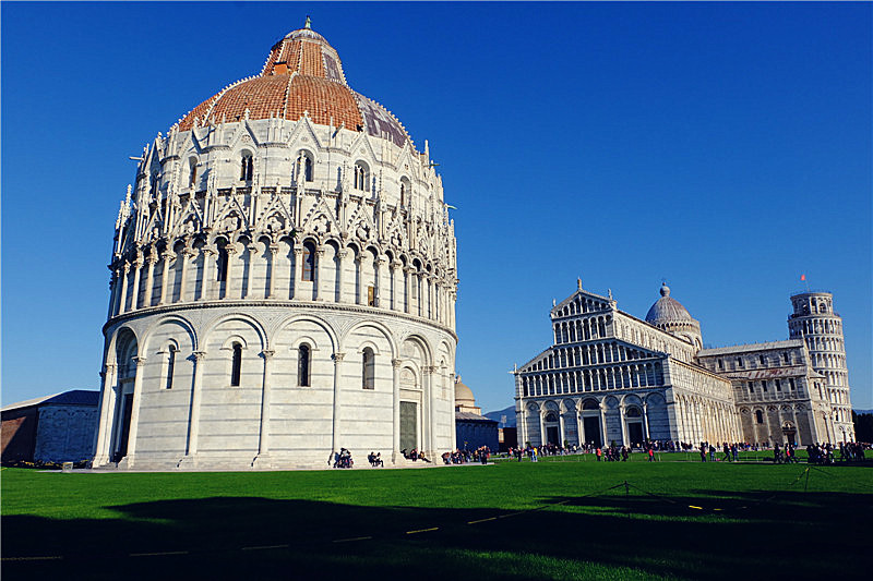 比萨大教堂正面面对圣乔瓦尼洗礼堂,建筑风格和大教堂如出一辙,有趣的是洗礼堂的屋顶一半用红瓦一半用铅铺就。洗礼堂建于1152年,是一座罗马式和哥德式混台风格的建筑,拥有一个直径 35公尺的巨大圆顶,和四座雕刻精美的大门。